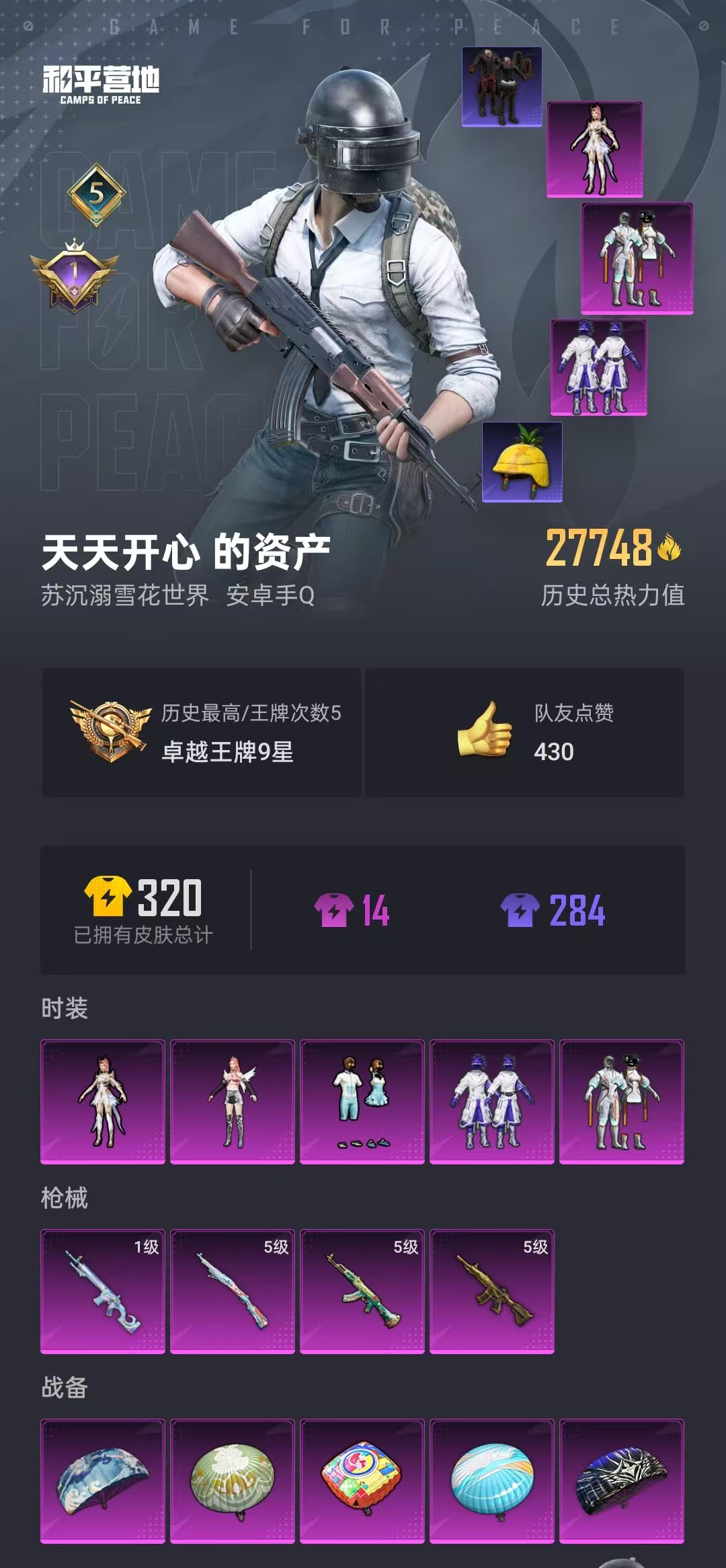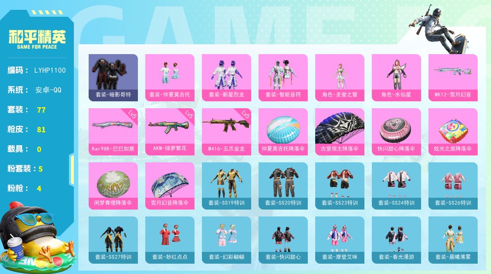 【9616561】【和平精英】【LYHP1100】5粉装,4特效枪,0载具,历史最高段位:卓越王牌9星 王牌印记5次 热力值:27748,77套装,81枪械,99装备,49战备;枪皮:5级AKM-绿萝繁花,AKM-灼热熔岩,AKM-霓虹街区,AKM-龙的传人,M16A4-幻世战舞者,SCAR-L-红色方程式,SCAR-L-甜蜜誓约,SCAR-L-海盐豹豹,5级M416-五爪金龙,M416-蓝色火