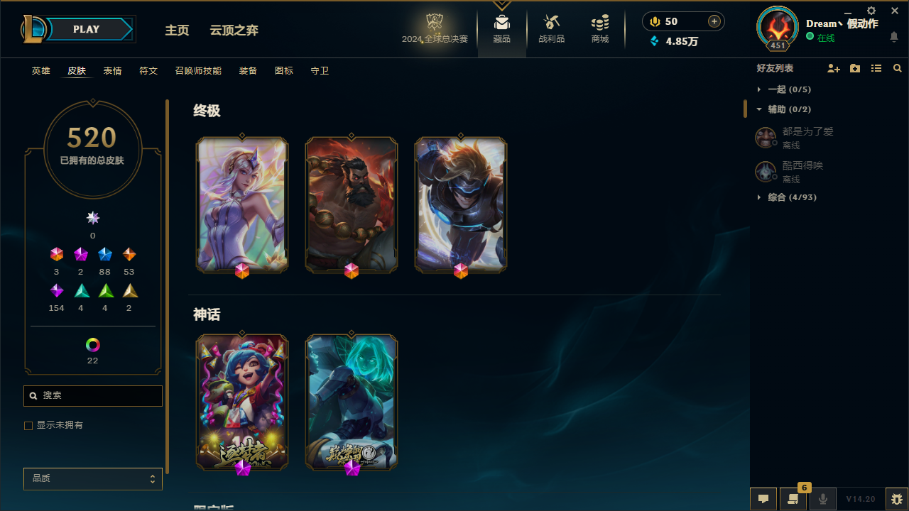 【9699253】QL2820~游戏等级:451 区服信息:皮城警备 英雄数量:167 皮肤数量:520 炫彩数量:26 臻彩数量:2 神话数量:2 云顶神话数量:0 游戏点卷:50 神话精粹:88 蓝色精萃:48597 橙色精粹:573 钥匙:0 宝箱:48 【重要头像】 【重要皮肤】胜利之王泰达米尔 哥特萝莉安妮 舞会公主安妮 奥斯曼大帝泰达米尔 勇敢的心德莱厄斯 龙的传人李青 银龙裁决泰隆
