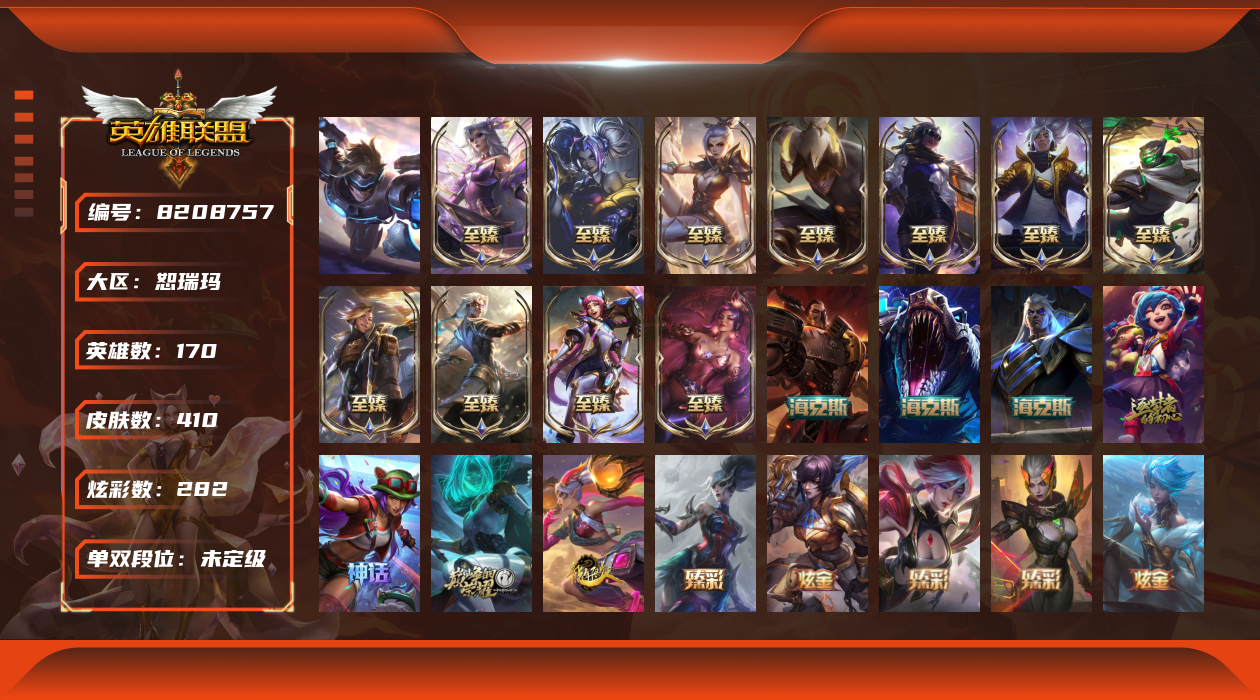 [8208757]【保证金商户】【编号91793】【410皮肤-19至臻-5海克斯-28神话-1终极-78限定-51传说-170英雄-段位:未定级】 未来战士 伊泽瑞尔 海克斯科技雷克顿 海克斯科技 斯维因恐惧新星 德莱厄斯零之枪骑 赫卡里姆 摄魂使者 薇恩 神凰行者 瑞羽圣凰 艾尼维亚十五周年纪念 希维尔十周年纪念 安妮源代码 乐芙兰至臻 褔牛守护者...