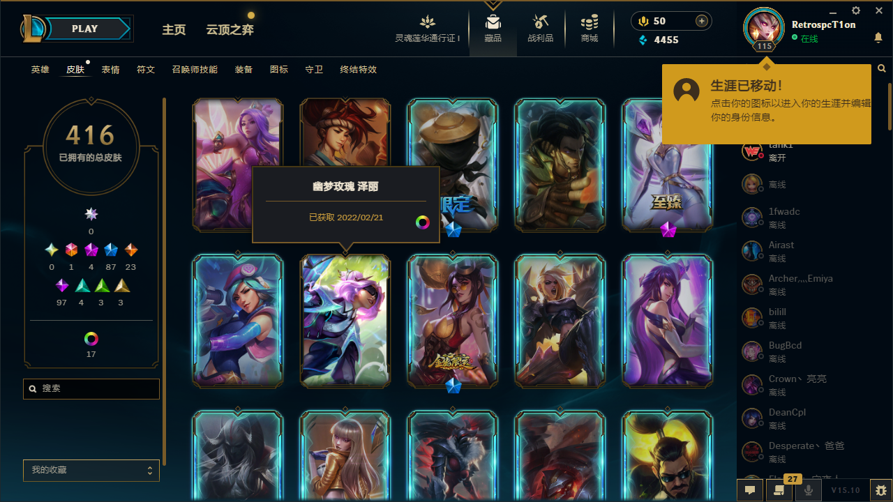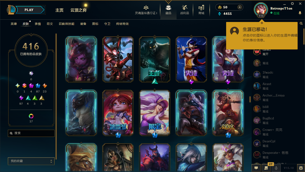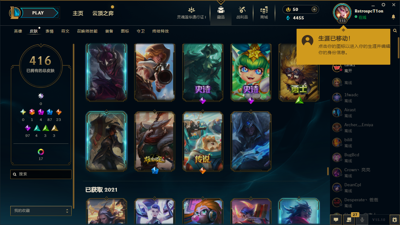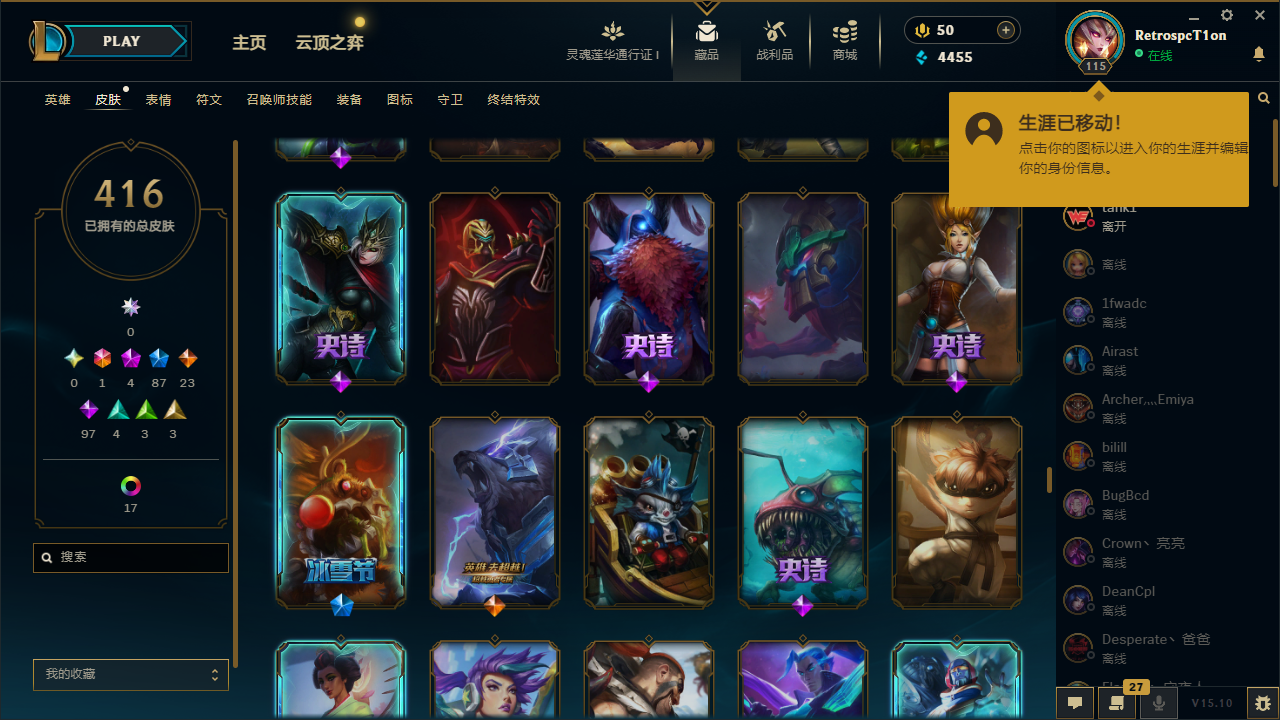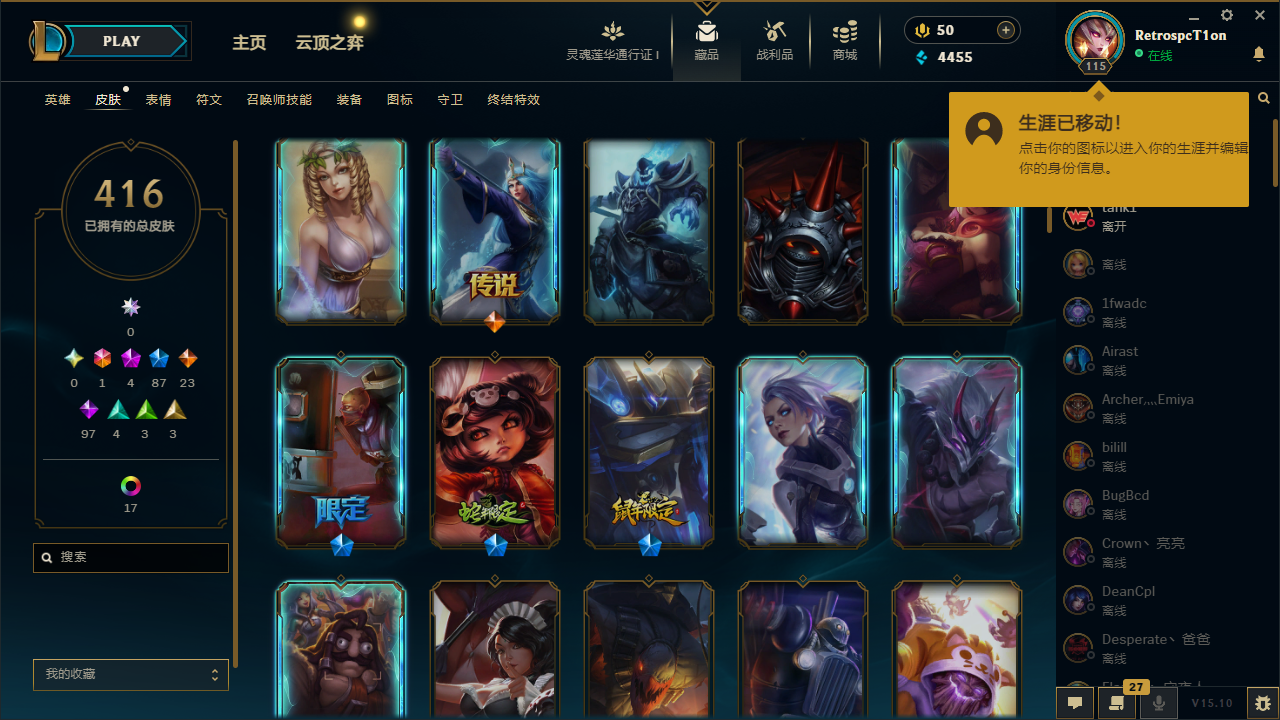 【9835601】[8248048]可二次 可修改实名 1终极 4神话 3臻彩 87限定 23传说 97史诗 416皮肤 53炫彩 159英雄 皮肤:舰队司令 烈娜塔,太空律动 “百万调音” 格温,灵魂莲华 莉莉娅,龙腾虎跃 瑟提,福牛守护者 厄斐琉斯,黑夜使者 厄斐琉斯,弗雷尔卓德 塞拉斯,SSG 霞,永恒之森 巴德,黑暗骑士 卡莉丝塔,腥红之月 卡莉丝塔,虚空使者 俄洛伊,未来战士 锤石,