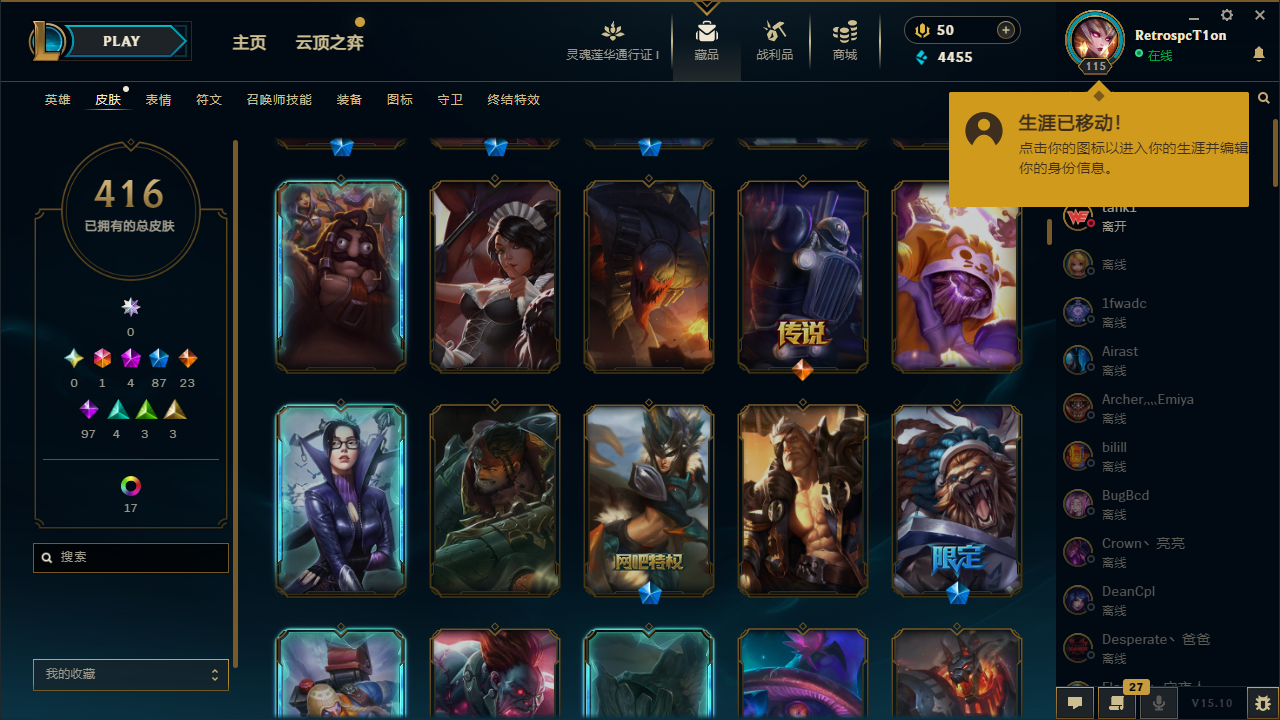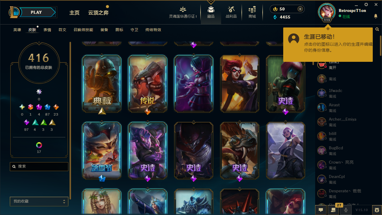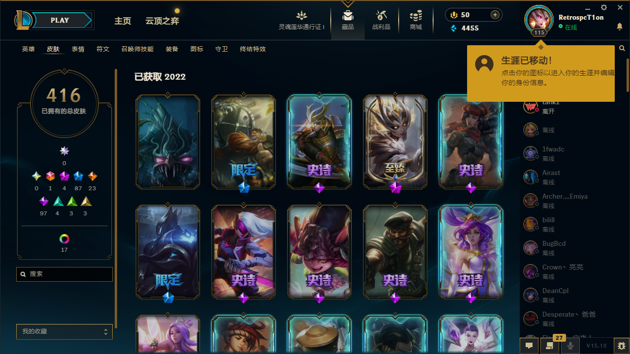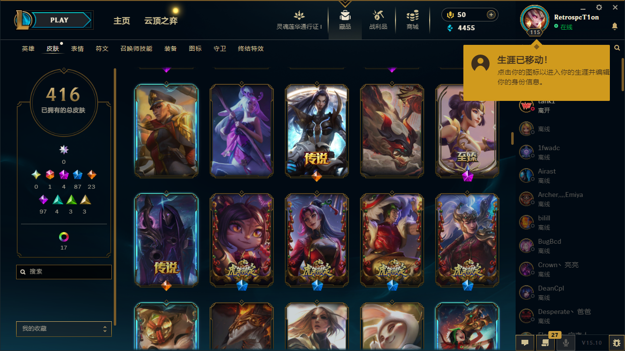 【9835601】[8248048]可二次 可修改实名 1终极 4神话 3臻彩 87限定 23传说 97史诗 416皮肤 53炫彩 159英雄 皮肤:舰队司令 烈娜塔,太空律动 “百万调音” 格温,灵魂莲华 莉莉娅,龙腾虎跃 瑟提,福牛守护者 厄斐琉斯,黑夜使者 厄斐琉斯,弗雷尔卓德 塞拉斯,SSG 霞,永恒之森 巴德,黑暗骑士 卡莉丝塔,腥红之月 卡莉丝塔,虚空使者 俄洛伊,未来战士 锤石,