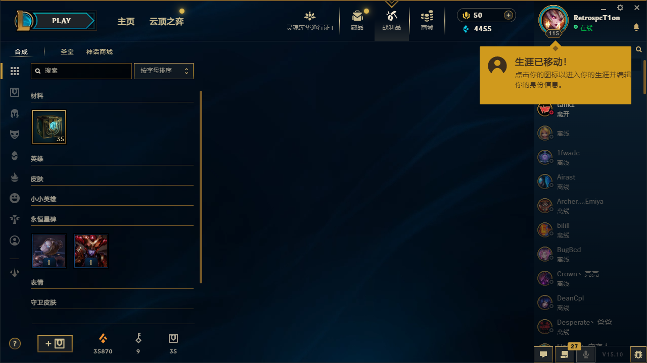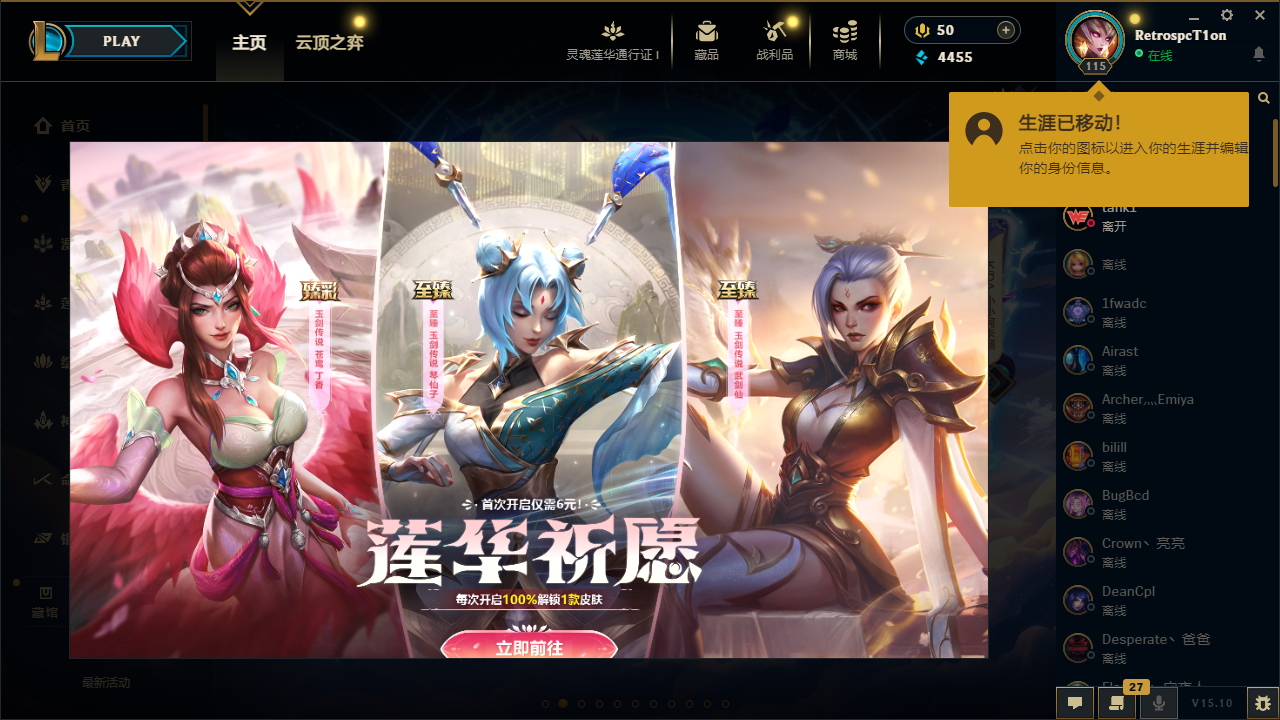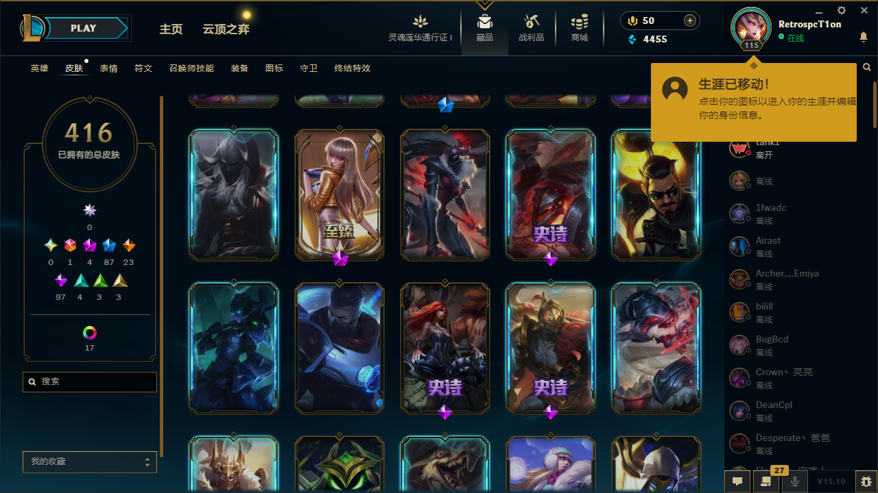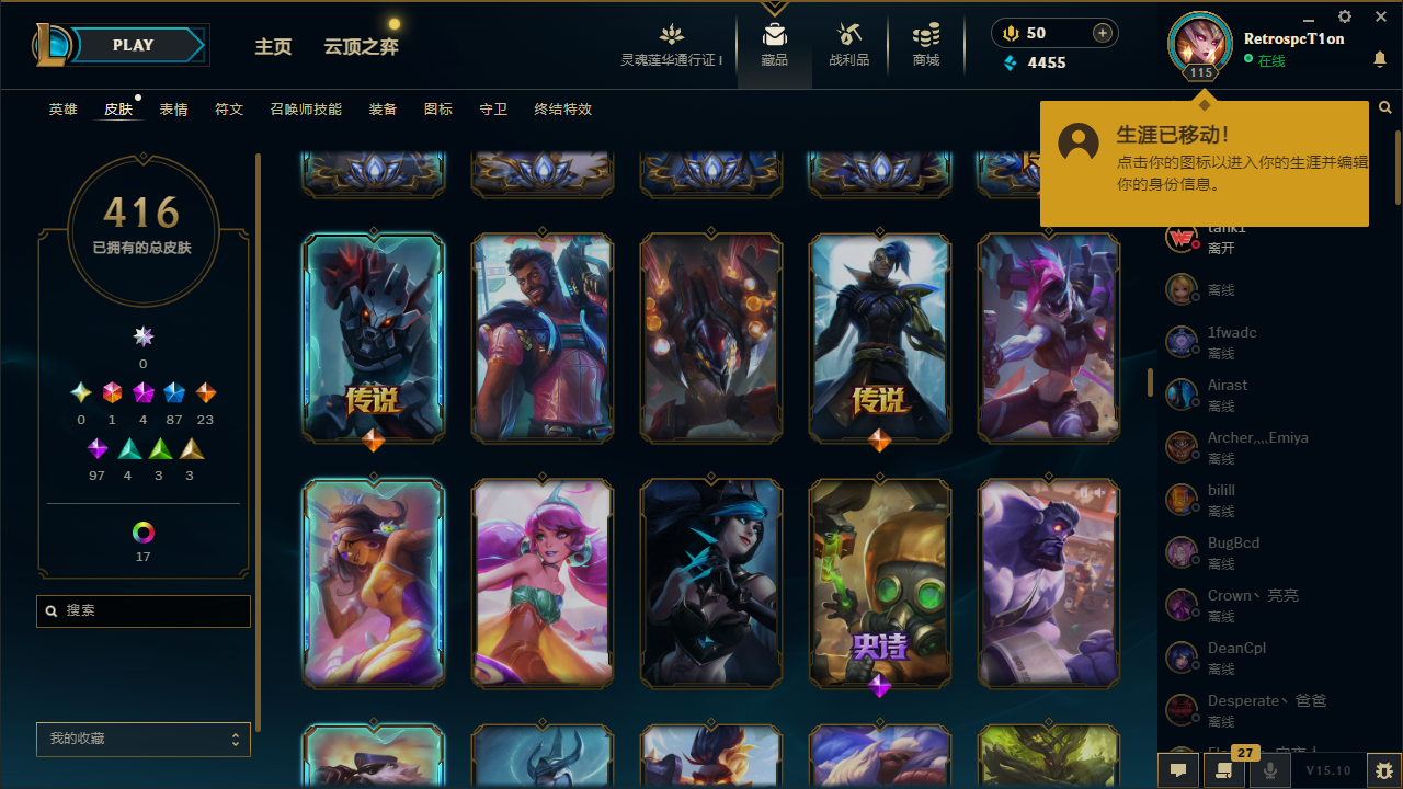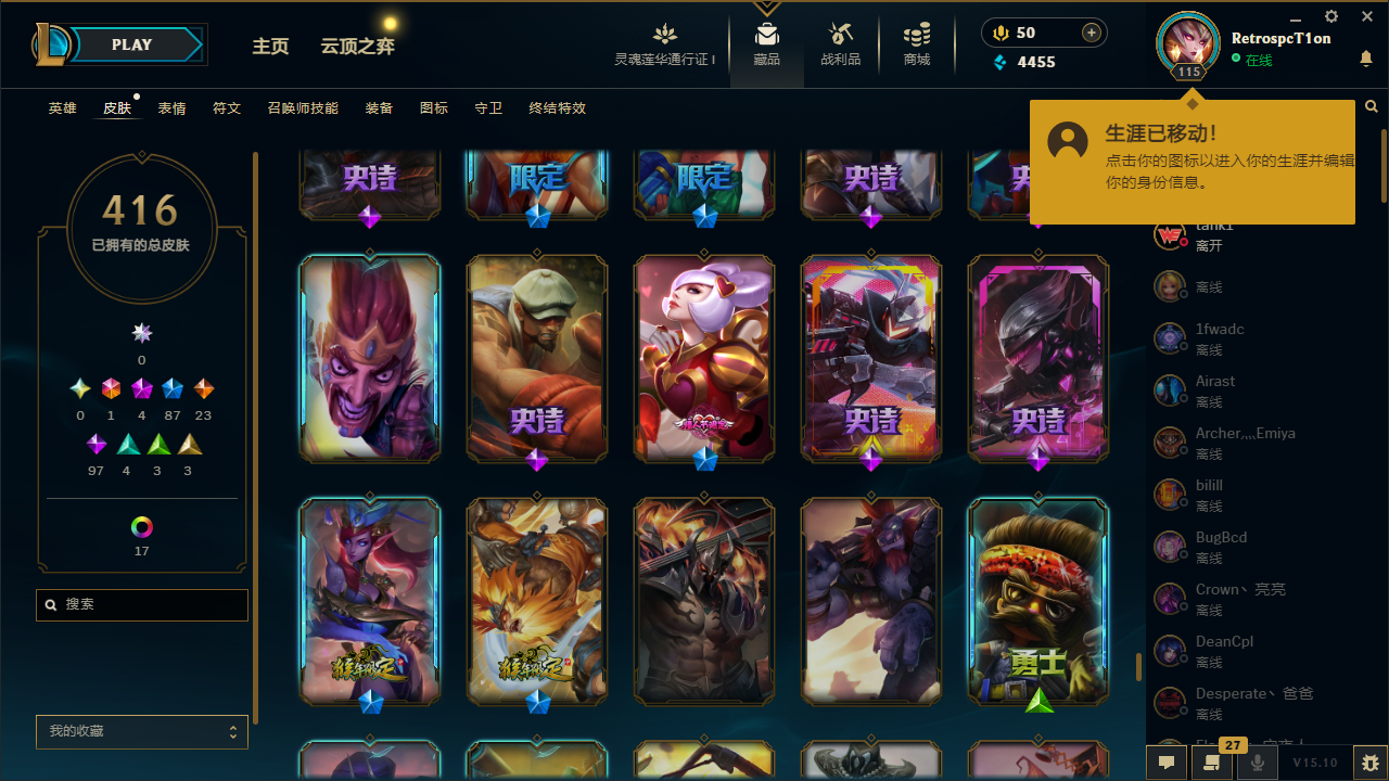 【9835601】[8248048]可二次 可修改实名 1终极 4神话 3臻彩 87限定 23传说 97史诗 416皮肤 53炫彩 159英雄 皮肤:舰队司令 烈娜塔,太空律动 “百万调音” 格温,灵魂莲华 莉莉娅,龙腾虎跃 瑟提,福牛守护者 厄斐琉斯,黑夜使者 厄斐琉斯,弗雷尔卓德 塞拉斯,SSG 霞,永恒之森 巴德,黑暗骑士 卡莉丝塔,腥红之月 卡莉丝塔,虚空使者 俄洛伊,未来战士 锤石,