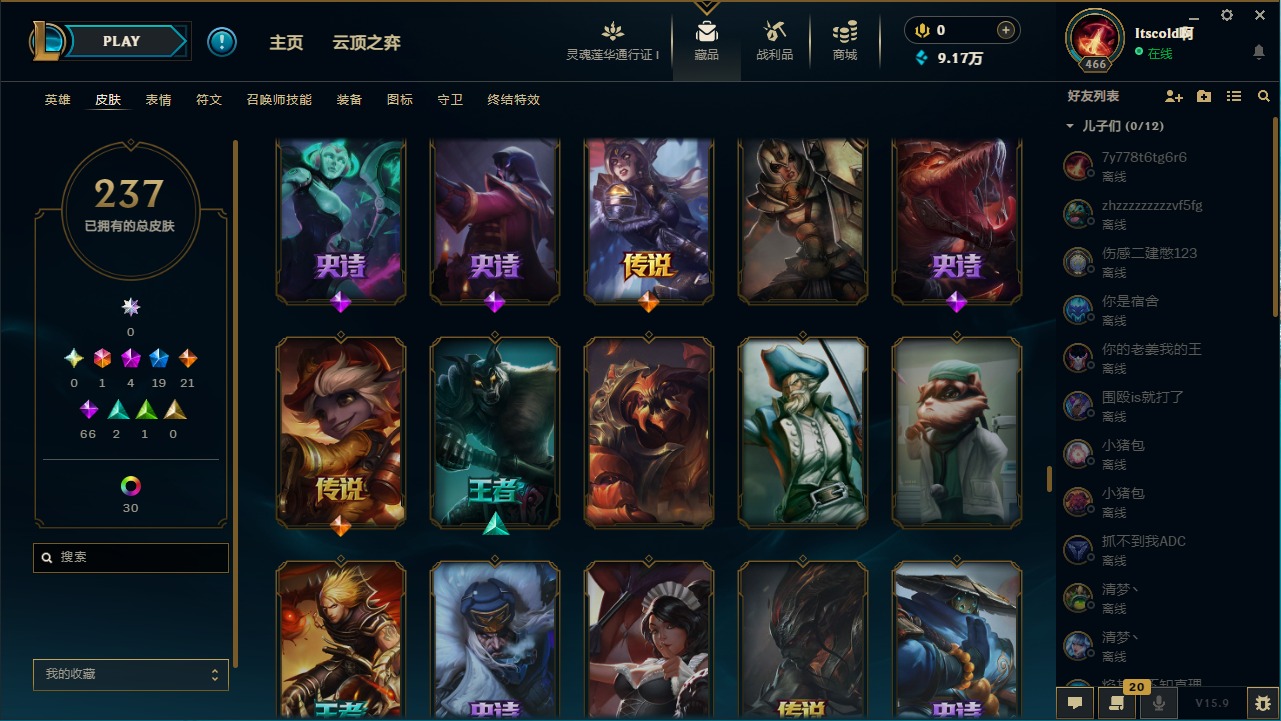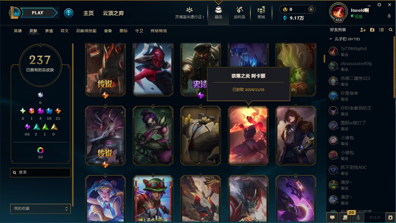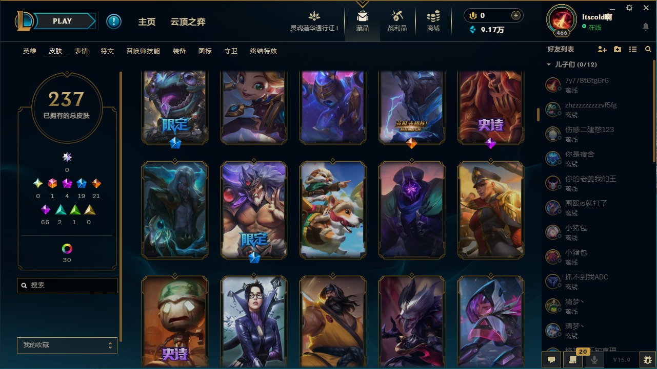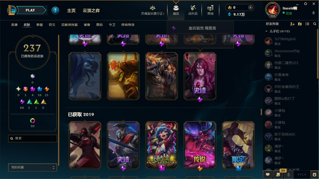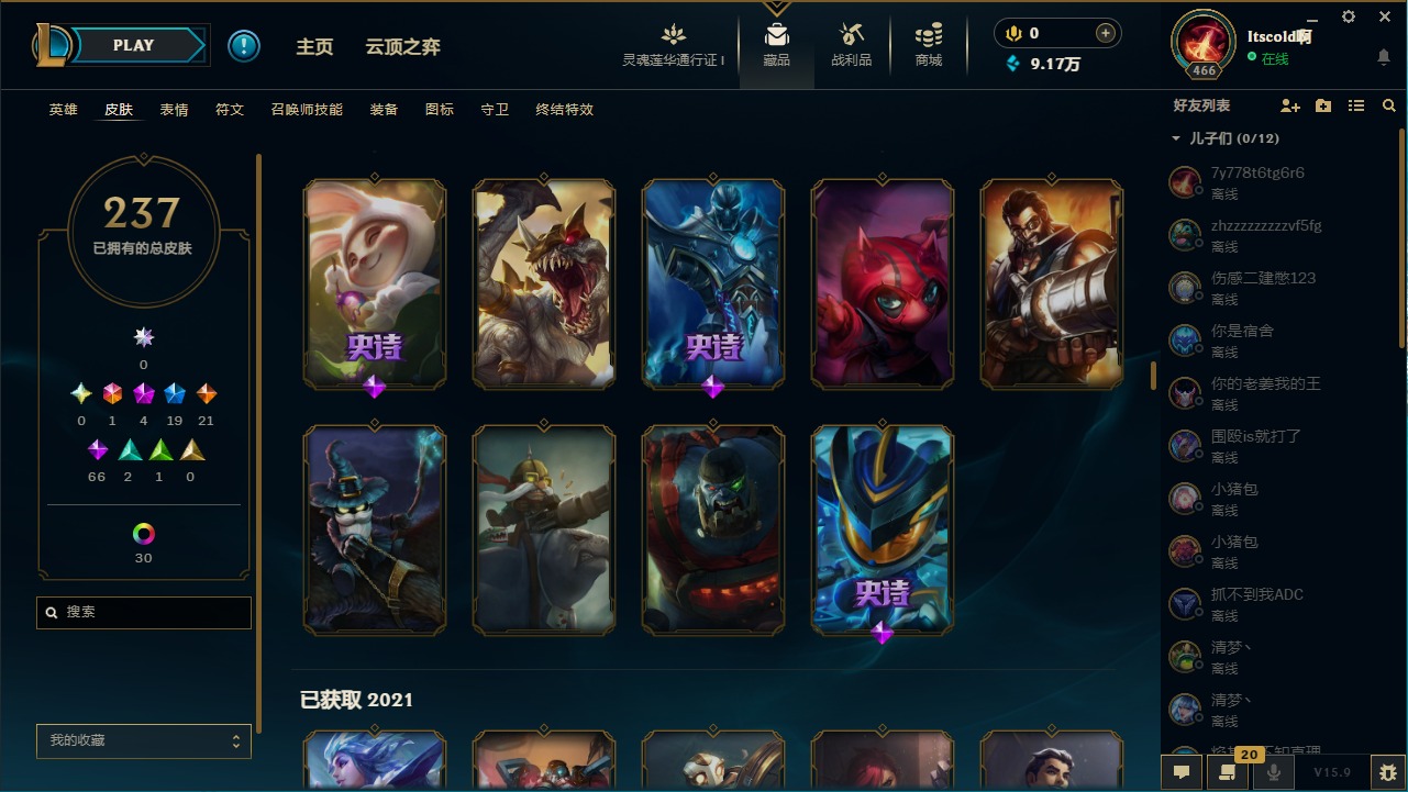 【9836100】[8249952]1终极 4神话 3臻彩 18限定 21传说 66史诗 237皮肤 40炫彩 170英雄 黄金 皮肤:天龙之子 斯莫德,舰队司令 烈娜塔,战斗学院 永恩,糖果之王 艾翁,上古战魂 雷克塞,西部魔影 锤石,深渊恐惧 锤石,魔女 娜美,源代码 娜美,霸天剑魔 亚托克斯,双城之战 蔚,冲击之刃 劫,银河魔装机神 千珏,布隆·狮心,荣誉使者 阿克尚,弗雷尔卓德 塔莉垭,