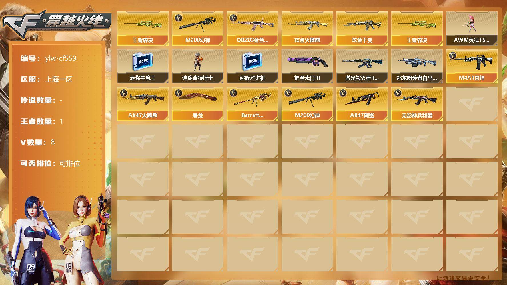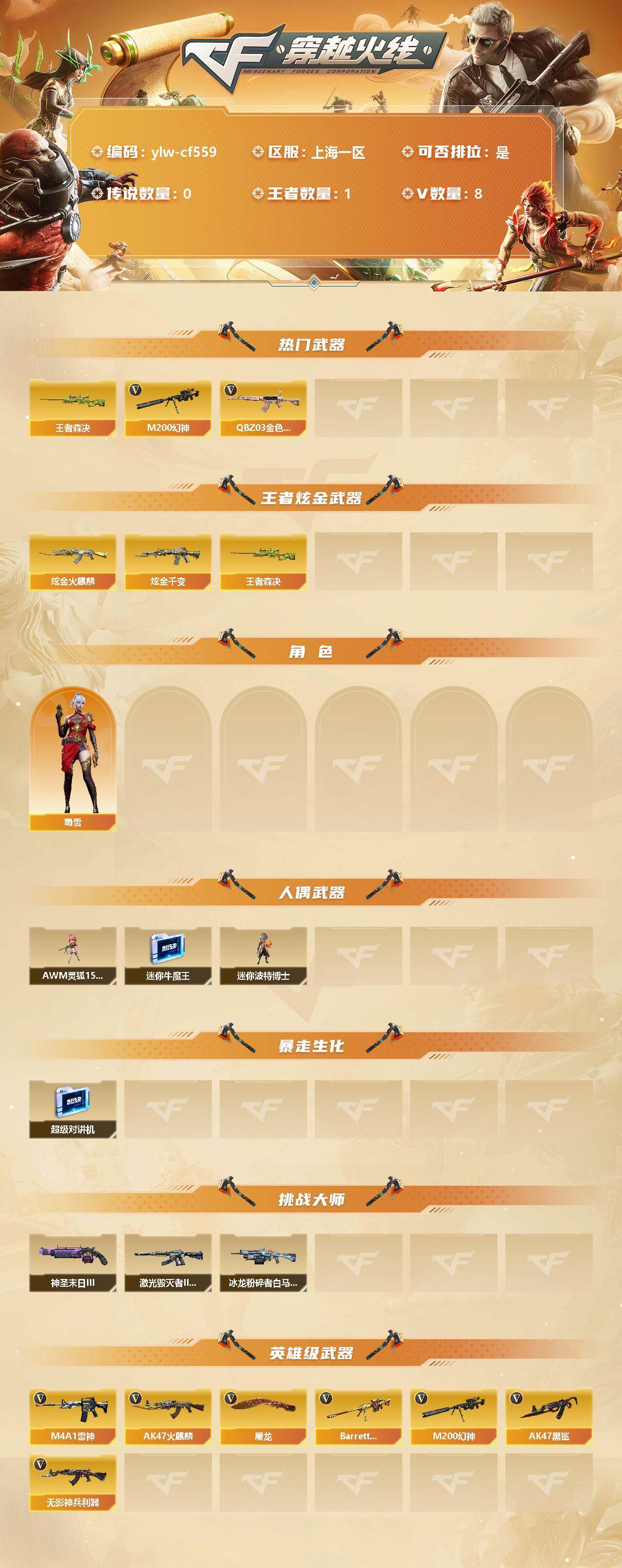 【9837807】【9837807】【商品标题】:上海一区-8V-1王者-2炫金【热门武器】:王者森决,QBZ03-金色蔷薇,M200-幻神【王者炫金武器】: