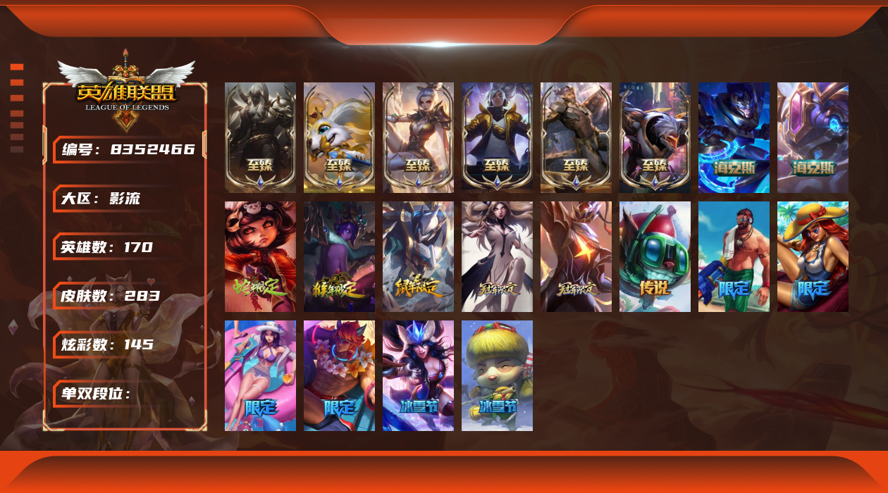 【9849264】[8352466]【gpz_946209】 t21353【影流】283皮肤 145炫彩 9臻彩 12神话/30限定/28传说/170英雄 账号等级:660 单双排段位:英勇黄铜【重要头像】我麦是开的么 泳池派对凯特琳 不错哦 【重要皮肤】真实伤害亚索至臻 源计划逆流塞拉斯至臻 源计划阴劫至臻 绒毛菲兹至臻 玉剑传说武剑仙至臻 腥红之月亚托克斯至臻 海克斯科技
