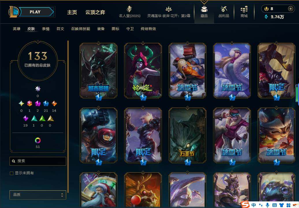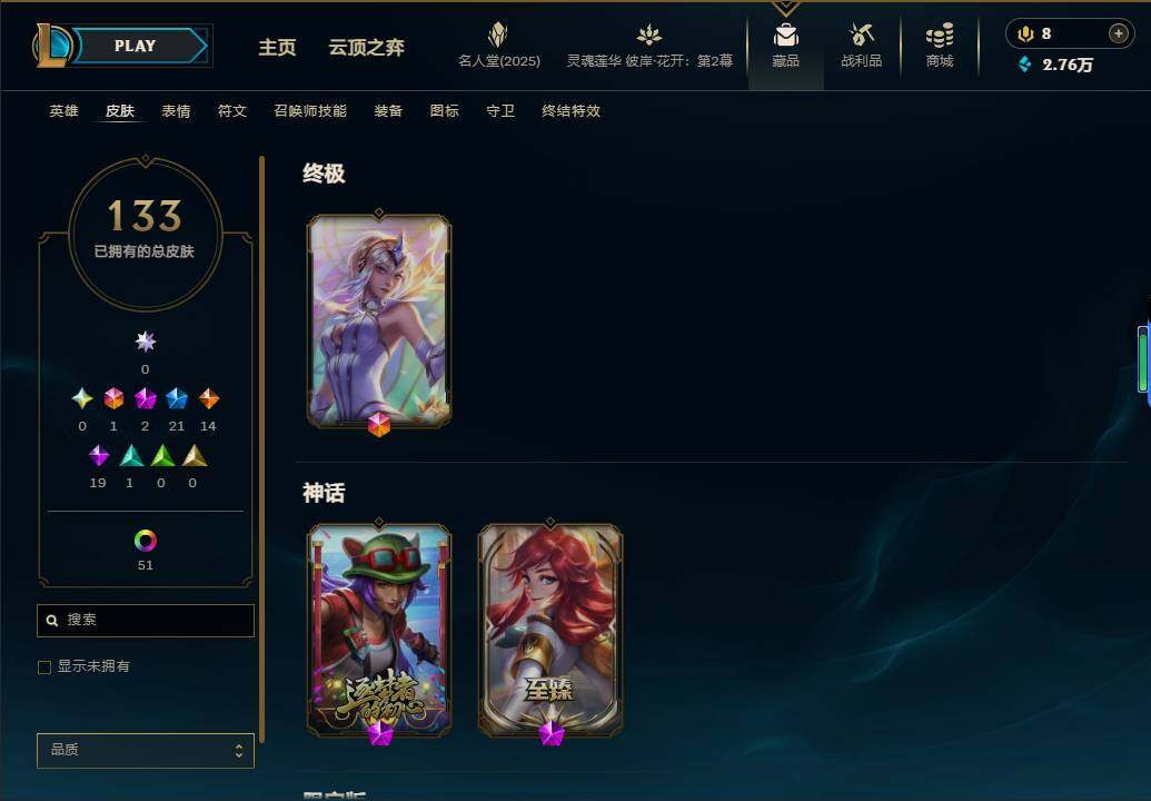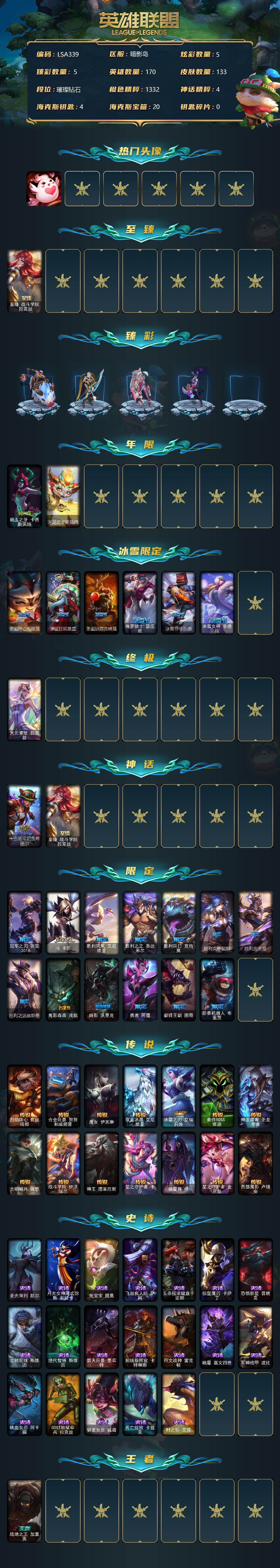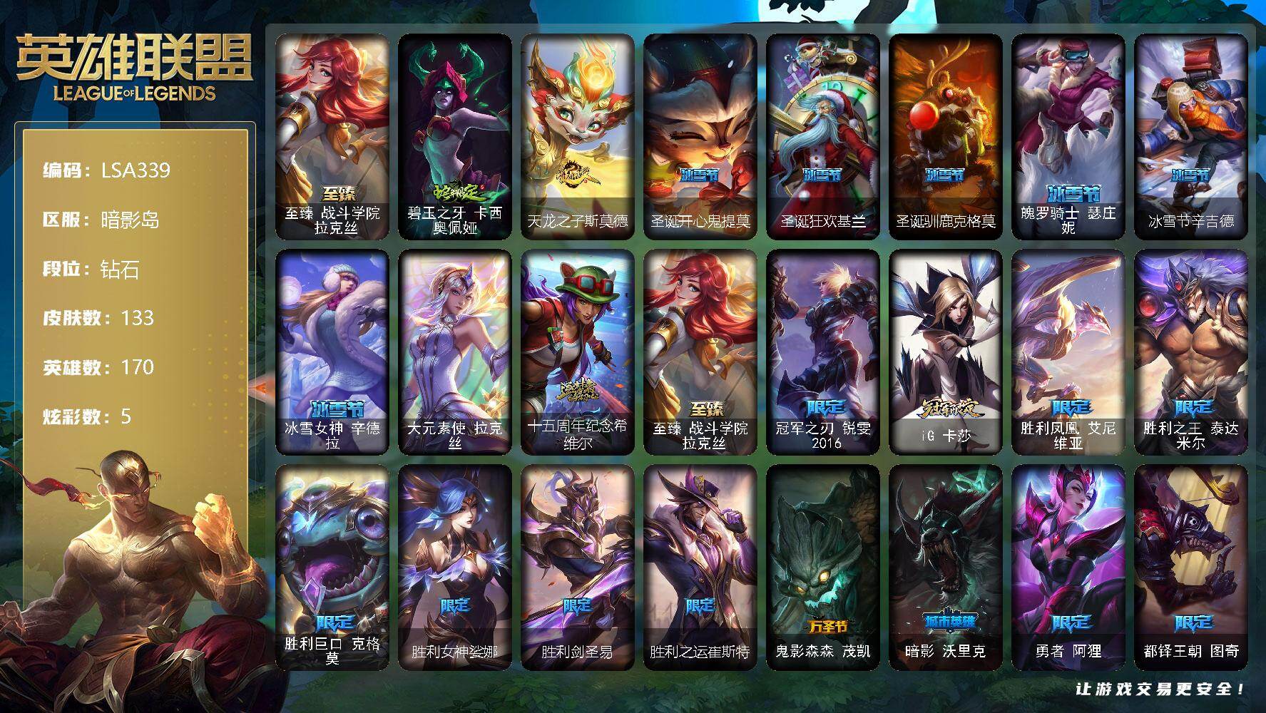 【10199603】【LSA339】170英雄/133皮肤/1终极/2神话/21限定/5臻彩/5炫彩/14传说/19史诗/钻石账号等级:346/爱情鸽/至臻战斗学院拉克丝/无畏骑士瑟庄妮赤子初心/冠军之箭艾希凯旋圣装/幻灵战斗猫金克丝梦幻强袭/星之守护者金克丝黑洞/魔女阿卡丽虚荣/碧玉之牙卡西奥佩娅/天龙之子斯莫德/圣诞开心鬼提莫/圣诞狂欢基兰/圣诞驯鹿克格莫/魄罗骑士瑟庄妮/冰雪节辛吉德/冰雪