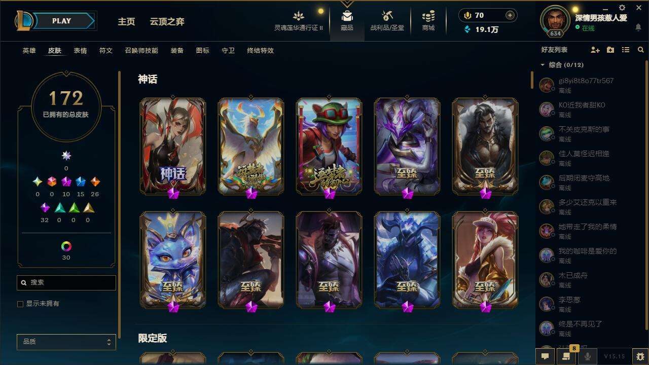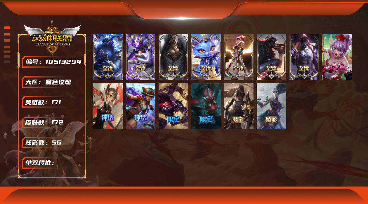 【10468358】[10513294]【gpz_953222】 t24656【黑色玫瑰】 172皮肤 56炫彩 4臻彩 10神话/15限定/26传说/171英雄 账号等级:634 单双排段位:璀璨钻石【重要头像】云顶战斗学院伊泽瑞尔 觅心之翼奎因 此志无双羽饰骑士 【重要皮肤】狼神英灵斯维因至臻 人工智能悠米至臻 斗魂觉醒萨科至臻 DRX亚托克斯至臻 至高天奎桑提至臻 西部魔