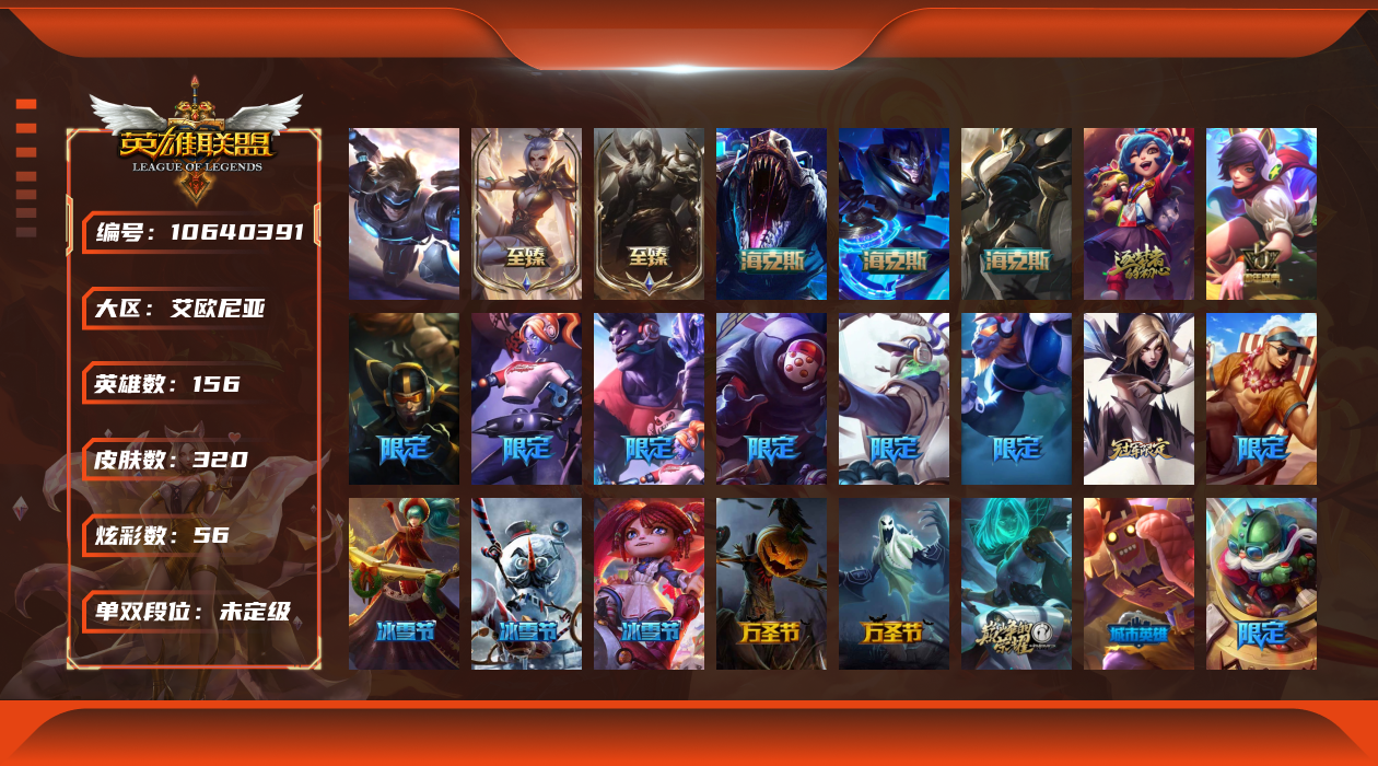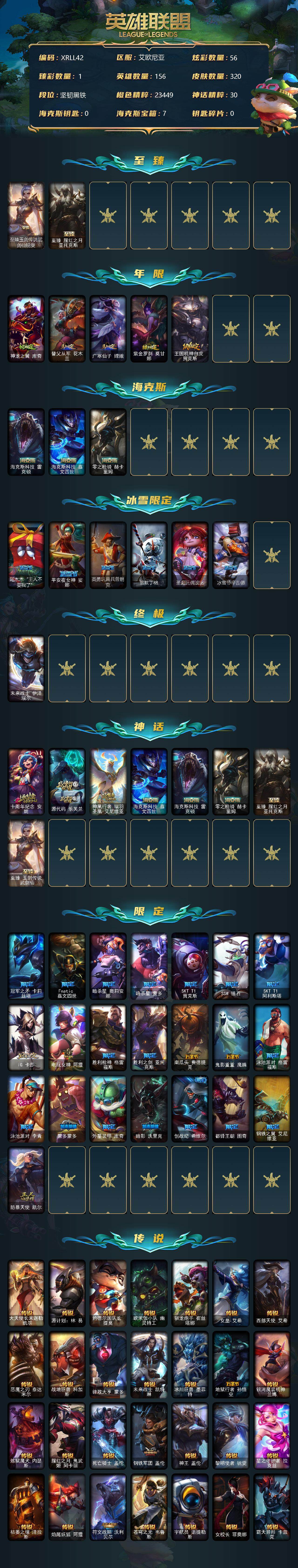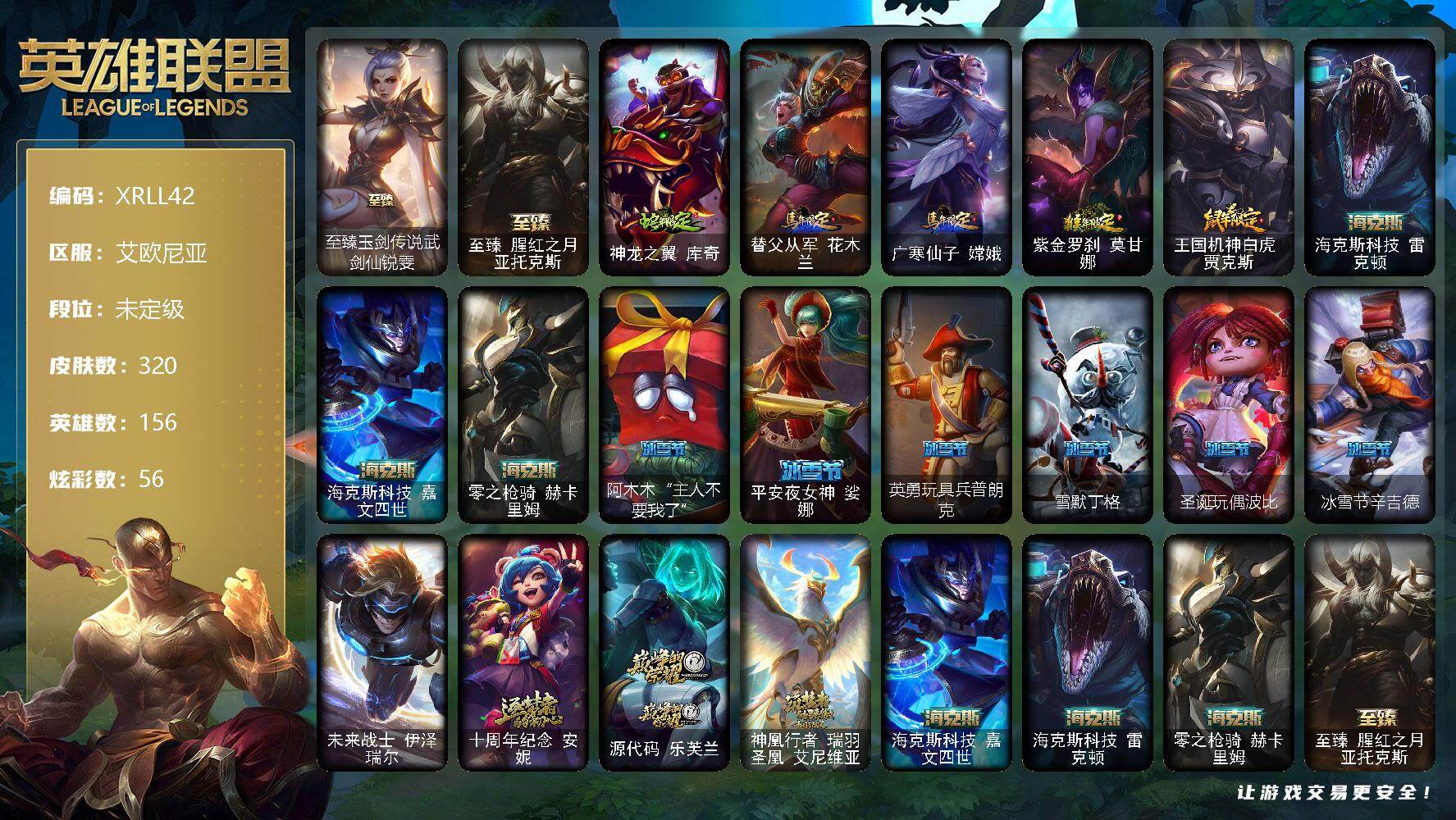 【10499740】[10640391]Xr40517-QQ-未定级段位-156英雄-320皮肤-56炫彩-1终极-8神话-33限定-32传说-84史诗【至臻皮肤】:至臻玉剑传说武剑仙锐雯,至臻腥红之月亚托克斯【臻彩皮肤】:红莲之刃锐雯【年限皮肤】:神龙之翼库奇,替父从军花木兰,广寒仙子嫦娥,紫金罗刹莫甘娜,王国机神白虎贾克斯【海克斯皮肤】:海克斯科技雷克顿,海克斯科技嘉文四世,零之枪骑赫卡里姆