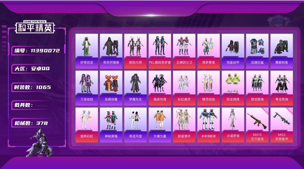 【10653629】【可二次】【安卓QQ】恐龙拽拽 大橘为重 MG3-突变脉冲 M416-五爪金龙 王牌四分卫 迅捷狂鲨 奇异狩猎者 绮梦青鸾 彩虹鹿灵 银龙傲海 精灵娃娃 暗夜玫瑰 PEL轰鸣竞梦者 数码大师 神秘黑猫 骨龙祭渊