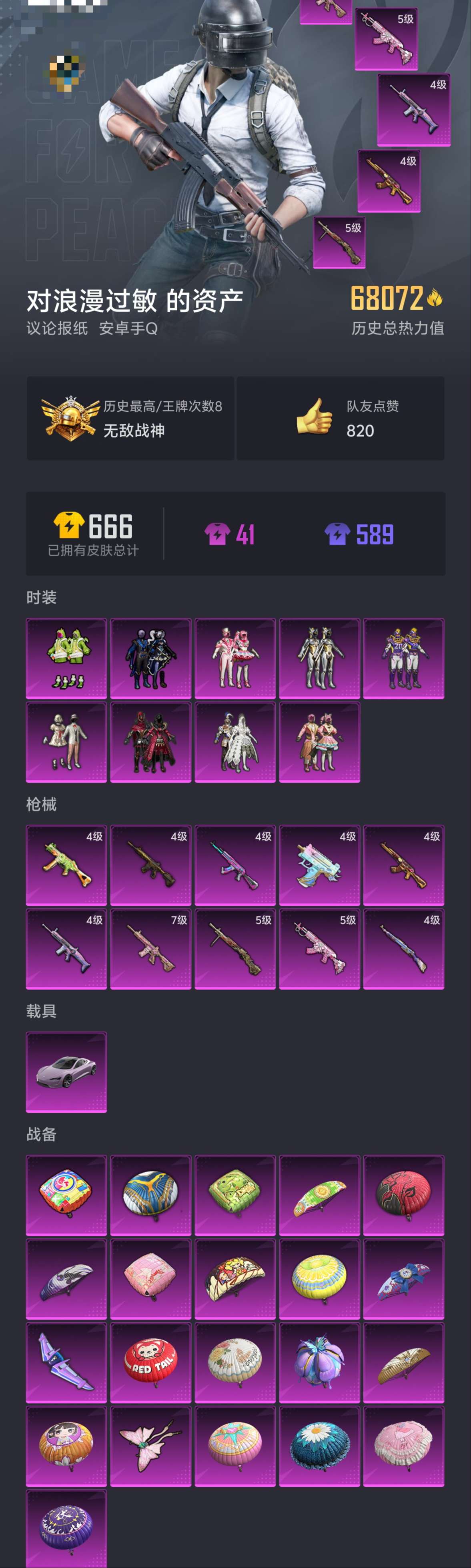 【身法号/战神框/小丑鱼/9粉装/10特效枪/1载具】安卓手Q-8王牌印记-有战神框-9粉装-10特效枪-1载具-68072热力值-124套装-195枪皮 【9粉装】,宝贝奶油派,绚金战神,恐龙拽拽,草莓生巧,暗夜玫瑰,王牌四分卫,馨动时刻,冰霜白皇,炙焰红王 【10特效枪】AKM-甜心宝贝-4级 AKM-炫紫旋律-4级 SCAR-L-梦幻火箭-4级 M416-...