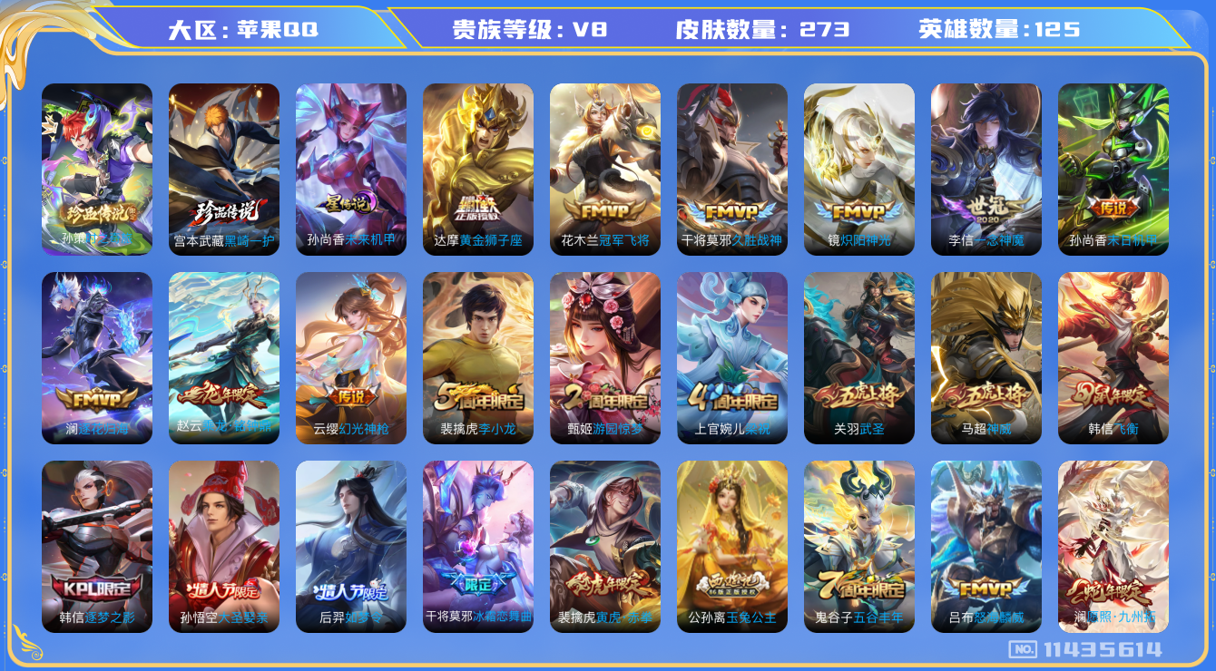 [11435614]【金标孙尚香 金标杨玉环】: 可修改 贵族等级: V8 英雄数: 125 皮肤数: 273 珍品传说: 时之奇旅-孙策,黑崎一护 星传说: 未来机甲 传说皮: 黄金狮子座,冠军飞将,久胜战神,炽阳神光,一念神魔,末日机甲-孙尚香,澜逐花归海,乘龙·铭钟鼎,幻光神枪 限定皮: 李小龙,游园惊梦,梁祝,武圣,神威,飞衡,冰霜恋舞曲,逐梦之影,...
