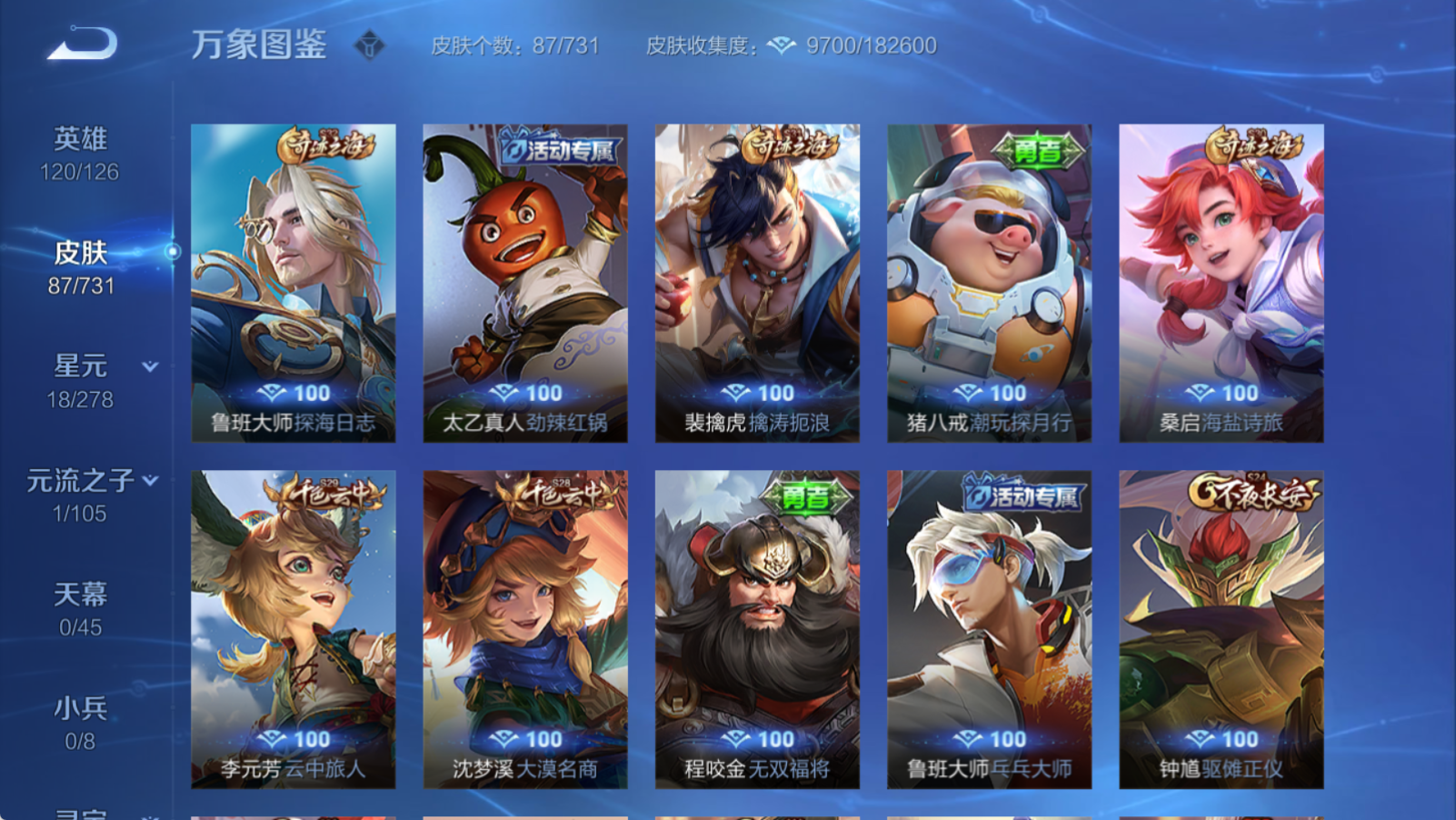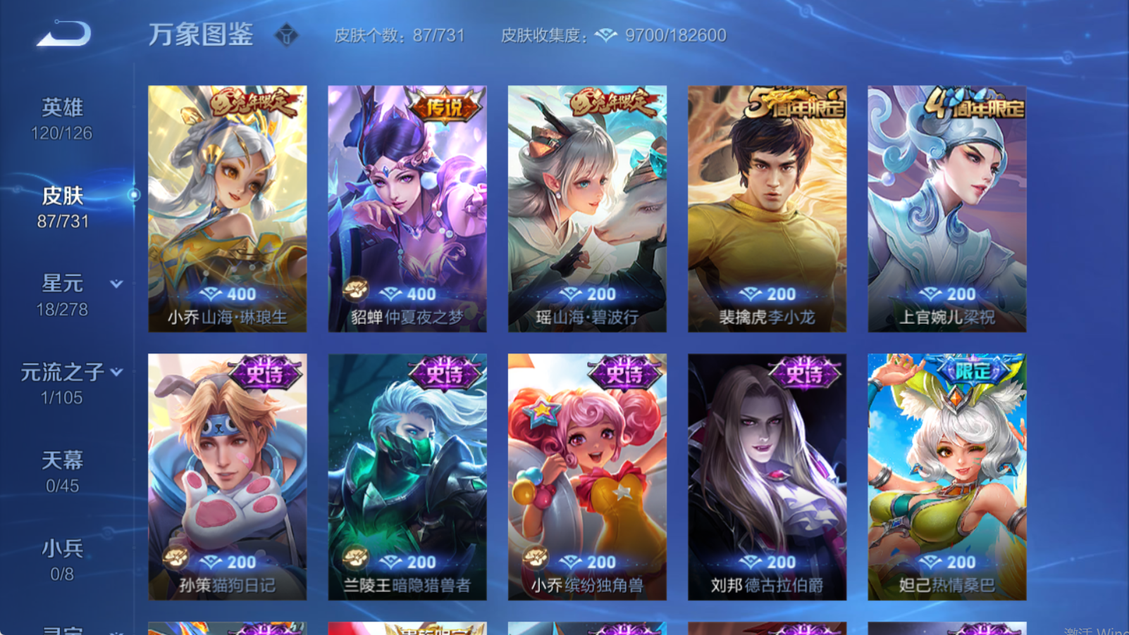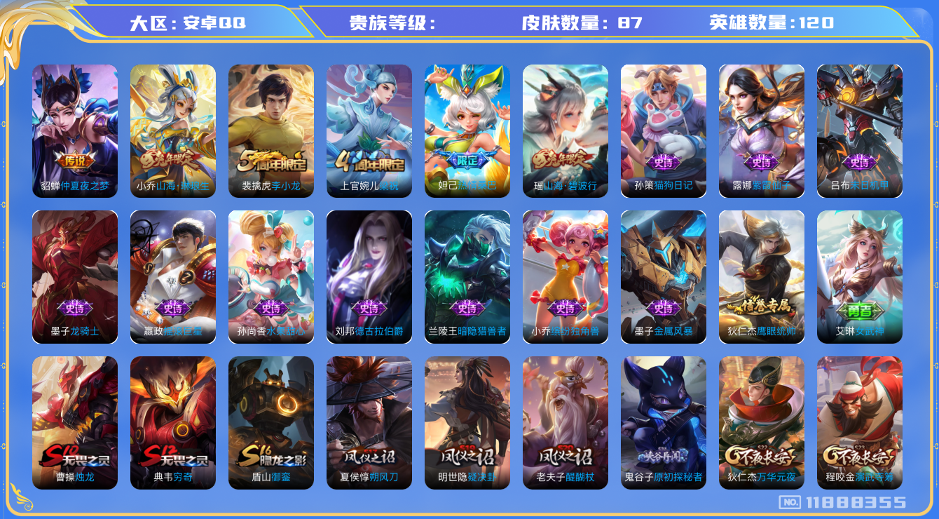 [11888355]: 可修改 性别: 男号 英雄数: 120 皮肤数: 87 传说皮: 仲夏夜之梦,山海·琳琅生 限定皮: 李小龙,梁祝,热情桑巴,山海·碧波行 亮点: 【店长推荐精品号】极品性价比账号 山海琳琅生仲夏夜之梦山海碧波行热情桑巴 多热门限定