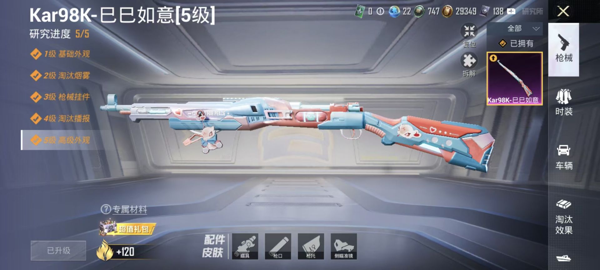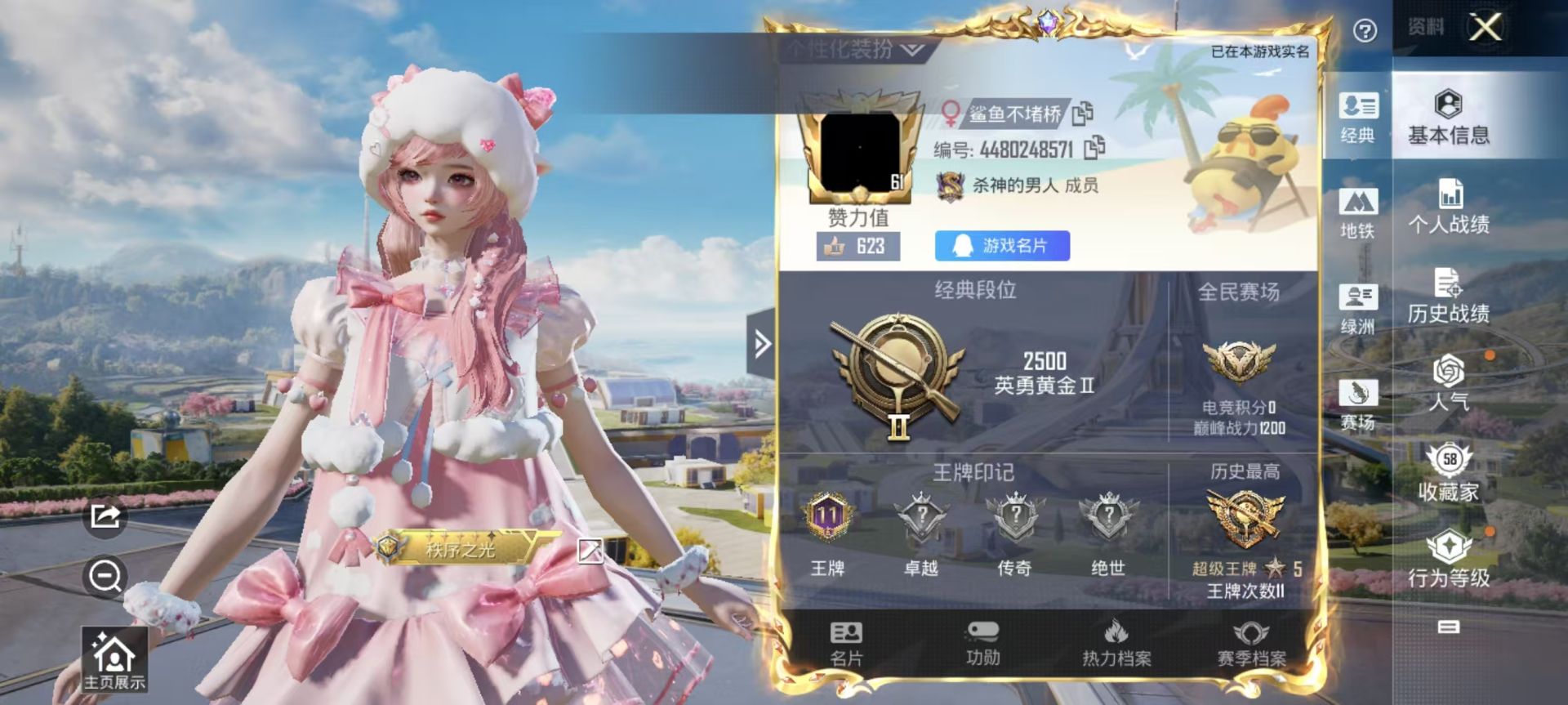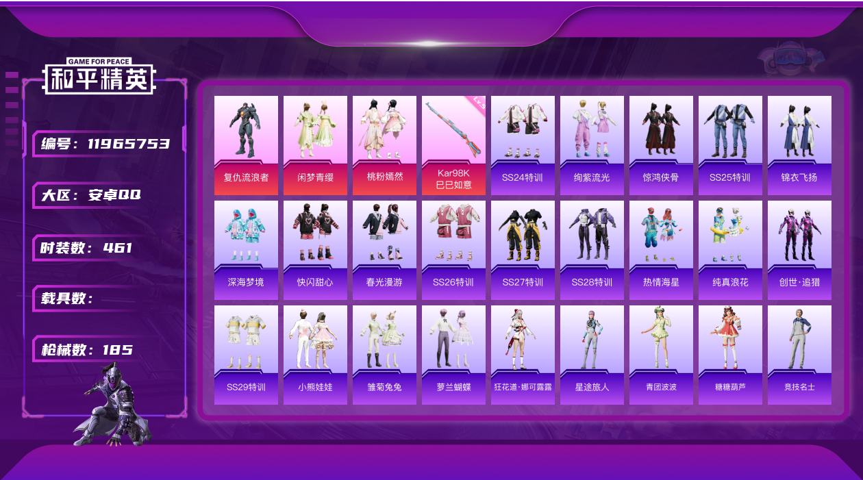 【10797656】[11965753]实名: 可修改 时装数: 461 枪械数: 185 战备数: 154 热门装扮: 复仇流浪者,闲梦青缨,桃粉嫣然 稀有枪皮: Kar98K-巳巳如意