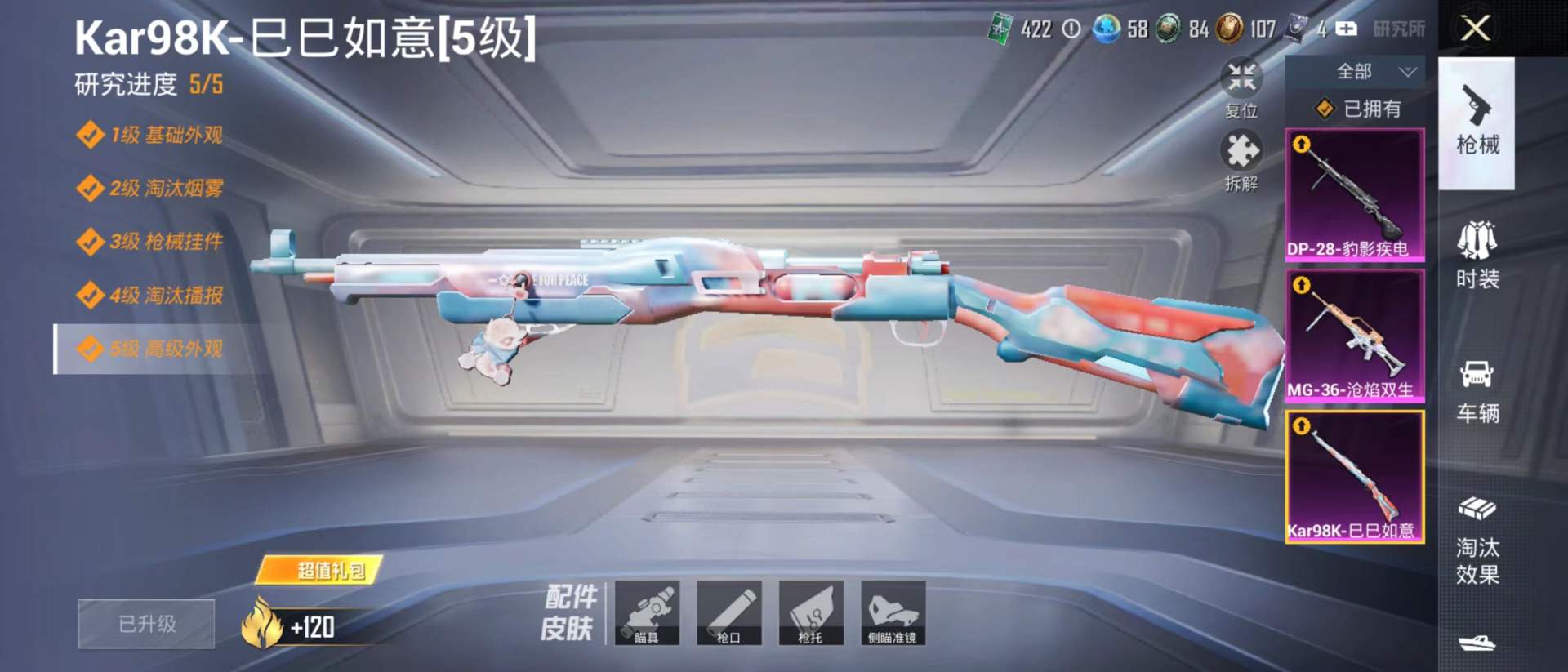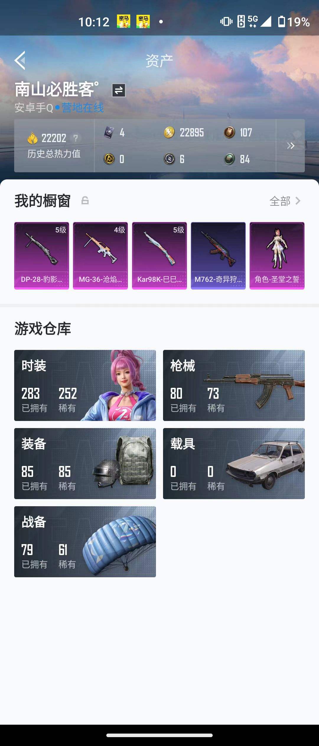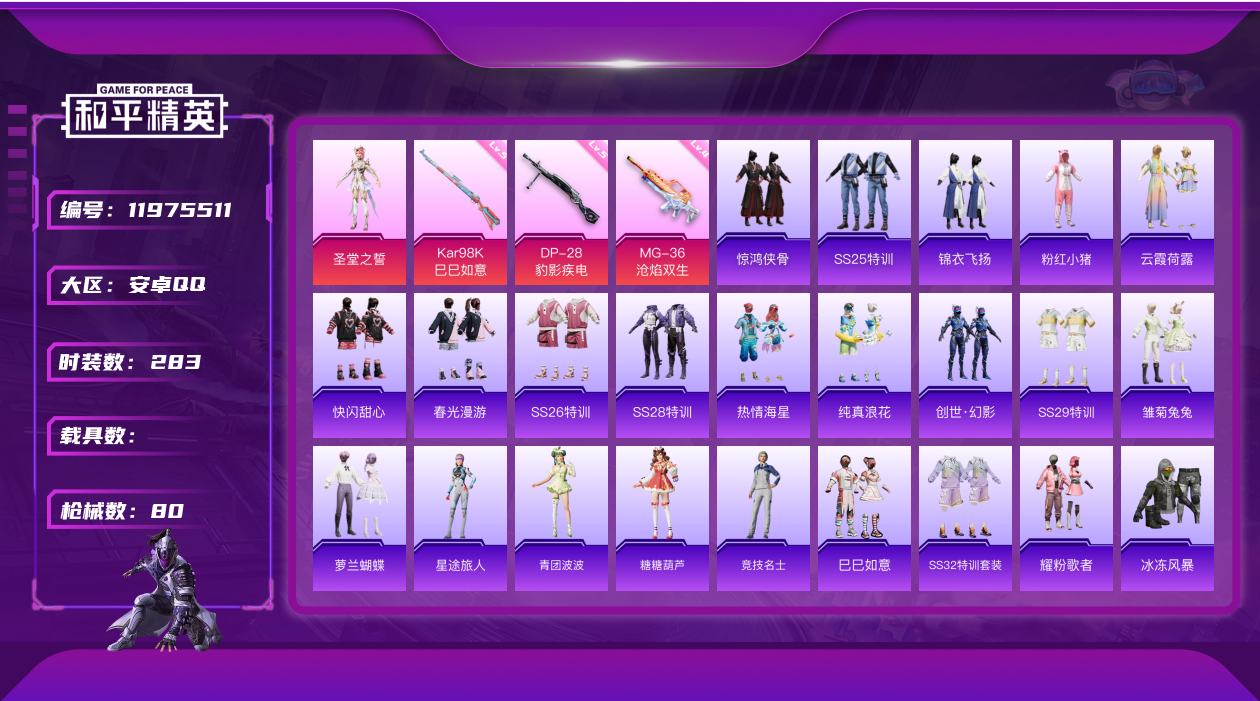 【10800140】[11975511]实名: 可修改 时装数: 283 枪械数: 80 战备数: 79 热门装扮: 圣堂之誓 稀有枪皮: Kar98K-巳巳如意,DP-28-豹影疾电,MG-36-沧焰双生
