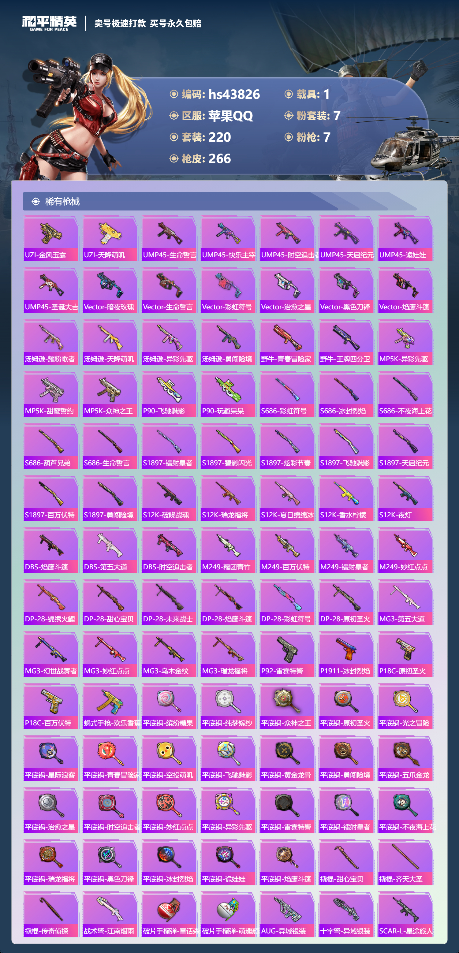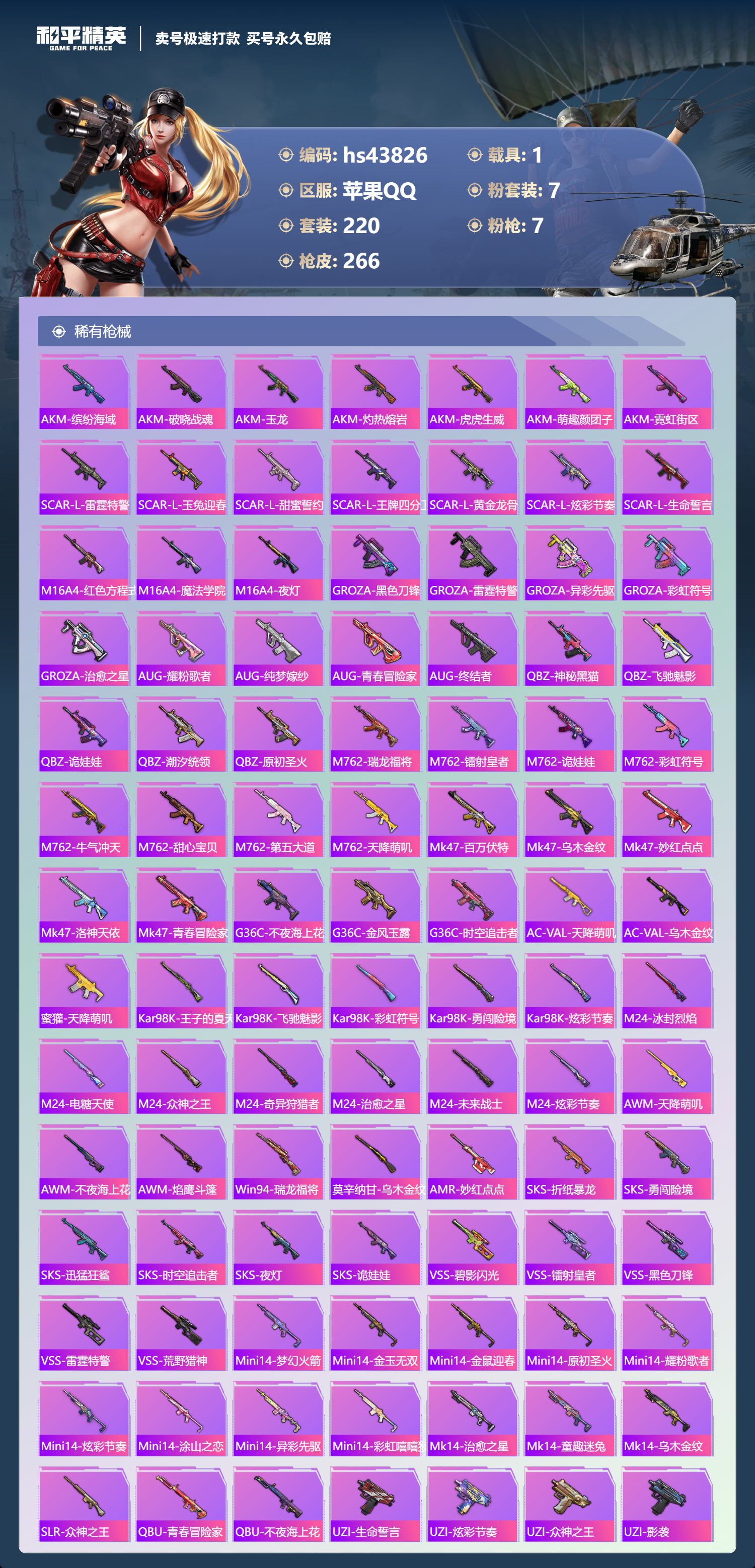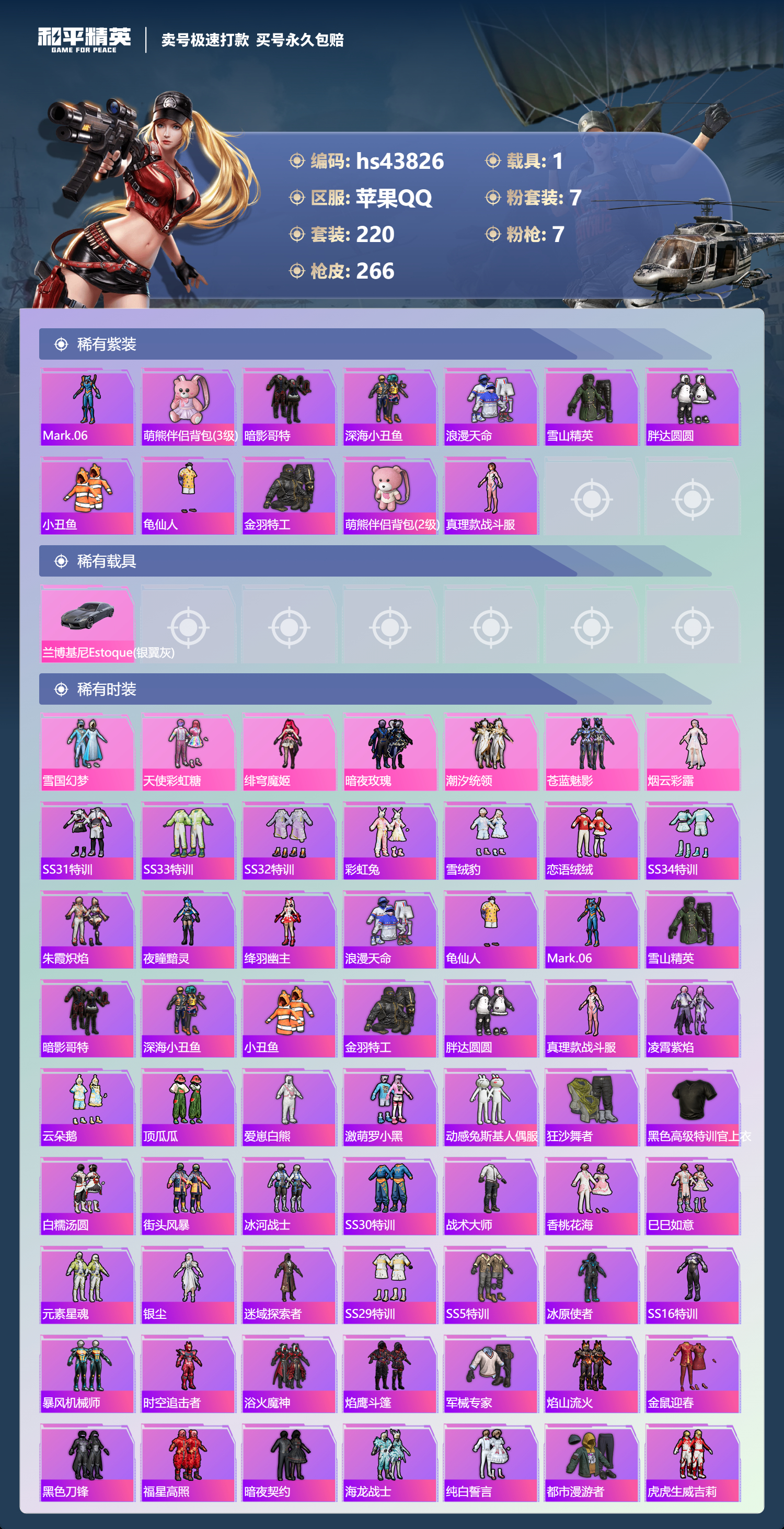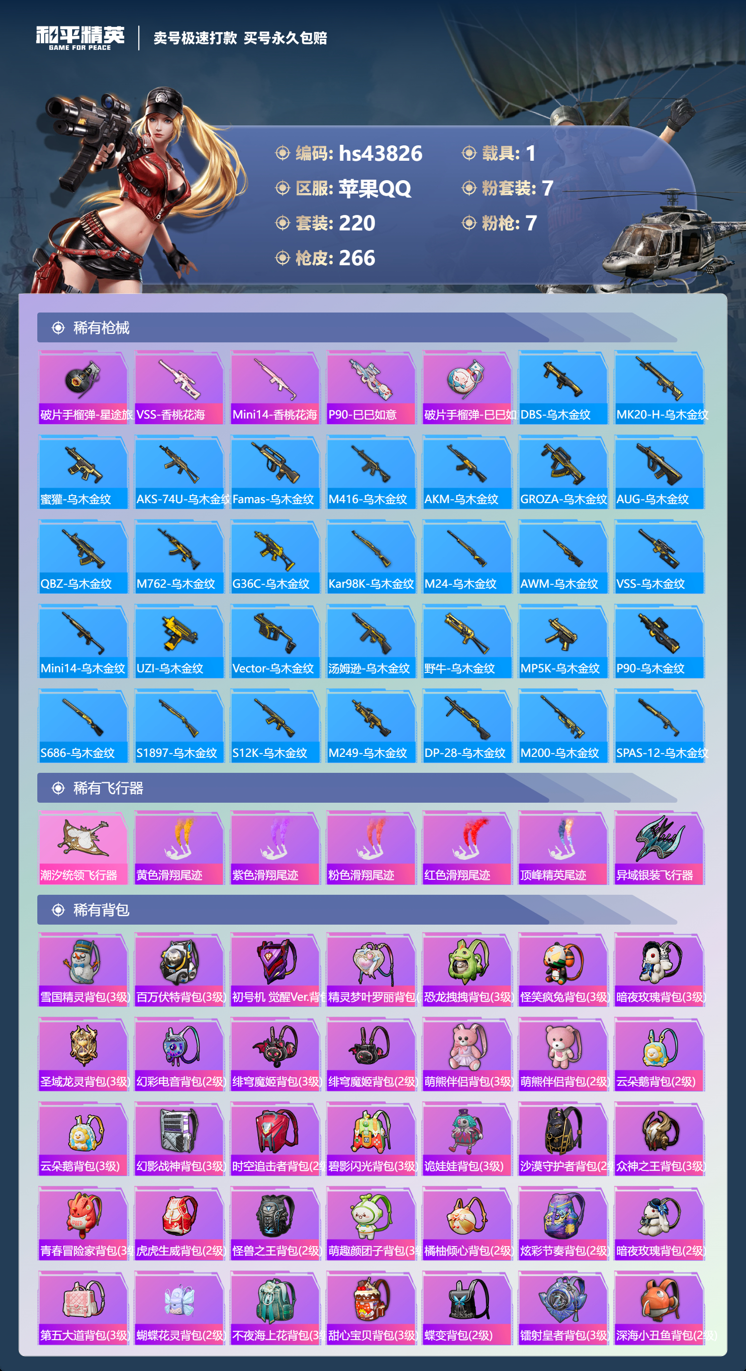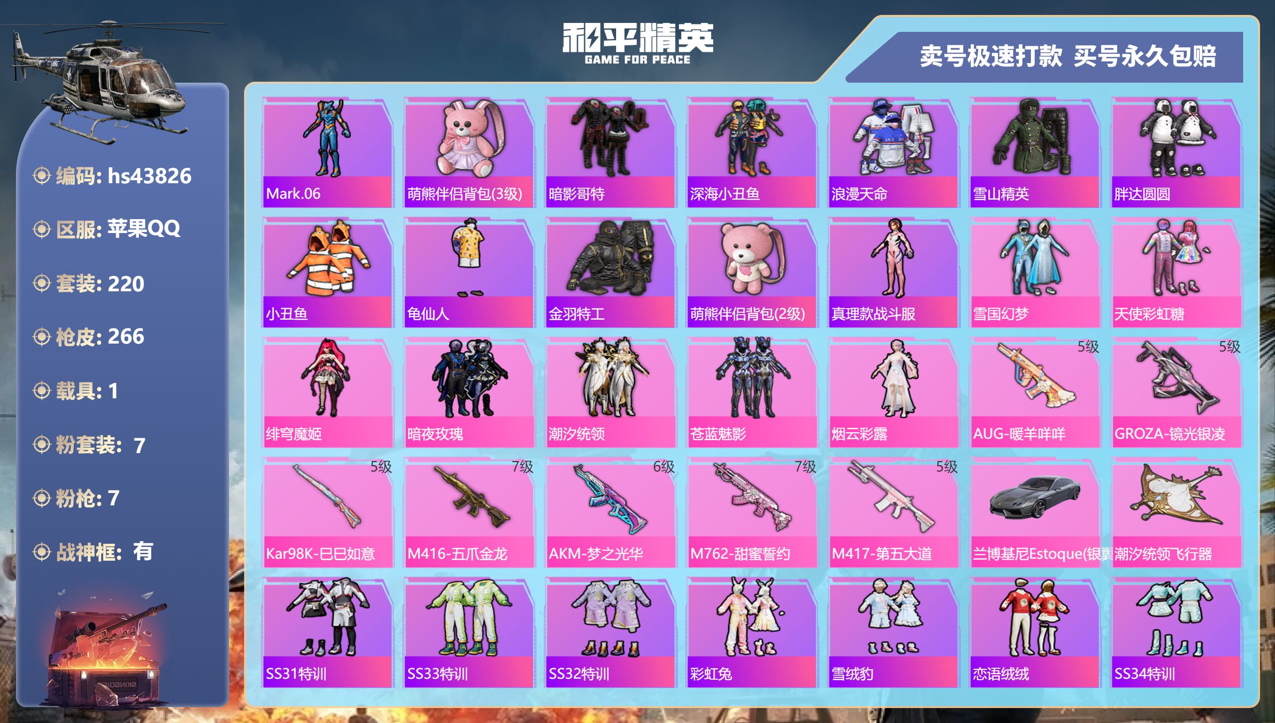【10828584】【不可二次】【苹果QQ】M762-甜蜜誓约 龟仙人 雪国梦幻 M416-五爪金龙 苍蓝魅影 M24-奇异狩猎者 极速红龙 M416-仓鼠灰灰 浪漫假日 深海小丑鱼 瑞龙福将 抹茶蜜豆 浪漫天命 激萌罗小黑 纯白誓言 胖达圆圆 团圆交子 潮汐统领 暗夜契约 M762-瑞龙福将 黑色刀锋 兰博轿车灰色 M417射手步枪 狂沙舞者 金羽特工 潮汐统领飞行器 雪国幻梦 M762甜蜜誓