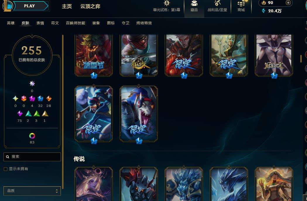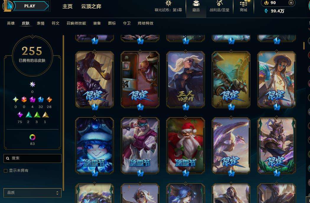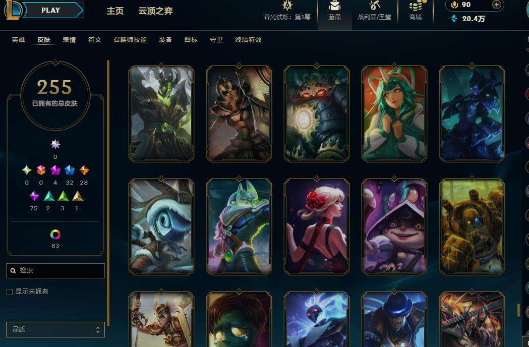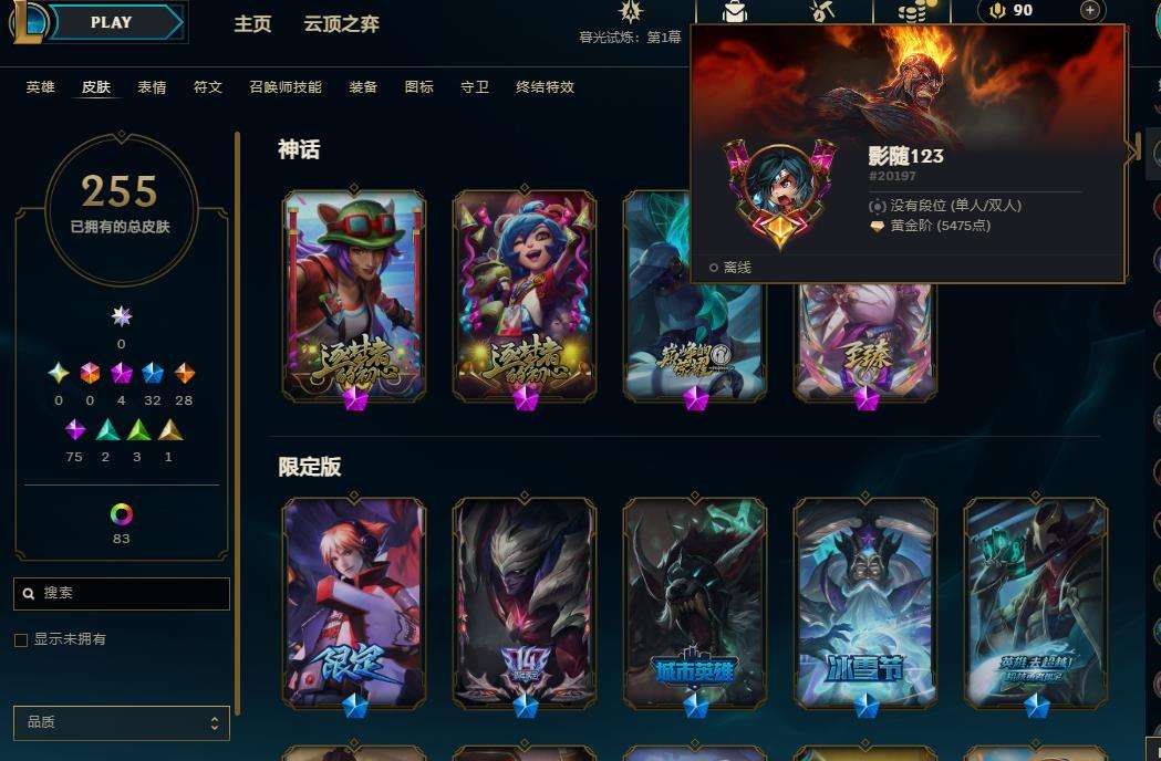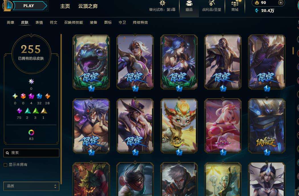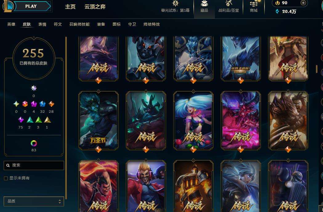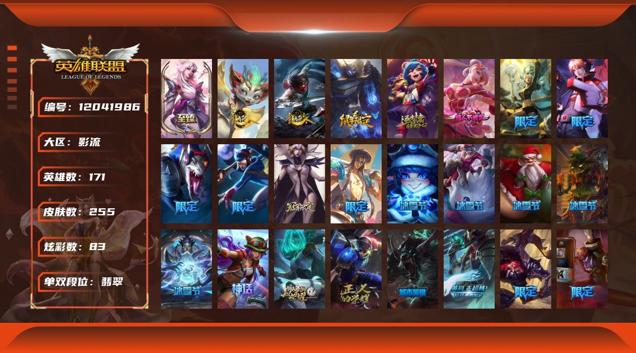 【10829471】[12041986]影流英雄171/皮肤255/神话4/炫彩83至臻 灵魂莲华 拉克丝/甜心宝贝 娑娜/胜利凤凰 艾尼维亚/胜利之运 崔斯特/胜利剑圣 易/胜利女神 娑娜/胜利巨口 克格莫/胜利之王 泰达米尔/胜利之剑 亚托克斯/胜利枪神 卢锡安/S1FNC 迦娜/S2 暗杀星 伊泽瑞尔/S5 SKT T1 雷克顿/S5 SKT T1 滑板鞋/S8 IG 乐芙兰/寒冬精灵 璐