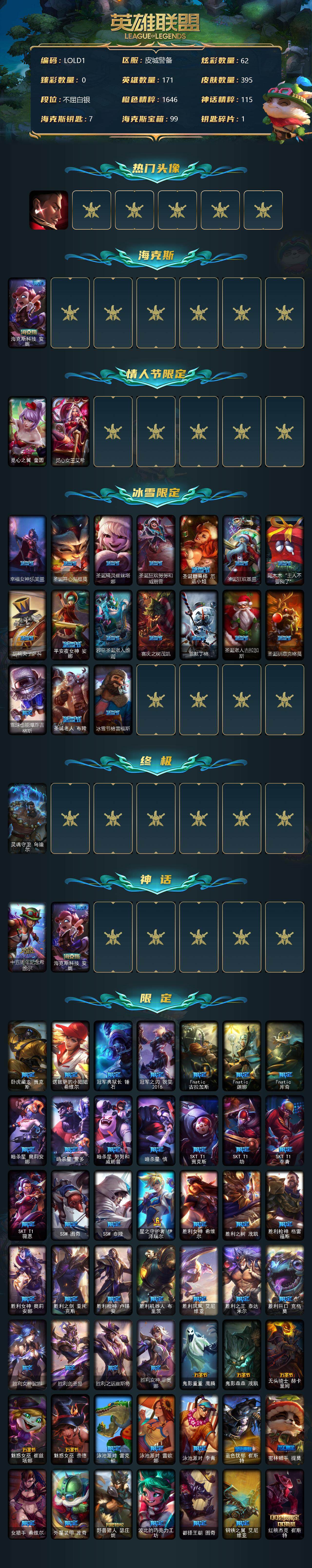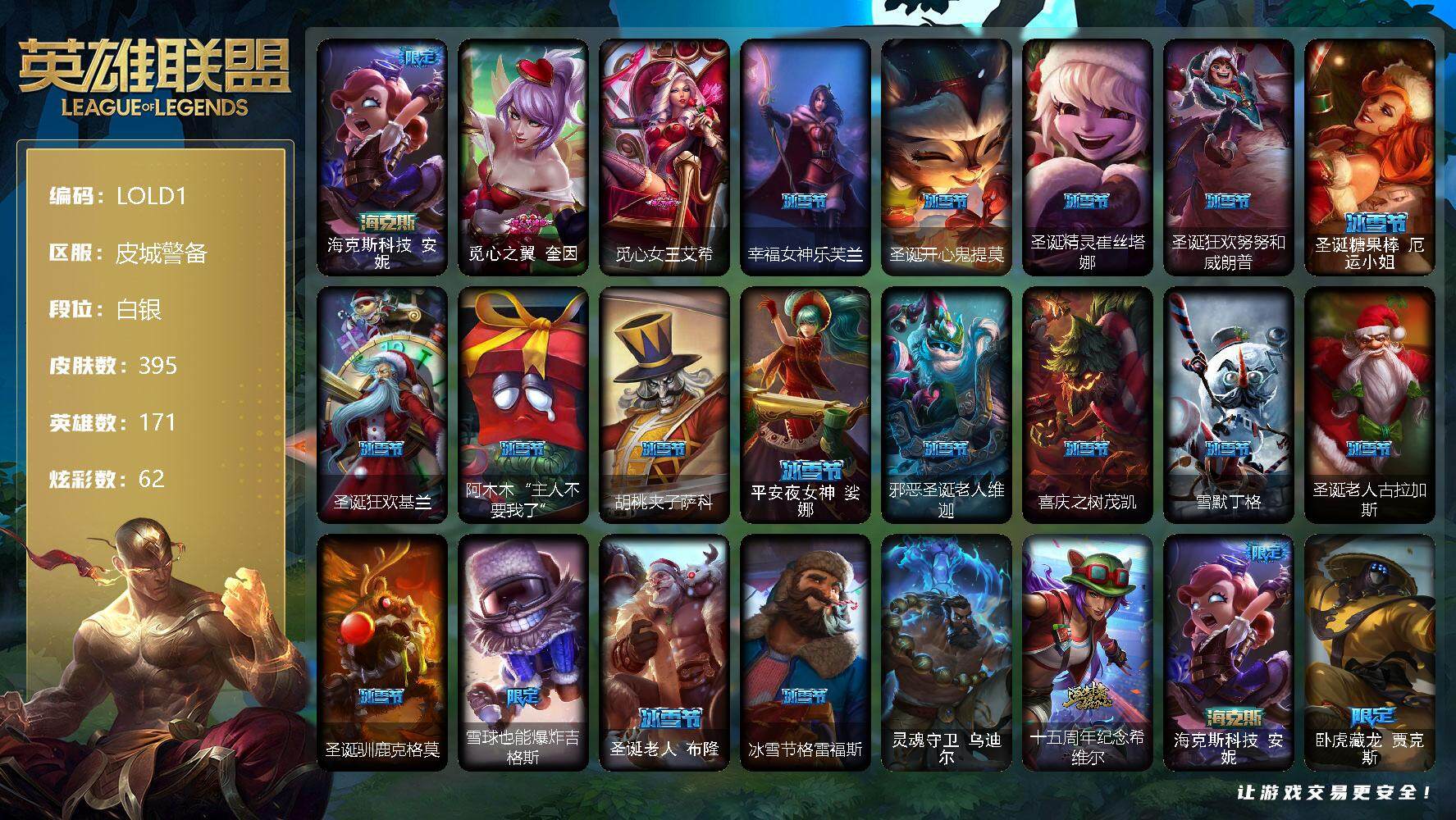 【10829842】【LOLD1】171英雄/395皮肤/1终极/2神话/73限定/62炫彩/34传说/105史诗/白银账号等级:491/觅心游侠卢锡安/海克斯科技安妮/觅心之翼奎因/觅心女皇艾希/幸福女神乐芙兰/圣诞开心鬼提莫/圣诞精灵崔丝塔娜/圣诞狂欢努努和威朗普/圣诞糖果棒厄运小姐/圣诞狂欢基兰/阿木木:“主人不要我了”/胡桃夹子萨科/平安夜女神娑娜/邪恶圣诞老人维迦/喜庆之树茂凯/雪默丁