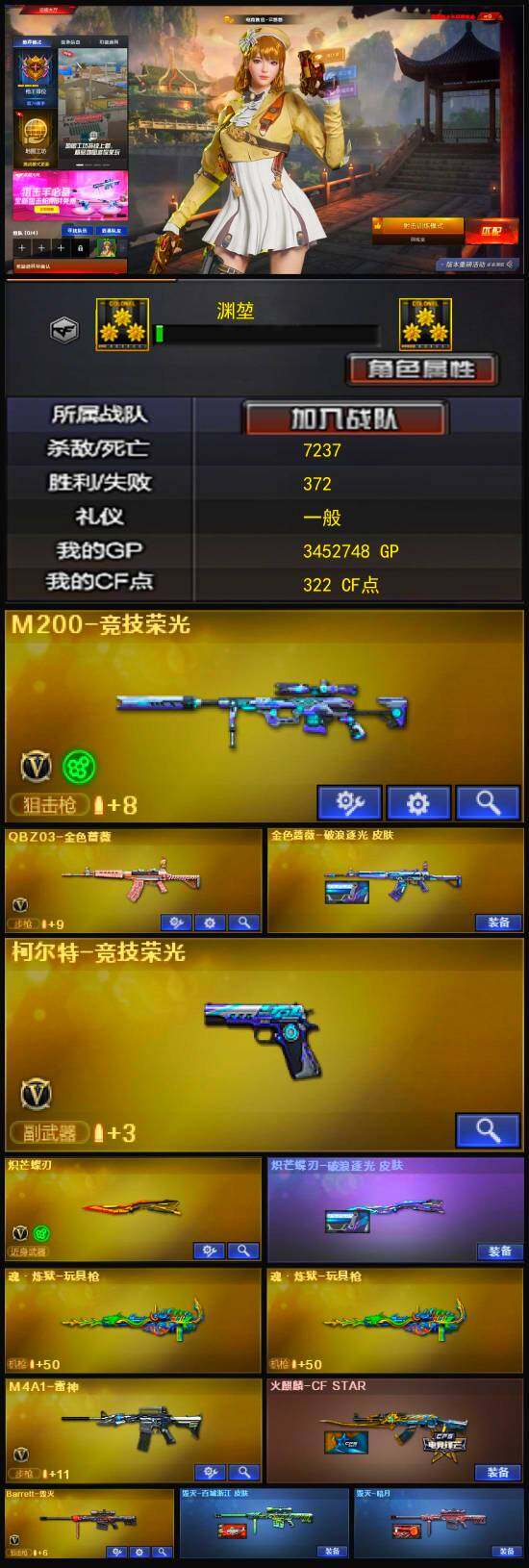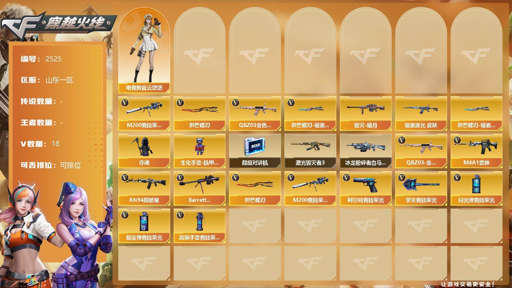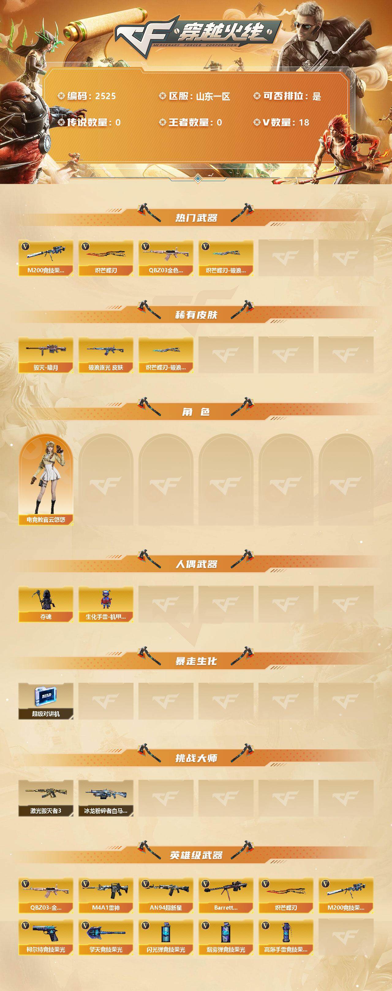 【10831205】【10831205】【商品标题】:山东一区-18V-0王者-0炫金【热门武器】:QBZ03-金色蔷薇,M200-竞技荣光,炽芒蝶刃,炽芒蝶