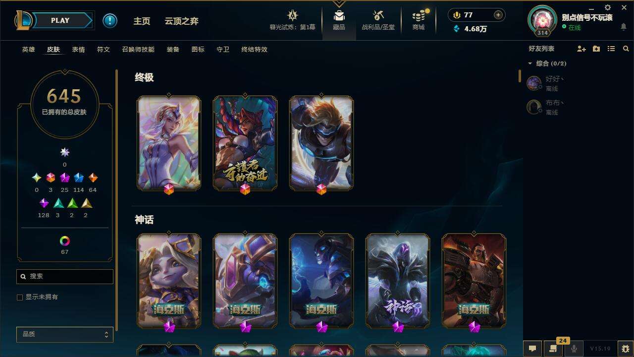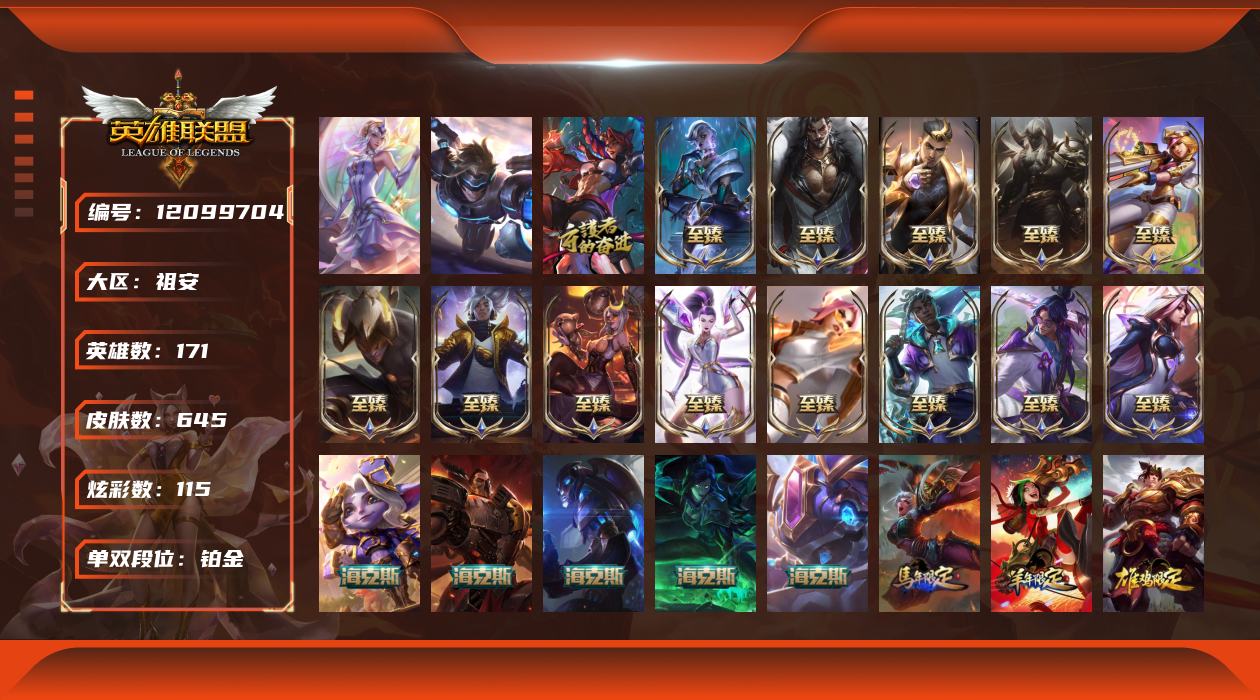 【10831302】[12099704]【gpz_960552】 t27253【祖安】645皮肤 115炫彩 13臻彩 25神话/114限定/64传说/171英雄 账号等级:314 云顶神话:3 单双排段位:翡翠 【重要头像】星守阿狸 至爱的鹿 觅心之翼奎因 KDA萨勒芬妮 小斗 圣诞捣蛋鬼金克丝 至臻福牛守护者菲奥娜 至臻KDA卡莎 【重要皮肤】狼神英灵斯维因至臻 T1杰