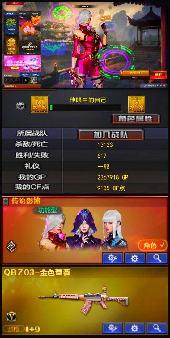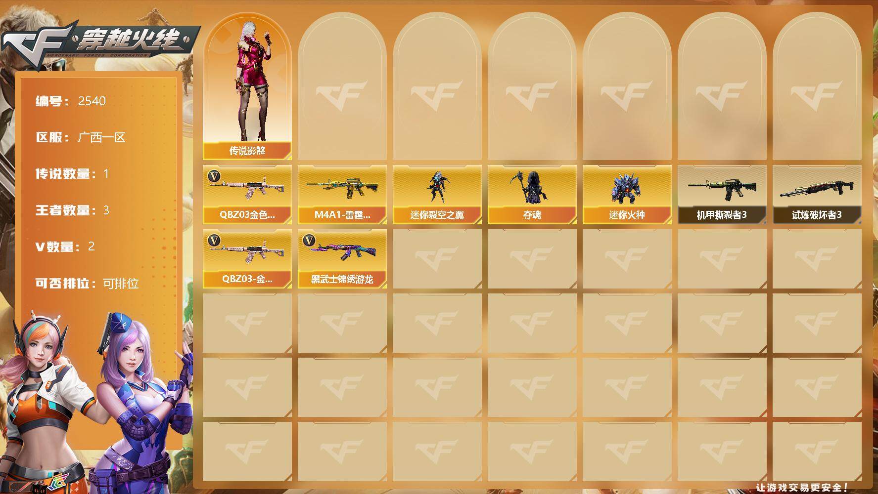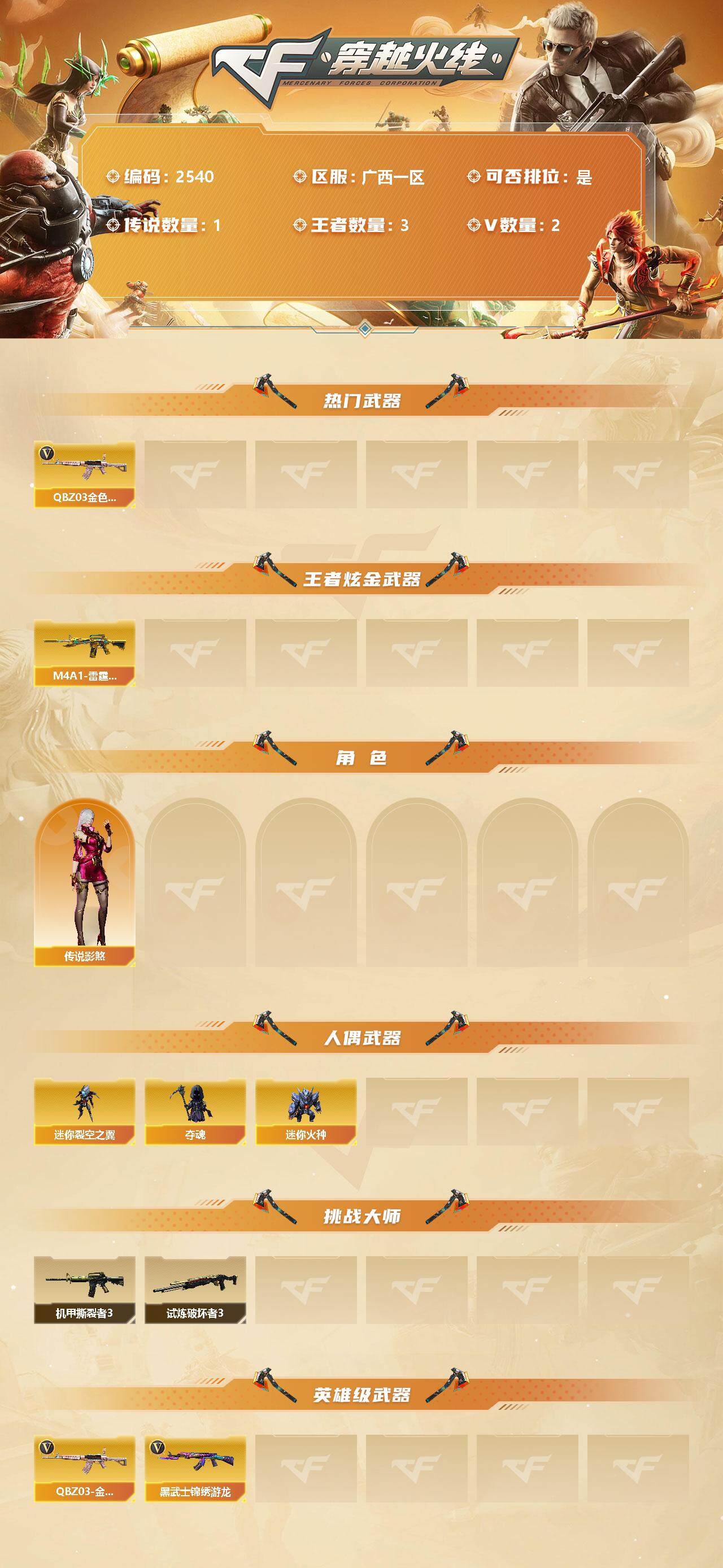 【10831867】【10831867】【商品标题】:广西一区-2V-3王者-0炫金【传说角色】:传说影煞【热门武器】:QBZ03-金色蔷薇【王者炫金武器】:
