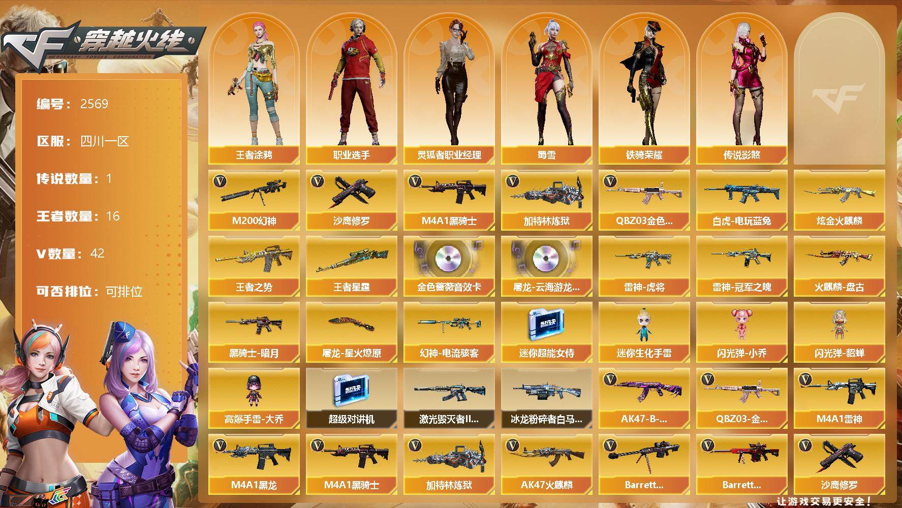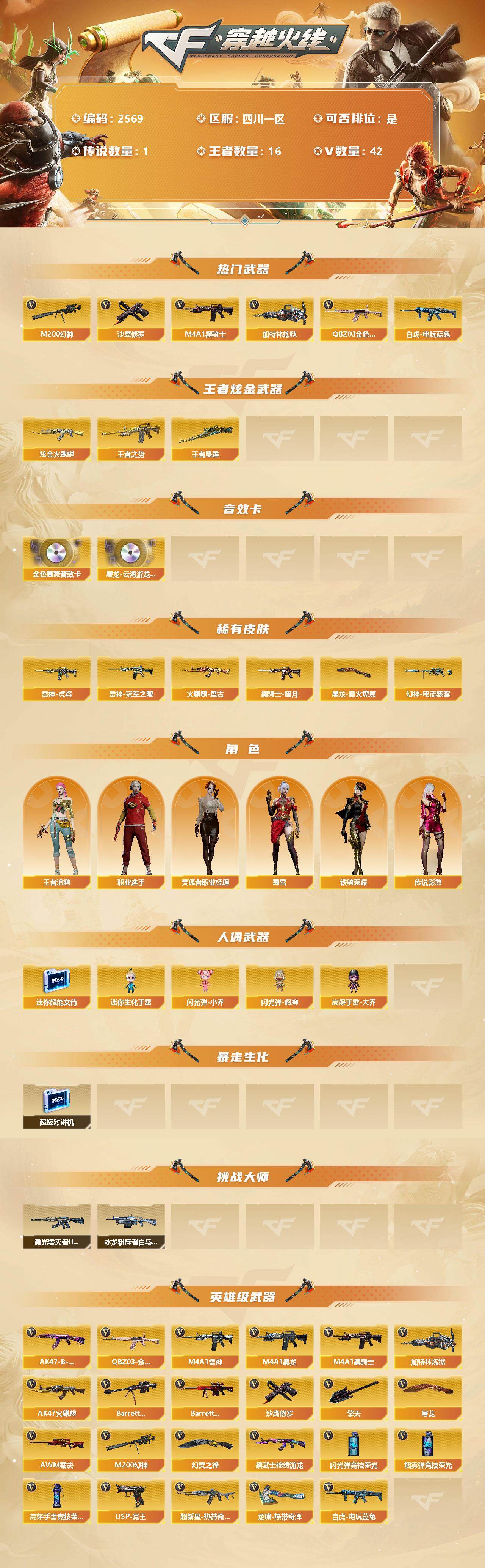 【10831894】【商品标题】:四川一区-42V-16王者-1炫金【传说角色】:传说影煞【热门武器】:QBZ03-金色蔷薇,M200-幻神,白虎-电玩蓝兔,M4A1-黑骑士,加特林-炼狱,沙鹰-修罗*5【王者炫金武器】:炫金火麒麟,王者之势,王者星霆【音效卡】:屠龙-云海游龙音效卡,QBZ03-金色蔷薇音效卡【稀有皮肤】:幻神-电流骇客 皮肤,雷神-虎将,雷神-冠军之魄,火麒麟-盘古,黑骑士-