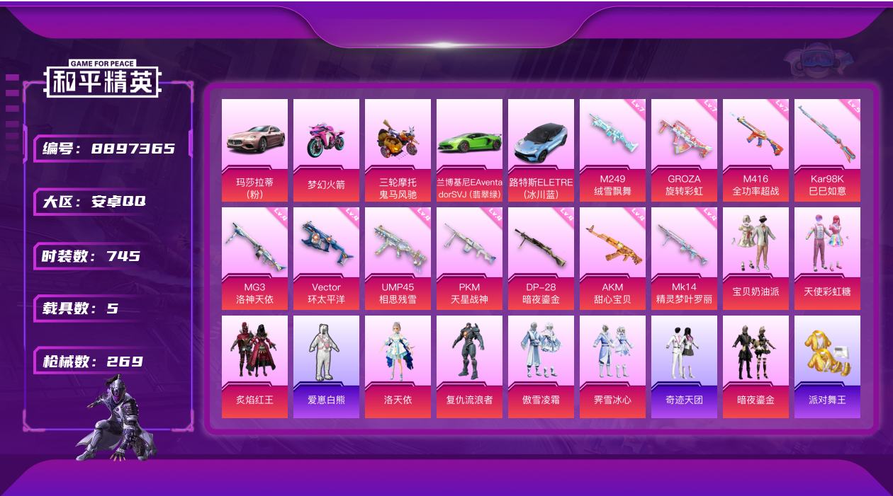 【10832101】【可二次】【安卓QQ】双人摩托梦幻火箭 兰博SVJ绿色 鬼马风驰 天使彩虹糖 UMP45-相思残雪 宝贝奶油派 玛莎拉蒂粉色 MG3-洛神天依 洛天依 角色-复仇流浪者 AKM-甜心宝贝