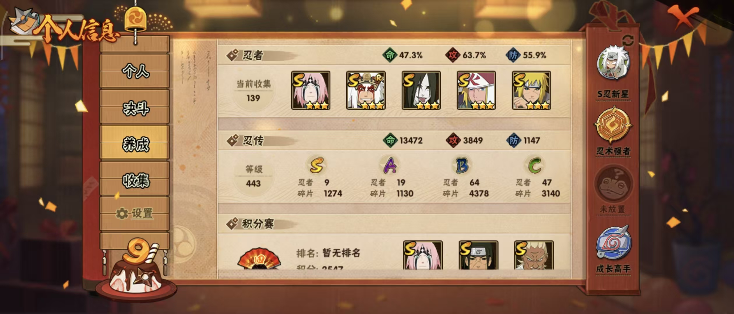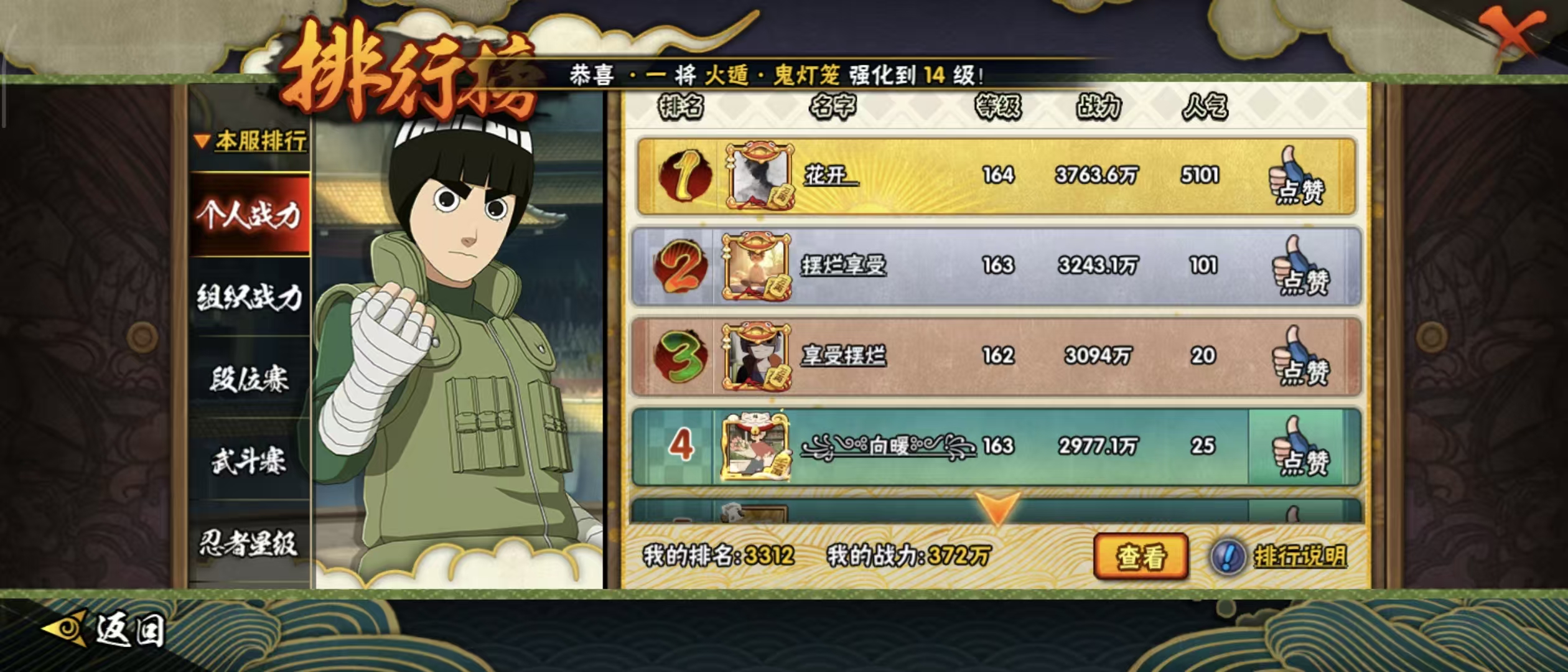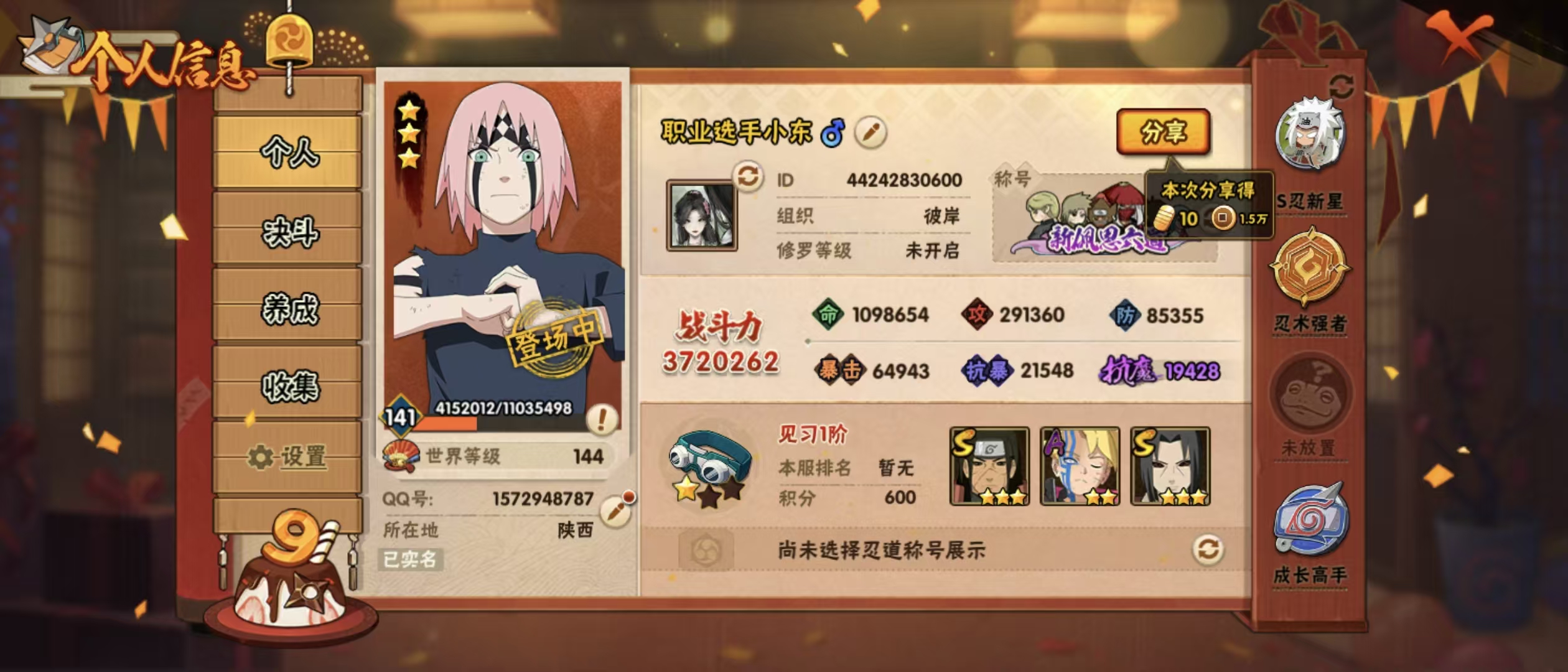 [12159516]火影忍者-安卓QQ VIP8,370W战力,S忍9个,A忍19个,本服排名3312,战区排名未上榜,通灵兽14个,4时装,见习1阶,忍者星数296 【时装】百战佩恩天道,百战大蛇丸,蜀面豪杰自来也舞之豪杰,百战波风水门 【S忍】忍界大战春野樱,舞之豪杰自来也,大蛇丸,波风水门,秽土转生波风水门,秽土转生千手柱间...