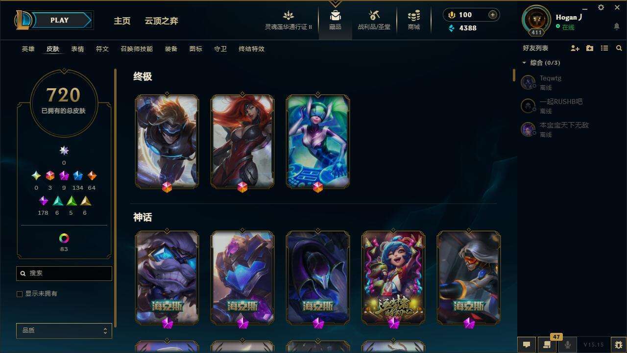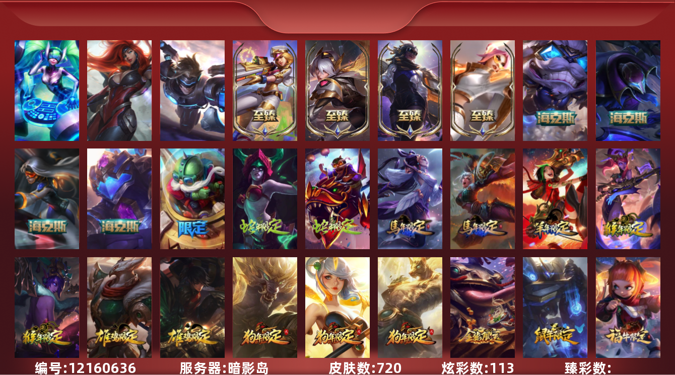【10841563】[12160636]【gpz_960905】 t24531【暗影岛】原皮龙瞎 720皮肤 113炫彩 9神话/134限定/64传说/162英雄 账号等级:411 【重要头像】心型钥匙 雪花 魔女阿狸炫彩 披萨鸡 福牛守护者安妮炫彩 至臻福牛守护者菲奥娜 【重要皮肤】真实伤害赛娜至臻 福牛守护者菲奥娜至臻 电玩女神凯特琳至臻 源计划正义艾瑞莉娅至臻 海克斯科技吉格斯 海克斯科