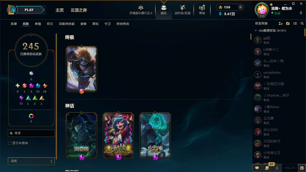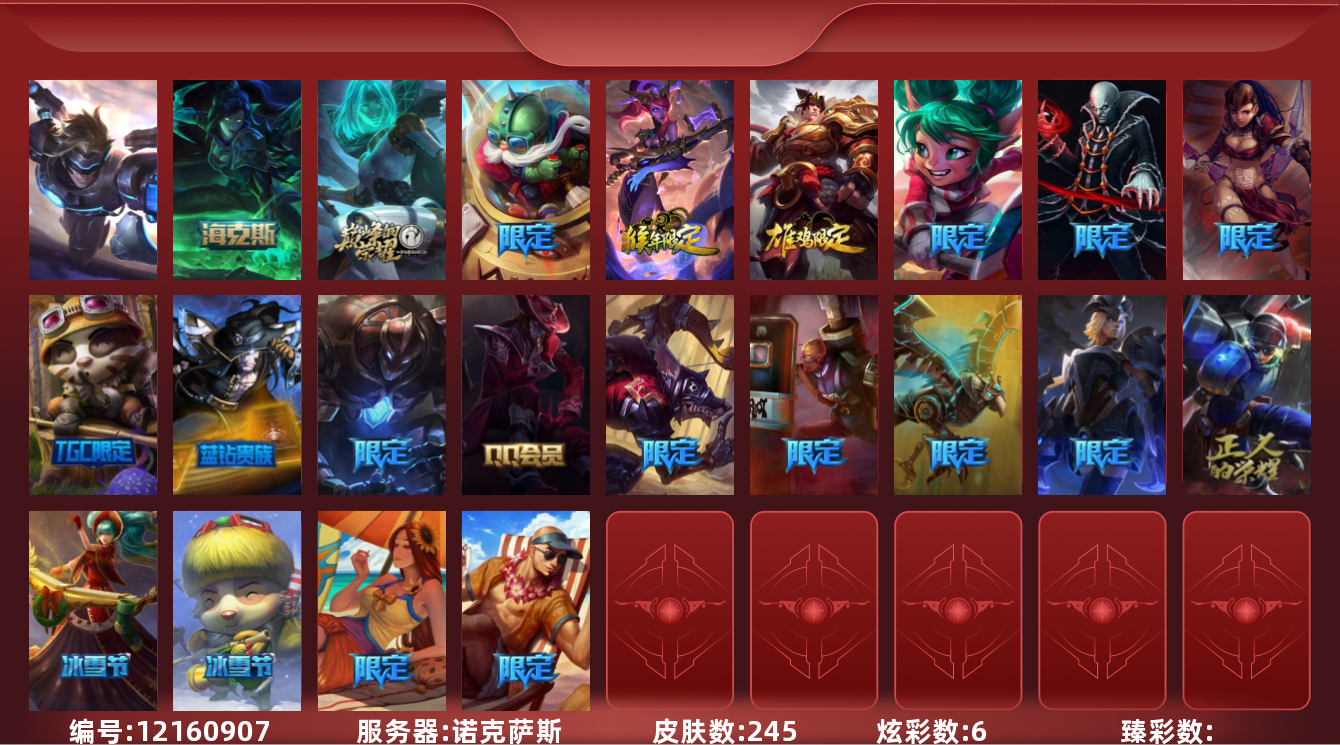 【10841642】[12160907]【gpz_960909】 t24543【诺克萨斯】245皮肤 6炫彩 3神话/51限定/16传说/141英雄 账号等级:153【重要头像】冬境仙灵索拉卡 【重要皮肤】摄魂使者薇恩 钢铁军团拉克丝 银龙裁决泰隆 定海神珍孙悟空 玉净夜叉凯特琳 张辽文远 平安夜女神娑娜 圣诞糖果棒厄运小姐 泳池派对李青 泳池派对蕾欧娜 SKTT1卡莉丝塔 SSW锤石 SSW