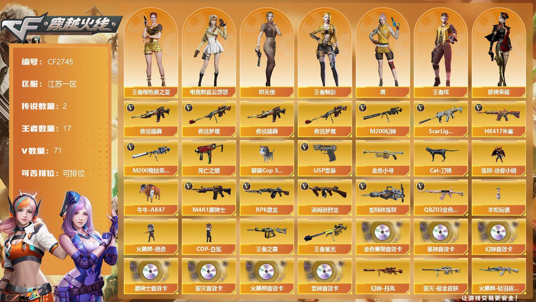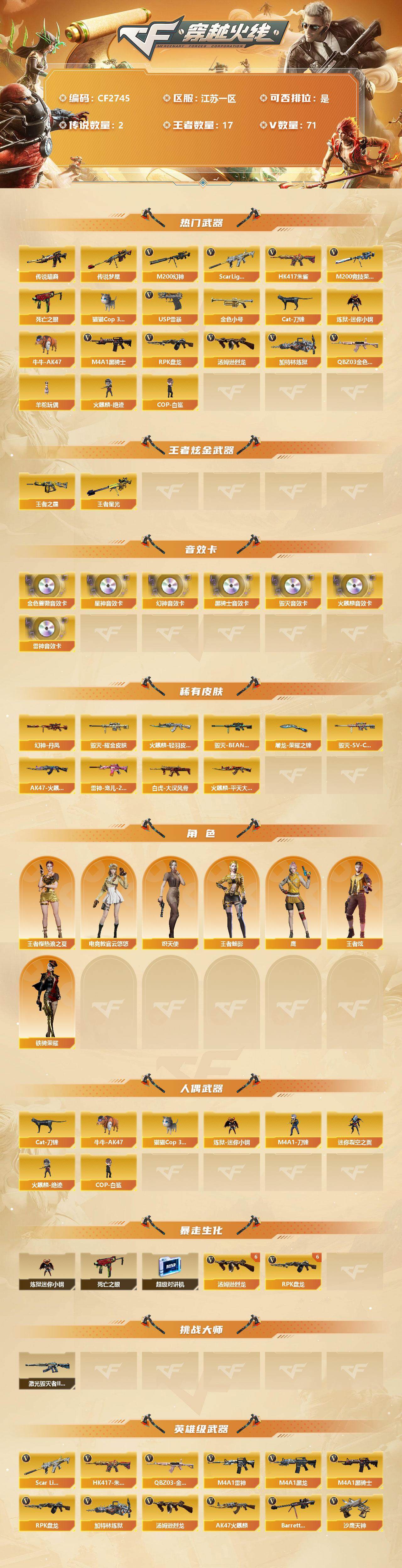 【10842187】【10842187】【CF2745】【商品标题】:江苏一区-71V-17王者-0炫金【荣耀之巅】【会员等级VIP2】【幻神三件套】【幻神1
