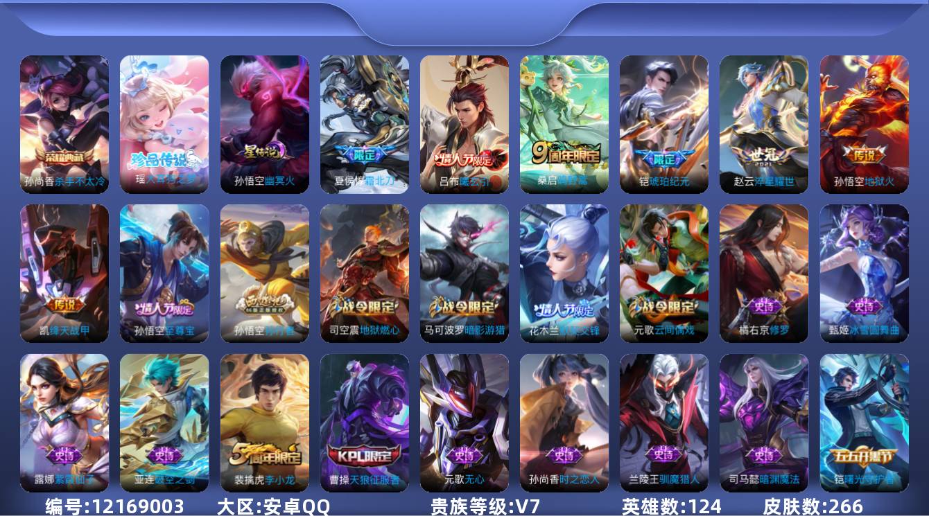 [12169003]贵族等级: V7 英雄数: 124 皮肤数: 266 荣耀水晶: 杀手不太冷 珍品传说: 大耳狗之梦 星传说: 幽冥火 传说皮: 绛天战甲,地狱火,淬星耀世,琥珀纪元铠,吕布曦玄引 限定皮: 李小龙,梁祝,天狼征服者,逐梦之影,至尊宝,默契交锋-花木兰,高山流水,孙行者,匿光决锋者,五谷丰年,夏侯惇霜北刀,鸣野蒿,逐霄战戟