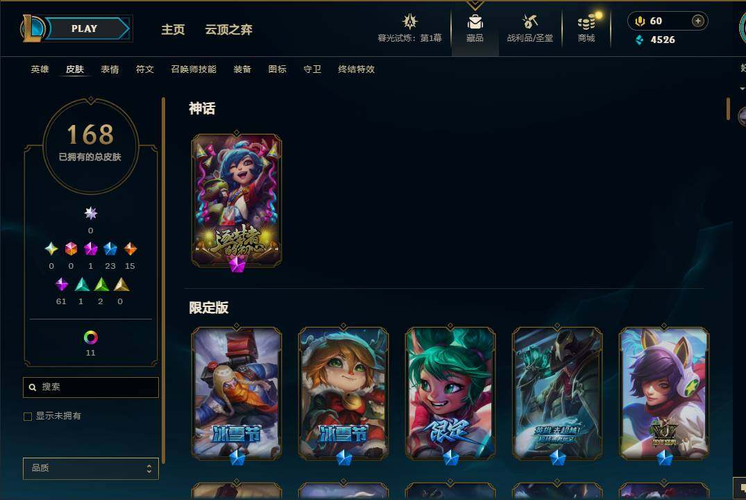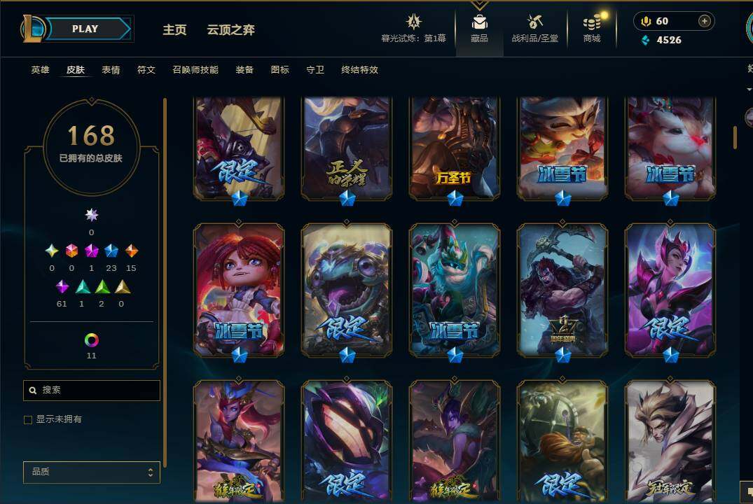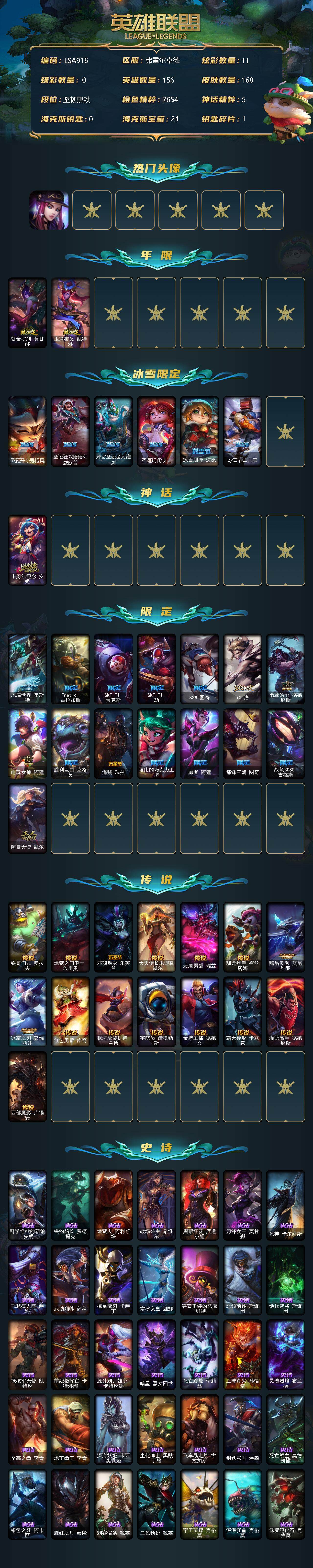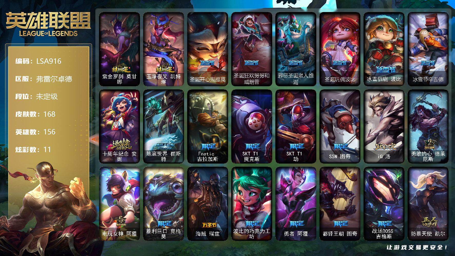 【10843790】【LSA916】156英雄/168皮肤/1神话/23限定/11炫彩/15传说/61史诗/未定级账号等级:247/KDA阿卡丽头像/紫金罗刹莫甘娜/玉净夜叉凯特琳/圣诞开心鬼提莫/圣诞狂欢努努和威朗普/邪恶圣诞老人维迦/圣诞玩偶波比/冰雪驯鹿波比/冰雪节辛吉德/十周年纪念安妮/地底世界崔斯特/Fnatic古拉加斯/SKTT1贾克斯/SKTT1劫/SSW图奇/IG洛/勇敢的心德莱