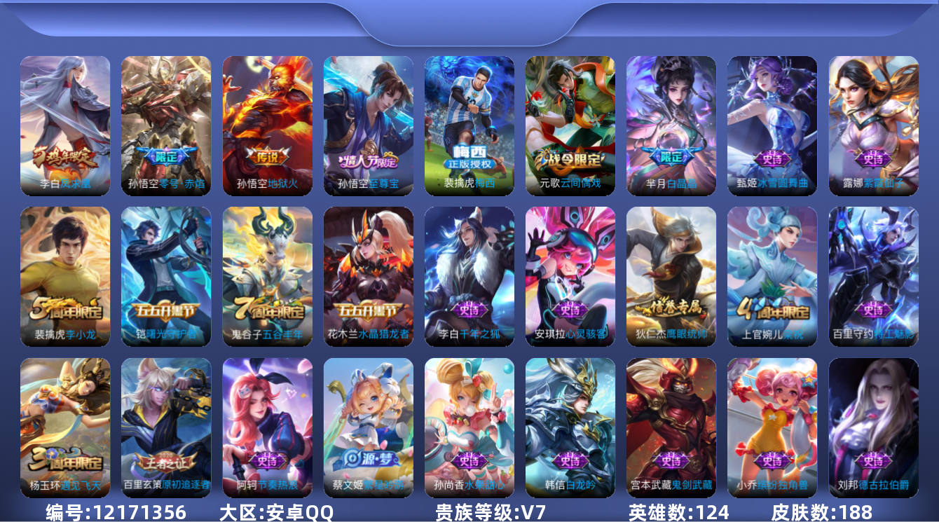 【10844031】【可二次】【QQ(安卓)】乱世虎臣 鹰眼统帅 水晶猎龙者 美猴王 偶像歌手 原初探秘者 圣诞恋歌 舞动绿茵 御霄 烛龙 凤求凰 朔风刀 梅西 缤纷独角兽 万华元夜 地狱火 御銮 特工魅影 凯尔特女王 疑决卦 醍醐杖 德古拉伯爵 古海寻踪 摇滚巨星 狮心王 鬼剑武藏 炼金王 白龙吟 白晶晶 魅力维加斯 李小龙 云中旅人 穷奇 御旌 弈星混沌棋 遇见飞天 心灵骇客 水果甜心 演武
