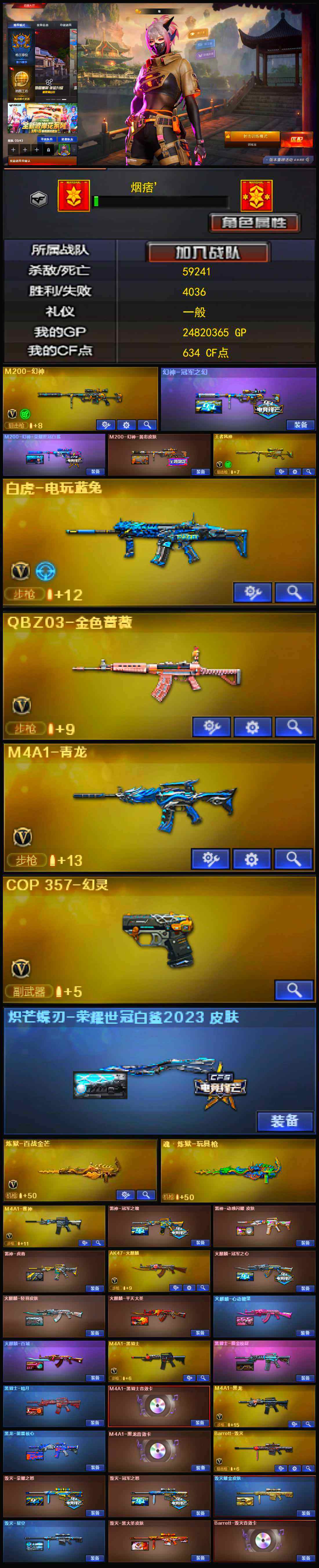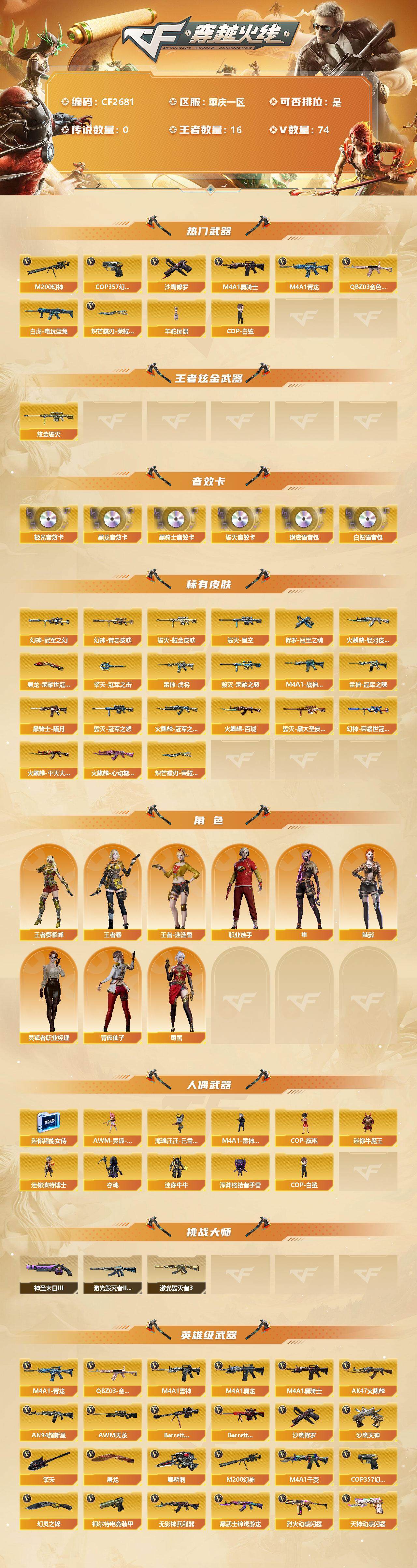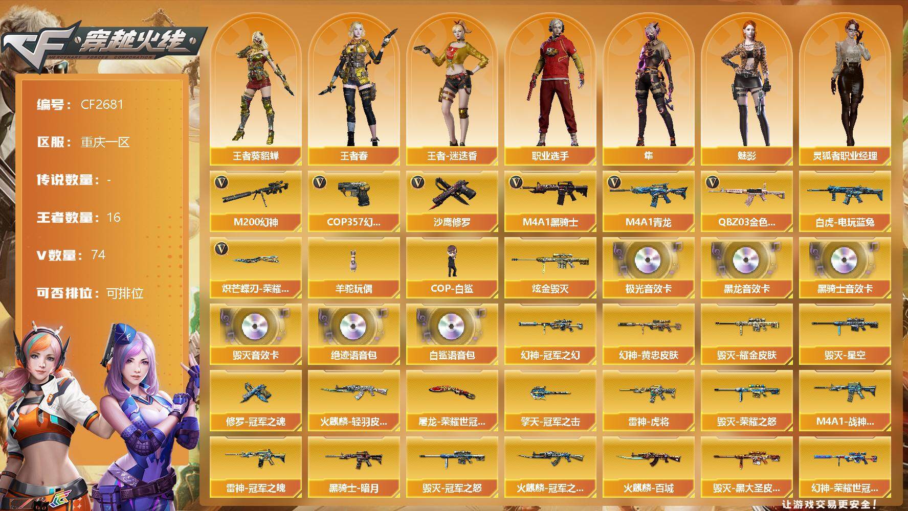 【10845692】【CF2681】【商品标题】:【精品账号/【幻神3皮】【M200-幻神】【幻神-冠军之幻】【M200-幻神-荣耀世冠白鲨】【M200-幻神-黄忠皮肤】【王者风神-觉醒版】【白虎-电玩蓝兔】【QBZ03-金色蔷薇】【M4A1-青龙】【COP 357-幻灵】【炽芒蝶刃-荣耀世冠白鲨2023 皮肤】【炼狱-百战金芒】【魂·炼狱-玩具枪】【乔伊教练】【王者春】【王者-葵-貂蝉】【王者