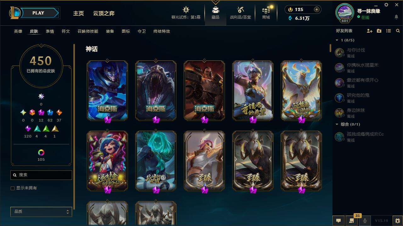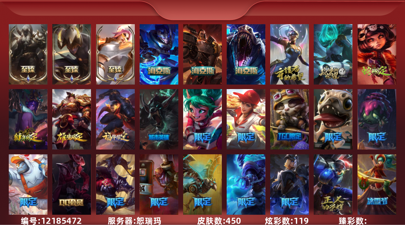 【10847413】[12185472]【gpz_961000】 t27409【恕瑞玛】450皮肤 119炫彩 7臻彩 12神话/62限定/37传说/171英雄 账号等级:601 云顶神话:1 单双排段位:白银【重要头像】银河魔装机神安妮 KDA萨勒芬妮 魄罗宇航员 披萨鸡 送披萨的小姐姐希维尔 不错哦 至臻福牛守护者菲奥娜 【重要皮肤】福牛守护者菲奥娜至臻 腥红之月亚托克斯至