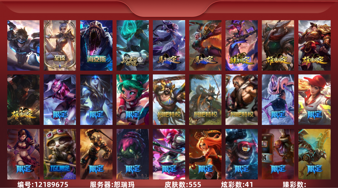 【10848279】[12189675]【gpz_961020】 t27379【恕瑞玛】原皮龙瞎 555皮肤 41炫彩 6臻彩 4神话/85限定/39传说/171英雄 账号等级:464 单双排段位:青铜【重要头像】击拳 披萨鸡 送披萨的小姐姐希维尔 【重要皮肤】玉剑传说武剑仙至臻 海克斯科技雷克顿 胜利女神娑娜 胜利女神希维尔 胜利之王泰达米尔 胜利巨口克格莫 电玩女神厄运小