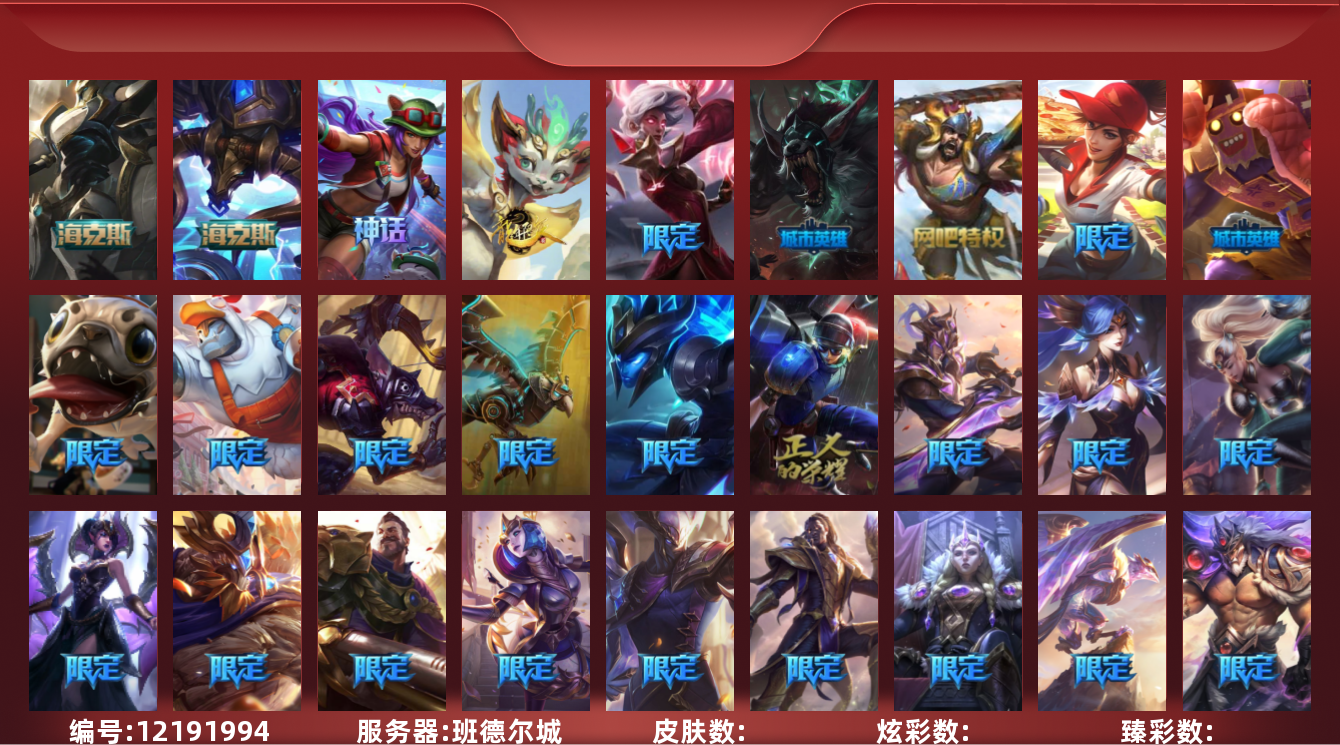 【10849053】[12191994]【云顶账号】400皮肤 289炫彩 13臻彩 4神话/47限定/28传说/171英雄 账号等级:1380 单双排段位:华贵铂金