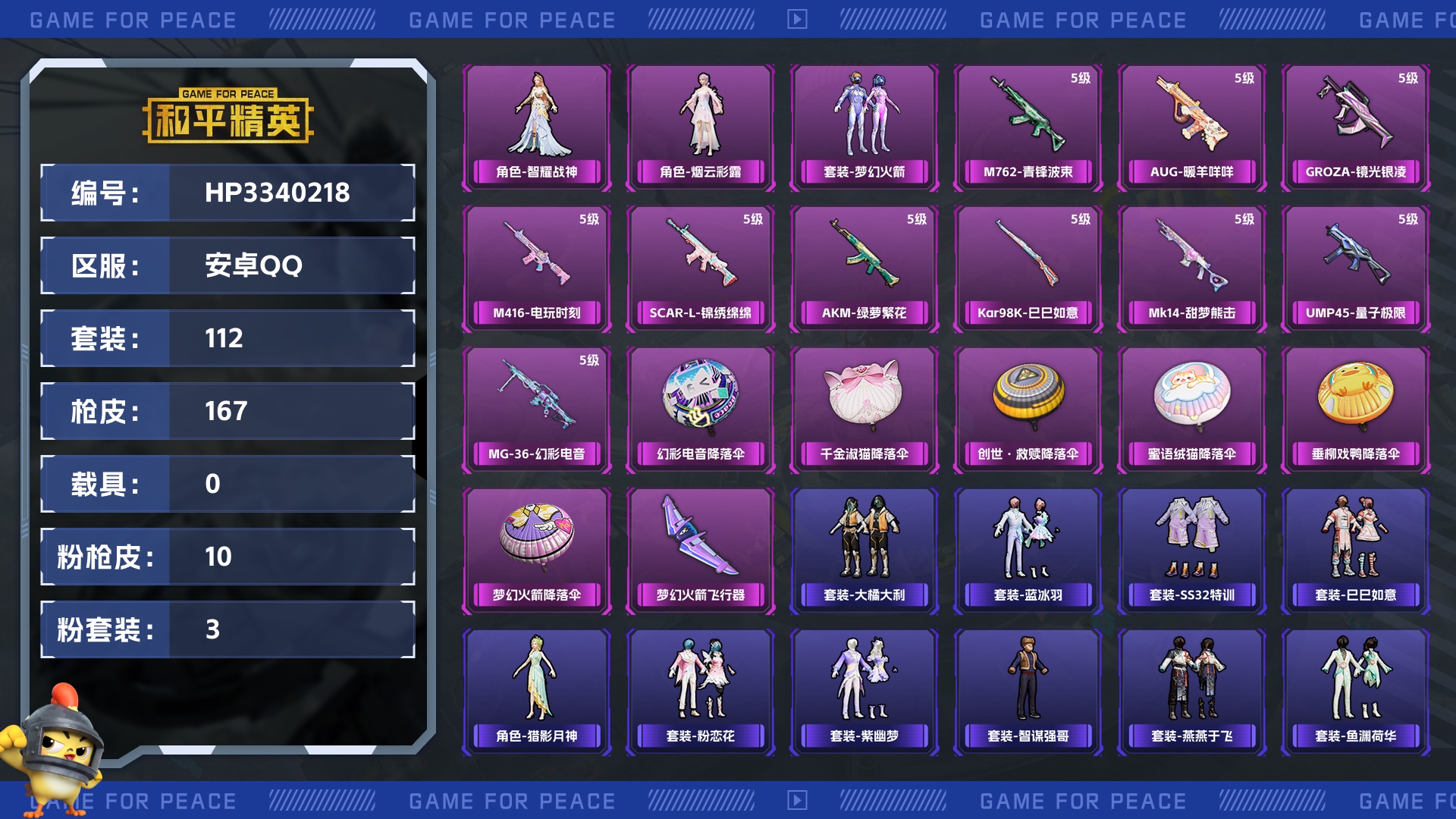 【10849284】[101555862] HP3340218|【区服】安卓QQ【等级】Lv.57【段位】英勇黄金Ⅰ【历史总热力值】45683【时装总数】433【套装数量】112【红粉套装数量】3【枪械数量】167【红粉枪械数量】10【战备数量】109【装备...