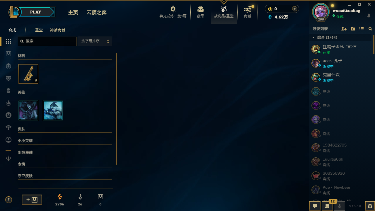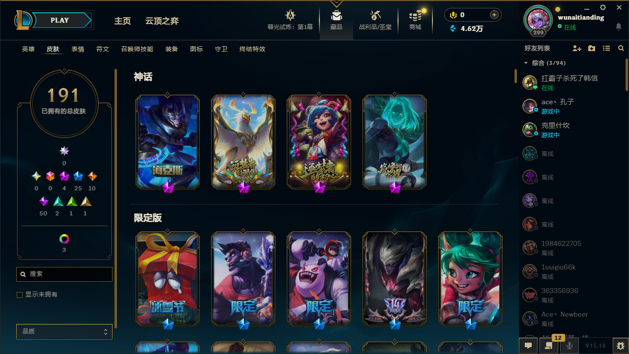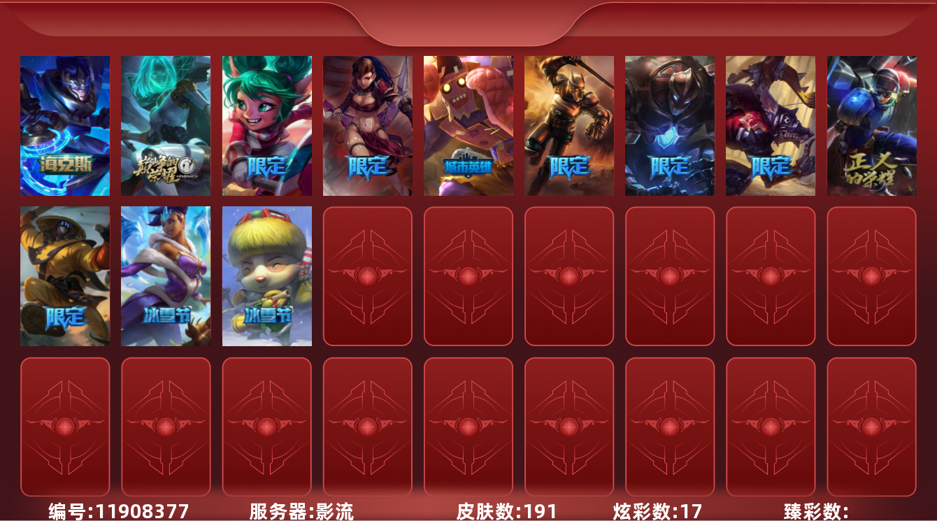 【10849876】[11908377]【gpz_959551】 t26949【影流】191皮肤 17炫彩 2臻彩 4神话/25限定/10传说/171英雄 账号等级:299【重要皮肤】海克斯科技嘉文四世 胜利女神奥莉安娜 胜利枪神卢锡安 胜利之剑亚托克斯 冬季仙境卡尔玛 圣诞糖果棒厄运小姐 SSW图奇 暗杀星蒙多 暗杀星努努和威朗普 防暴天使凯尔 鬼影森森茂凯 海贼瑞兹