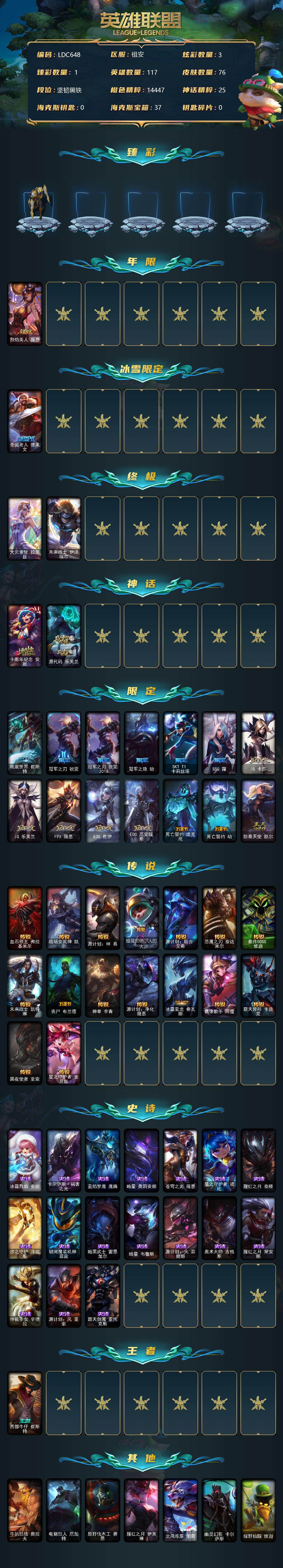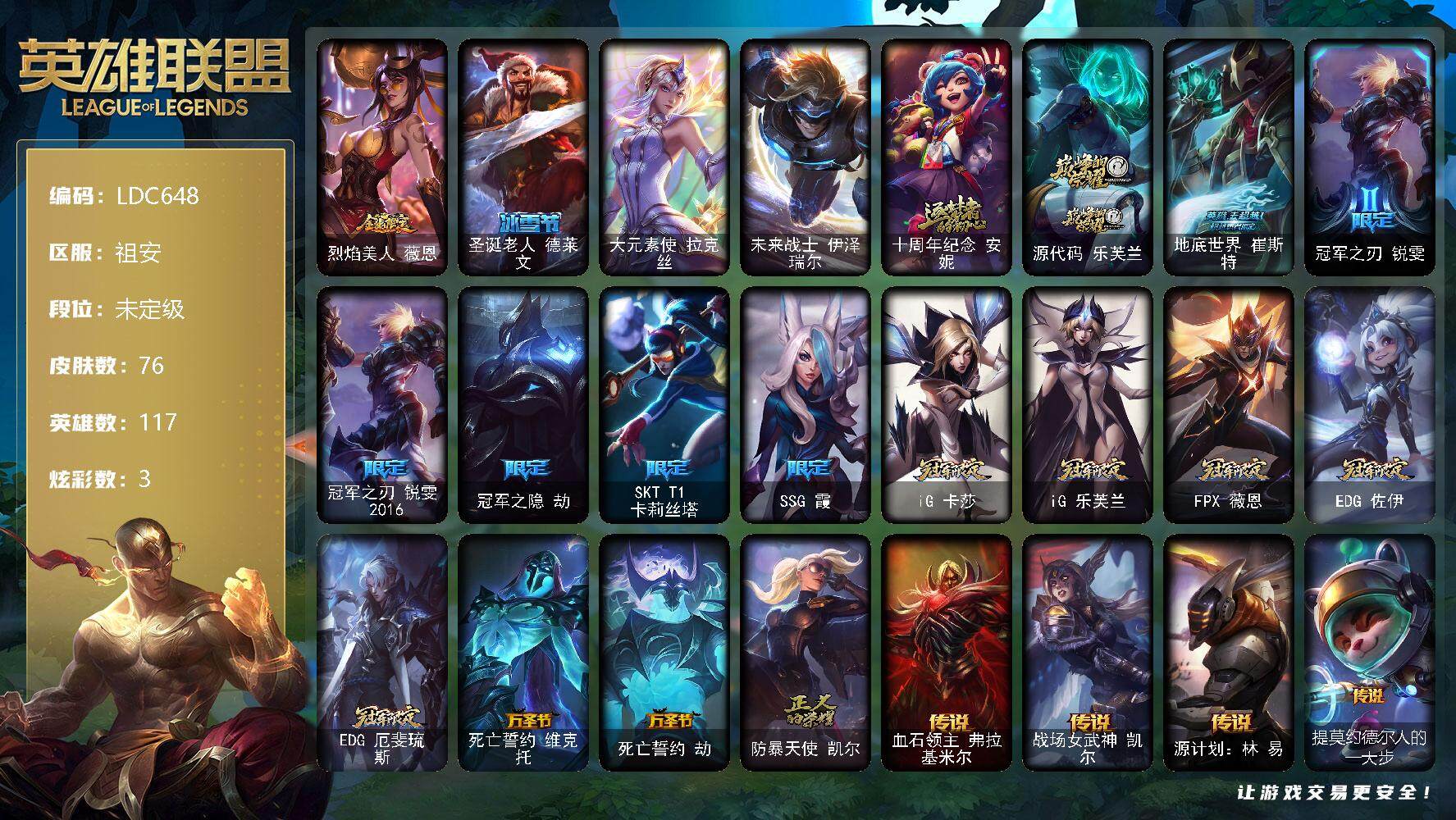 【10850408】【LDC648】117英雄/76皮肤/2终极/2神话/16限定/1臻彩/3炫彩/16传说/17史诗/未定级/冠军之隐劫凯旋圣装/烈焰美人薇恩/圣诞老人德莱文/大元素使拉克丝/未来战士伊泽瑞尔/十周年纪念安妮/源代码乐芙兰/地底世界崔斯特/冠军之刃锐雯/冠军之刃锐雯2018/冠军之隐劫/SKTT1卡莉丝塔/SSG霞/IG卡莎/IG乐芙兰/FPX薇恩/EDG佐伊/EDG厄斐琉斯/