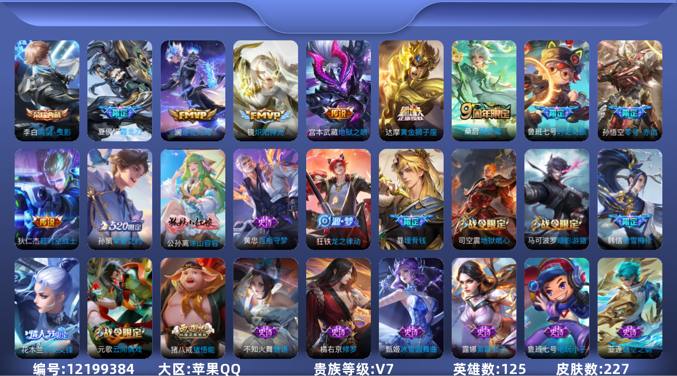 【10850414】【可二次】【QQ(苹果)】御旌 弈星混沌棋 大漠名商 不知火舞 嬴政 炽阳神光 暗影游猎 地狱之眼 原初探秘者 韩信 沙漠行僧 演武夺筹 紫霞仙子 傲雪梅枪 驱傩正仪 挚爱之约 黄金狮子座 娜可露露 万华元夜 御銮 天狼溯光者 狂想玩偶喵 霜北刀 艾琳 疑决卦 醍醐杖 橘右京 超时空战士 古海寻踪 零号·赤焰 赵云 鸣剑·曳影 云间偶戏 梁祝 探海日记 赏金猎手 逐花归海 李
