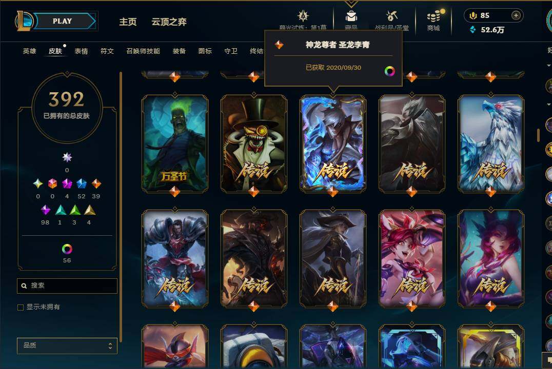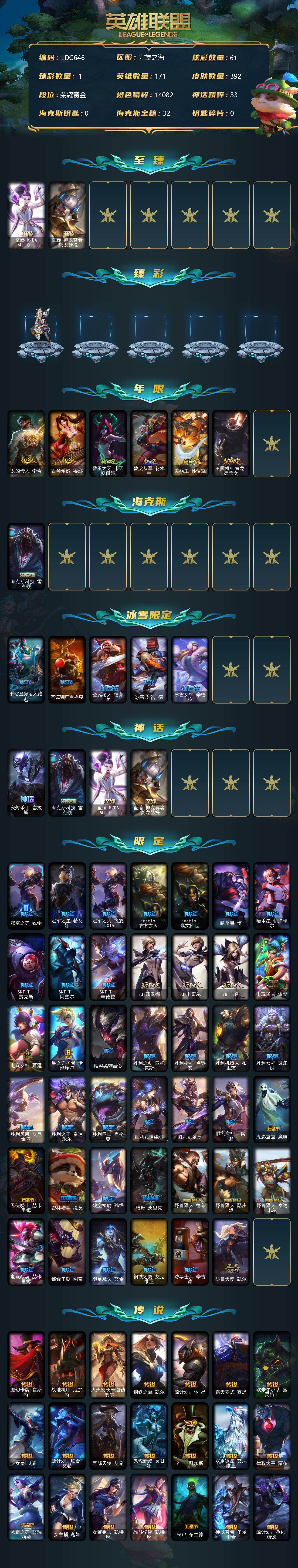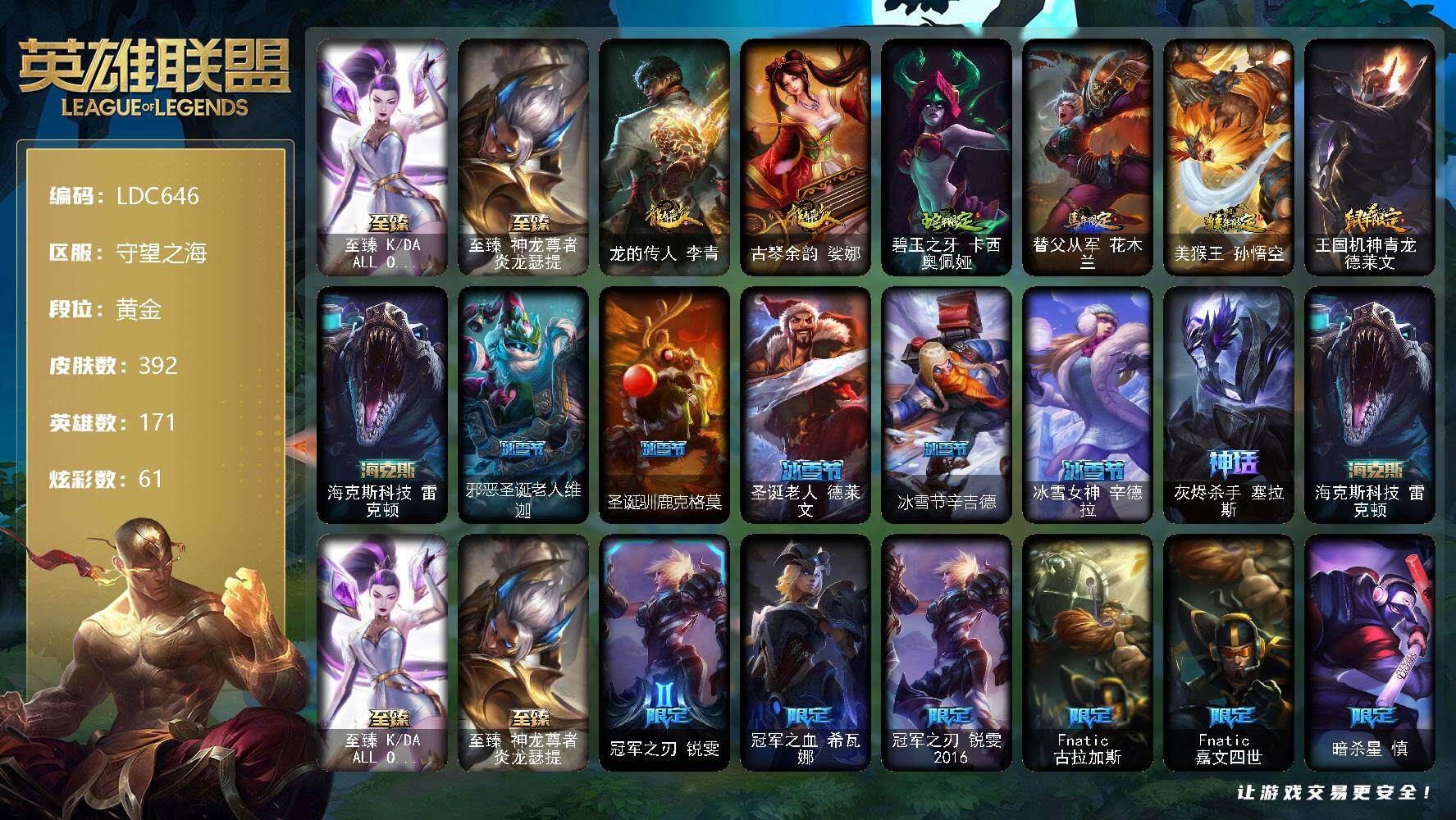 【10850426】【LDC646】171英雄/392皮肤/4神话/52限定/1臻彩/61炫彩/39传说/98史诗/黄金账号等级:889/至臻K/DAALLOUT卡莎/至臻神龙尊者炎龙瑟提/咖啡甜心金克丝核桃巴菲/龙的传人李青/古琴余韵娑娜/碧玉之牙卡西奥佩娅/替父从军花木兰/美猴王孙悟空/王国机神青龙德莱文/海克斯科技雷克顿/邪恶圣诞老人维迦/圣诞驯鹿克格莫/圣诞老人德莱文/冰雪节辛吉德/冰雪