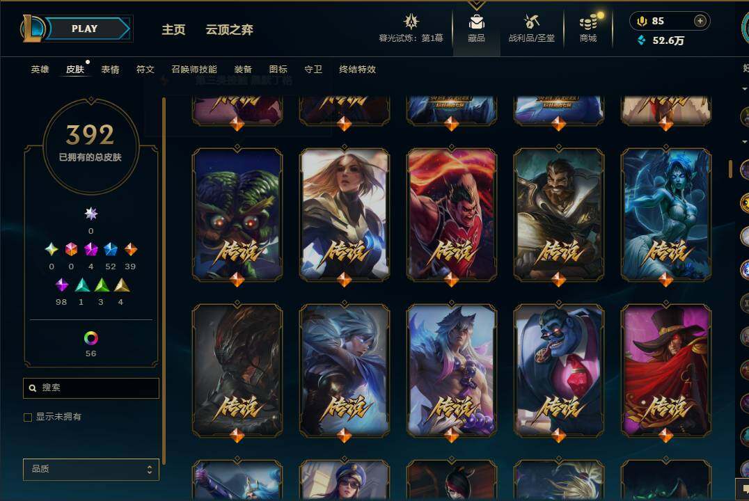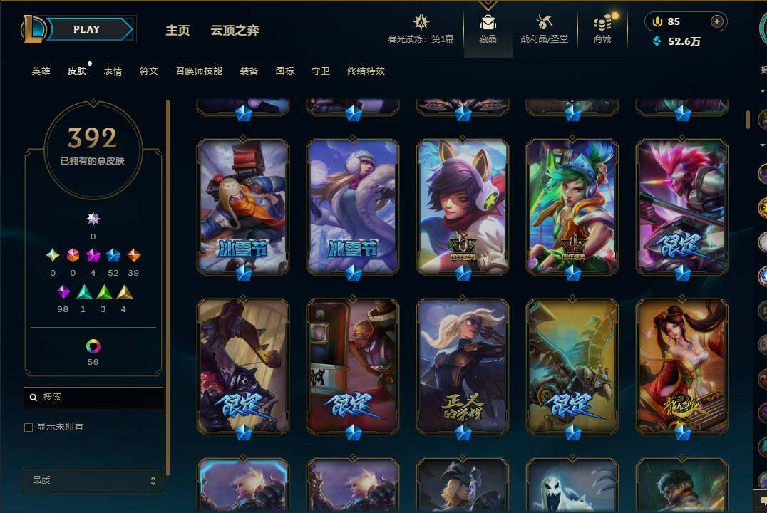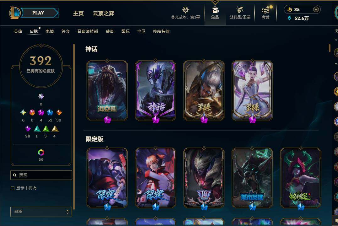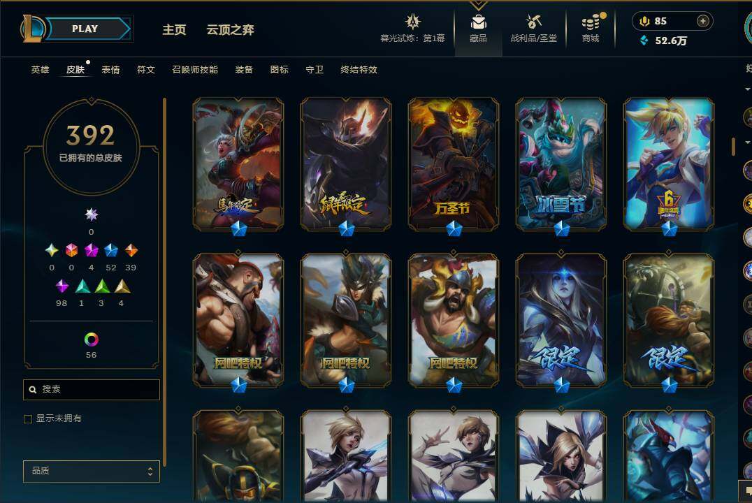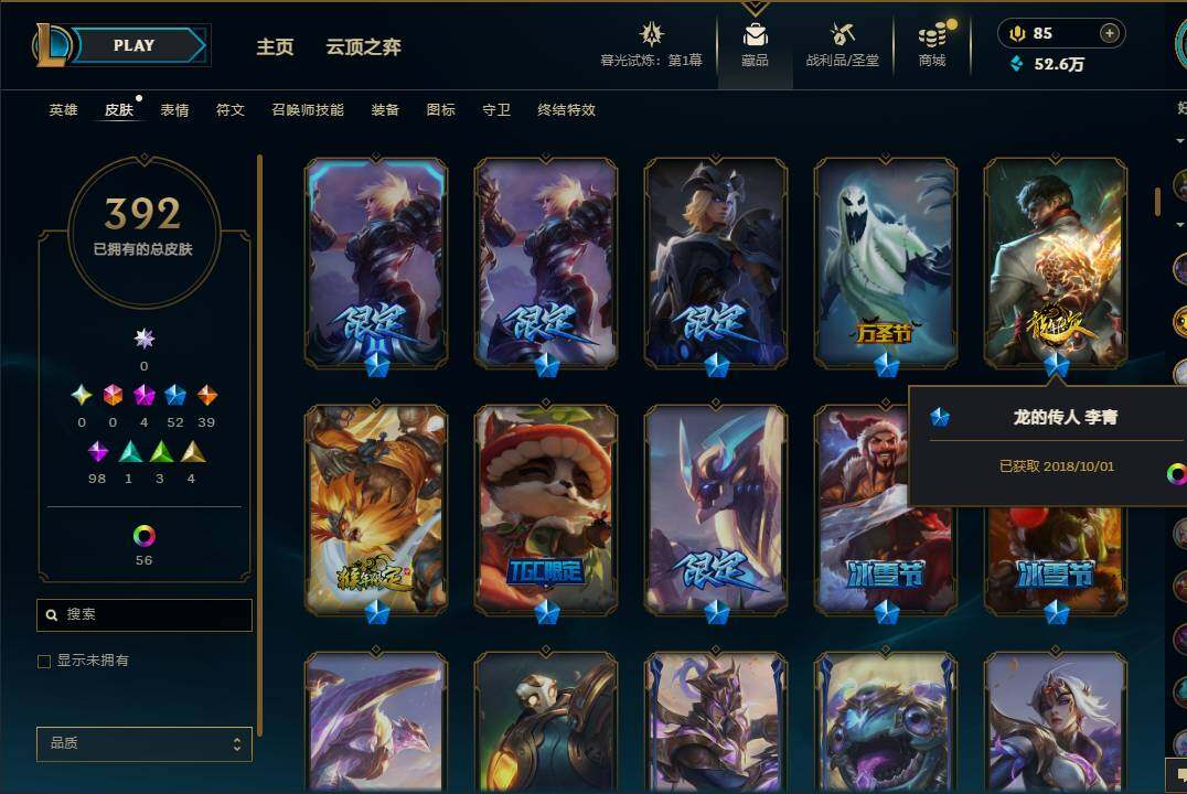 【10850426】【LDC646】171英雄/392皮肤/4神话/52限定/1臻彩/61炫彩/39传说/98史诗/黄金账号等级:889/至臻K/DAALLOUT卡莎/至臻神龙尊者炎龙瑟提/咖啡甜心金克丝核桃巴菲/龙的传人李青/古琴余韵娑娜/碧玉之牙卡西奥佩娅/替父从军花木兰/美猴王孙悟空/王国机神青龙德莱文/海克斯科技雷克顿/邪恶圣诞老人维迦/圣诞驯鹿克格莫/圣诞老人德莱文/冰雪节辛吉德/冰雪
