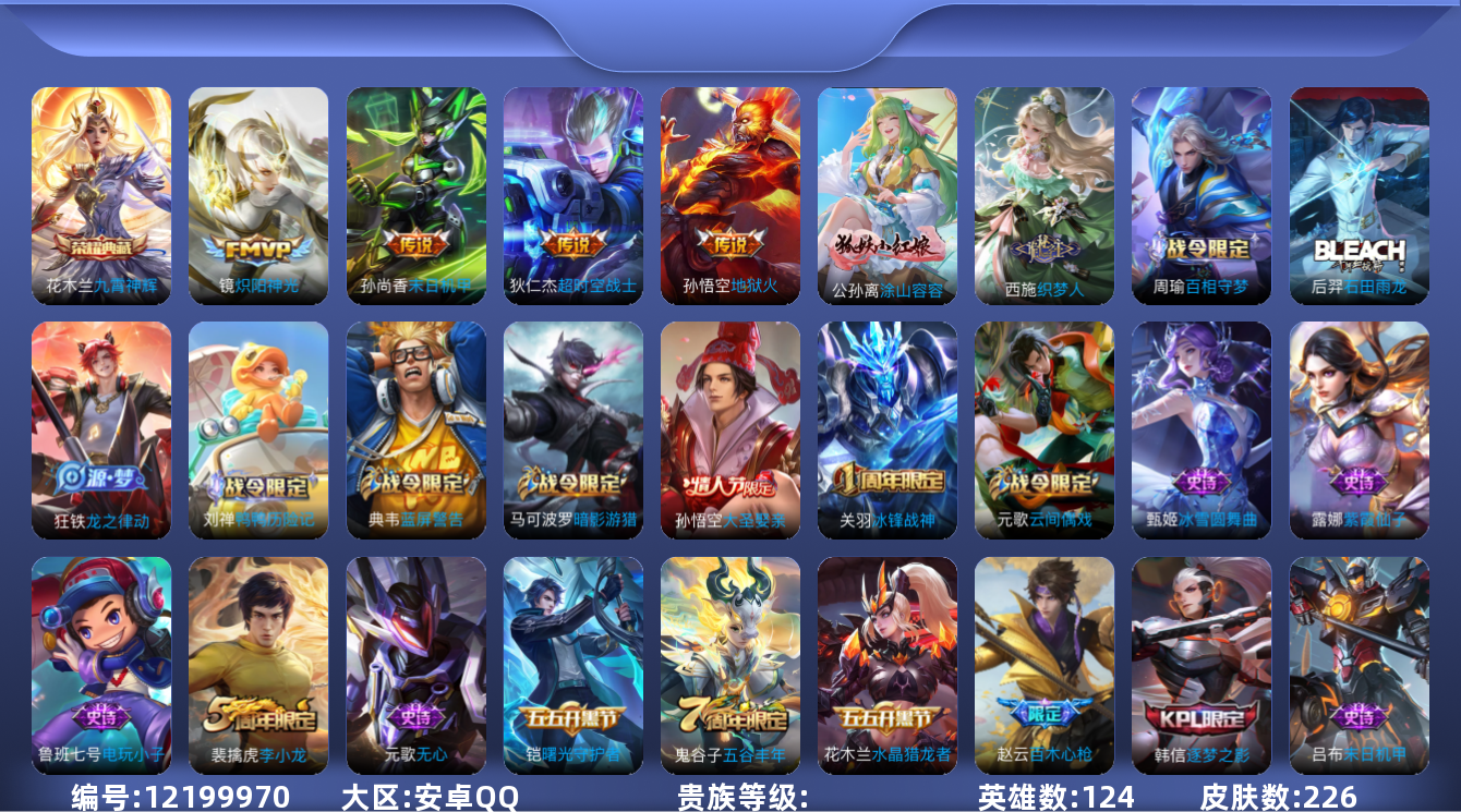 【10850545】【可二次】【QQ(安卓)】御旌 弈星混沌棋 大漠名商 不知火舞 嬴政 大圣娶亲 炽阳神光 暗影游猎 遇见飞天 原初探秘者 韩信 擒涛扼浪 沙漠行僧 演武夺筹 紫霞仙子 御霄 驱傩正仪 朔风刀 逐梦之影 海盐诗旅 九霄神辉 娜可露露 万华元夜 地狱火 高山流水 御狮 御銮 末日机甲 狂想玩偶喵 艾琳 疑决卦 醍醐杖 蓝屏警告 橘右京 超时空战士 古海寻踪 赵云 云间偶戏 无心