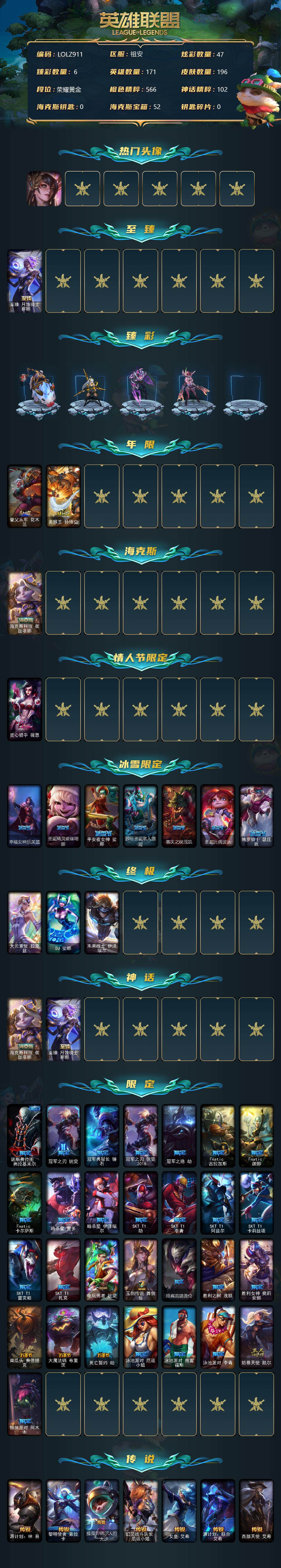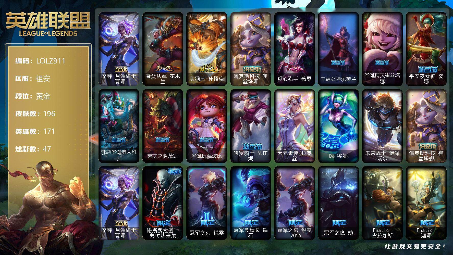 【10850946】【LOLZ911】171英雄/196皮肤/3终极/2神话/39限定/6臻彩/47炫彩/26传说/45史诗/黄金/玉剑传说舞剑仙/至臻月蚀骑士赛娜/无畏骑士瑟庄妮赤子初心/玉剑传说舞剑仙轩辕/天煞劫恒星游历者/破败军团厄运小姐灵岛征伐使/魔女阿卡丽虚荣/红莲之刃锐雯/替父从军花木兰/美猴王孙悟空/海克斯科技崔丝塔娜/觅心猎手薇恩/幸福女神乐芙兰/圣诞精灵崔丝塔娜/平安夜女神娑娜