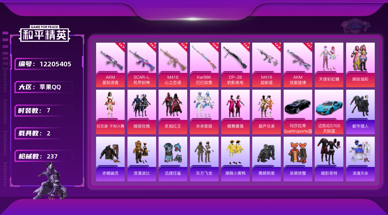 【10852180】【不可二次】【苹果QQ】龟仙人 AKM-星际浪客 漫步者 都市猎人 炙焰红王 M24-奇异狩猎者 东方飞龙 极速红龙 汤姆逊-林间仙鹿 赤蝎幽灵 葫芦兄弟 梦起落英 SCAR-L-机甲封神 Mini14-林间仙鹿 蝶舞蔷薇 MK47-林间仙鹿 M416-心之恋语 缤纷油彩 浪漫波比 瑞龙福将 激萌小黄鸭 AWM-激战未来 M416-超新星 浪漫天命 镜光幻境飞行翼 纯白誓言