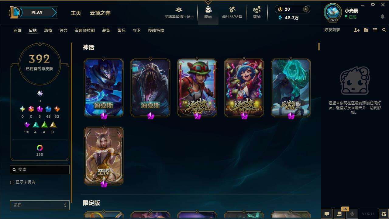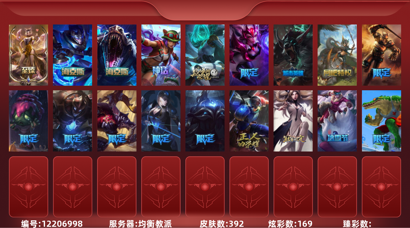 【10852467】[12206998]【gpz_961126】 t24583【均衡教派】392皮肤 169炫彩 8臻彩 6神话/48限定/32传说/171英雄 账号等级:761 单双排段位:华贵铂金 【重要头像】星守阿狸 救生圈 美猴王孙悟空 【重要皮肤】KDA阿狸至臻 海克斯科技雷克顿 海克斯科技嘉文四世 胜利剑圣易 胜利女神娑娜 胜利女神希维尔 胜利巨口克格莫 钢铁军团拉克丝 荣誉使者玛