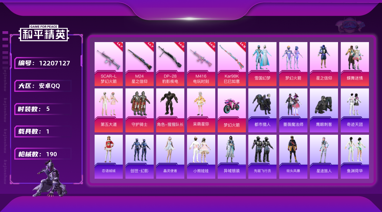 【10852494】【不可二次】【安卓QQ】星之信仰 SCAR-L-梦幻火箭 龟仙人 双人摩托梦幻火箭 雪国梦幻 都市猎人 M24-奇异狩猎者 SCAR-L梦幻火箭 黑色刀锋 春暖花开飞行器 M416-电玩时刻 雪国幻梦 梦幻火箭 守护骑士 蝶舞迷情 M24-星之信仰 梦幻火箭飞行器 雪山精英 星之信仰飞行翼