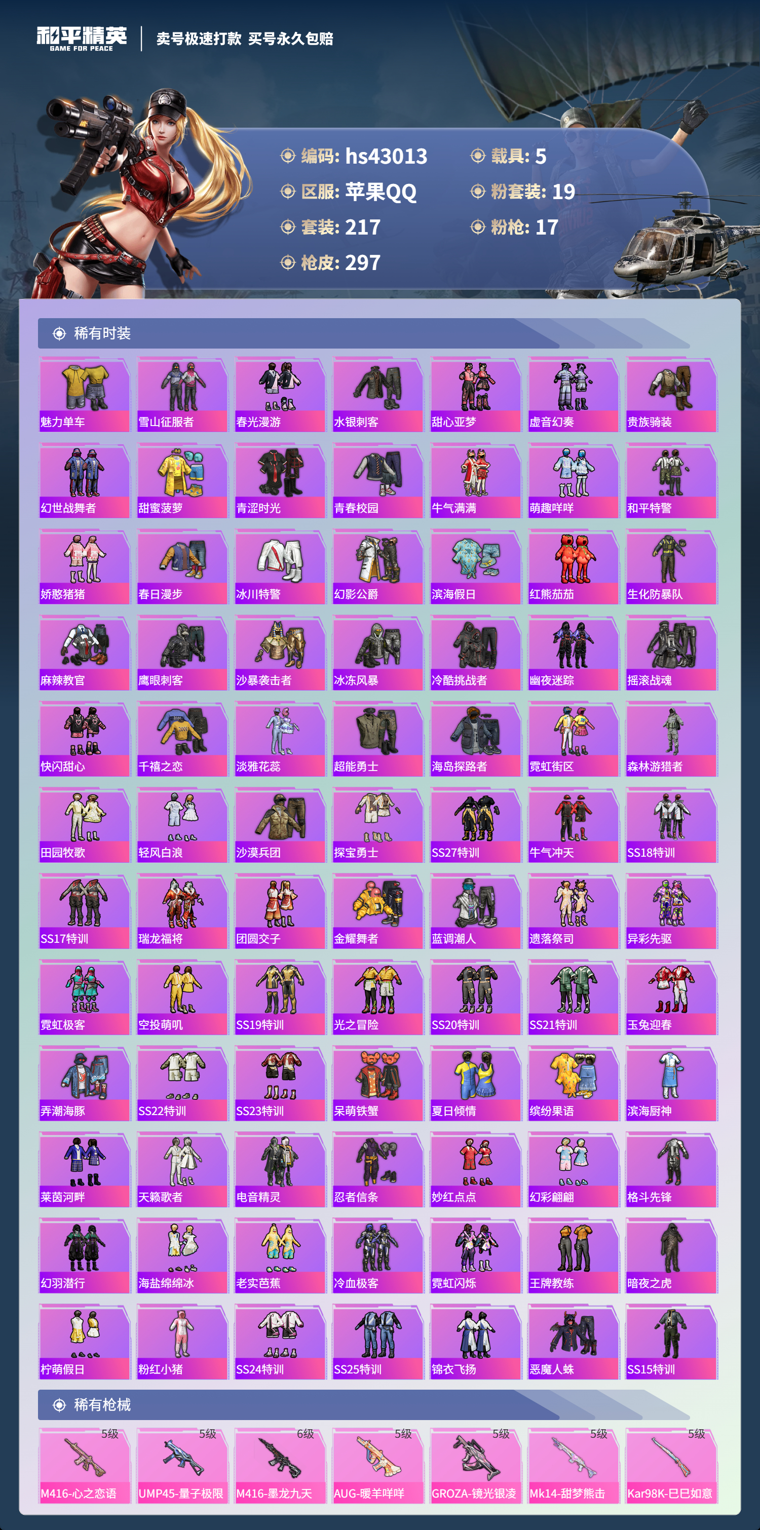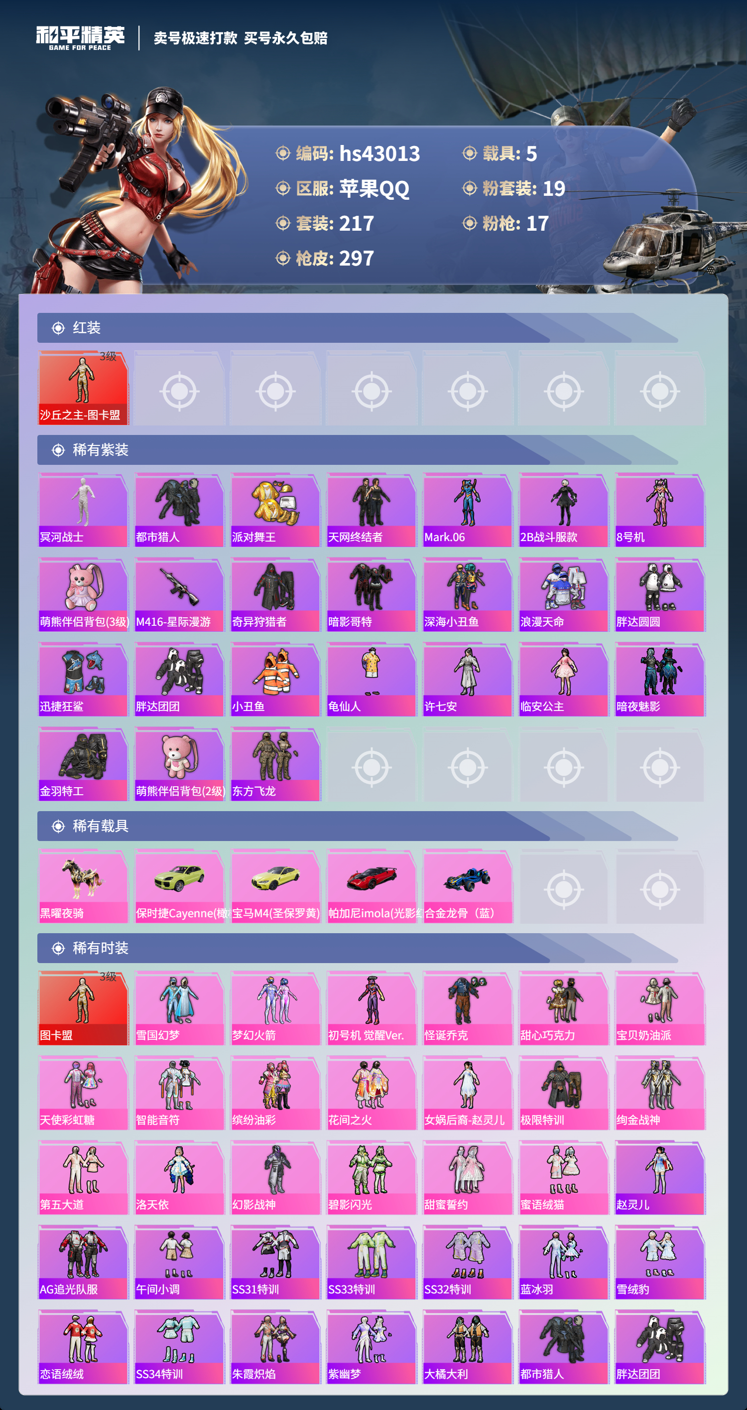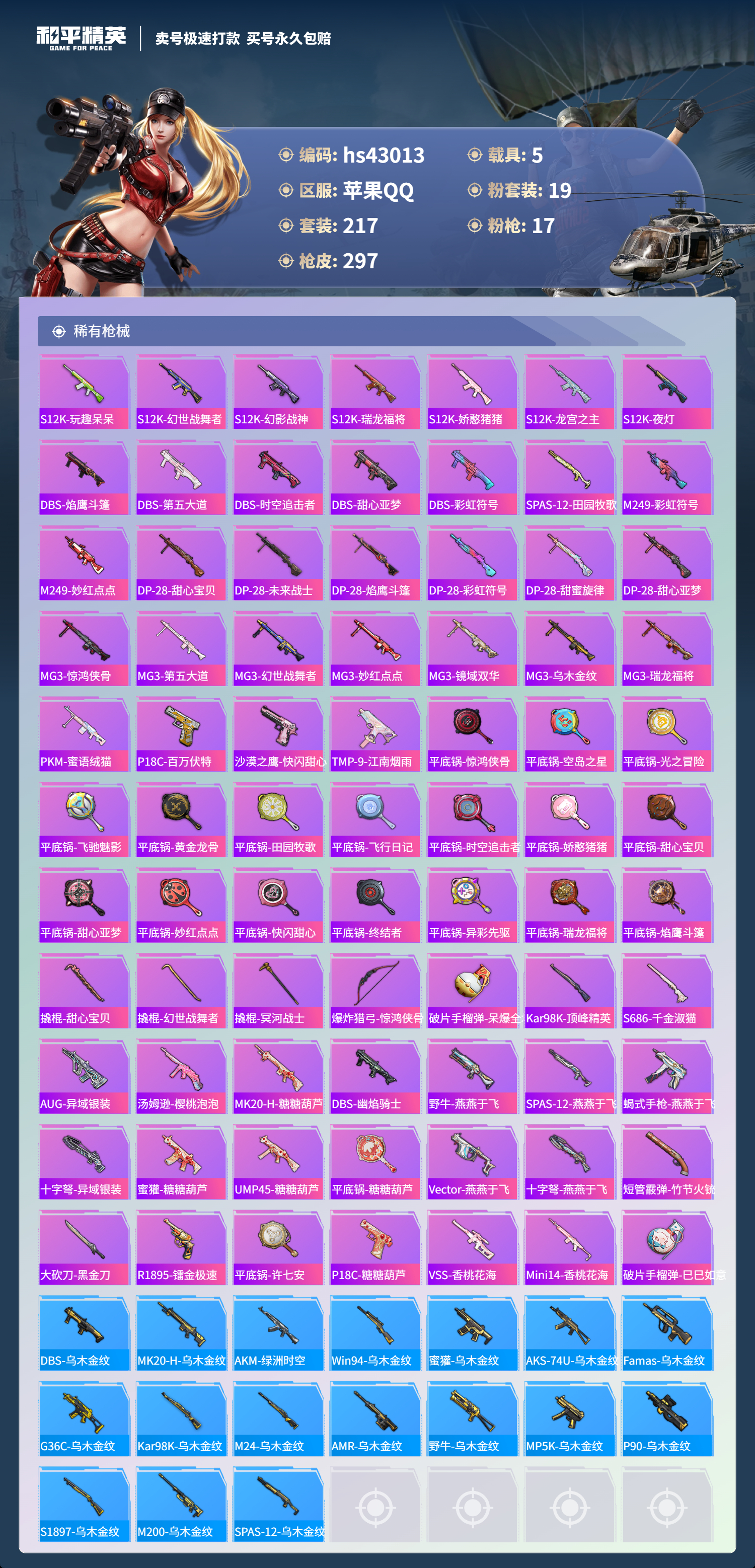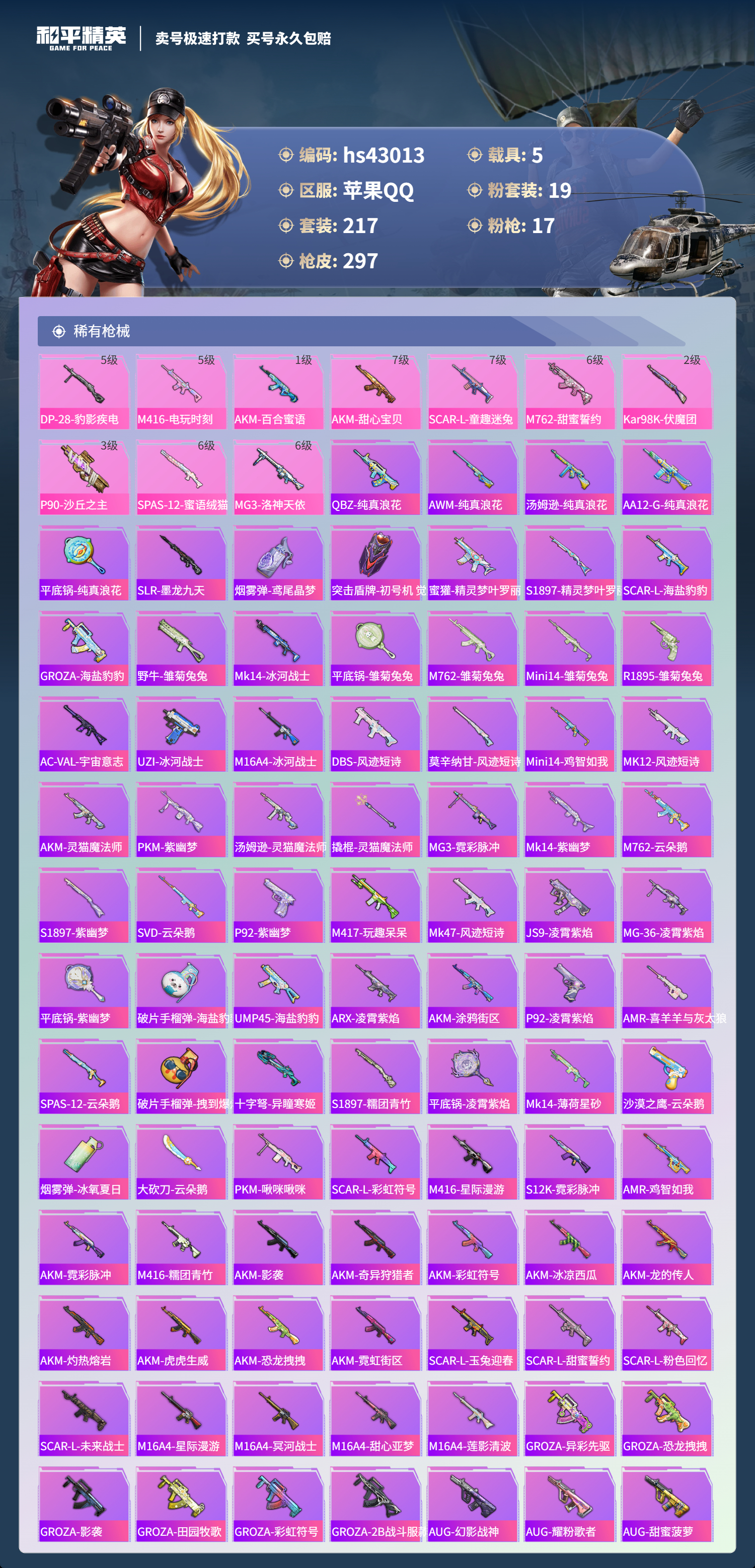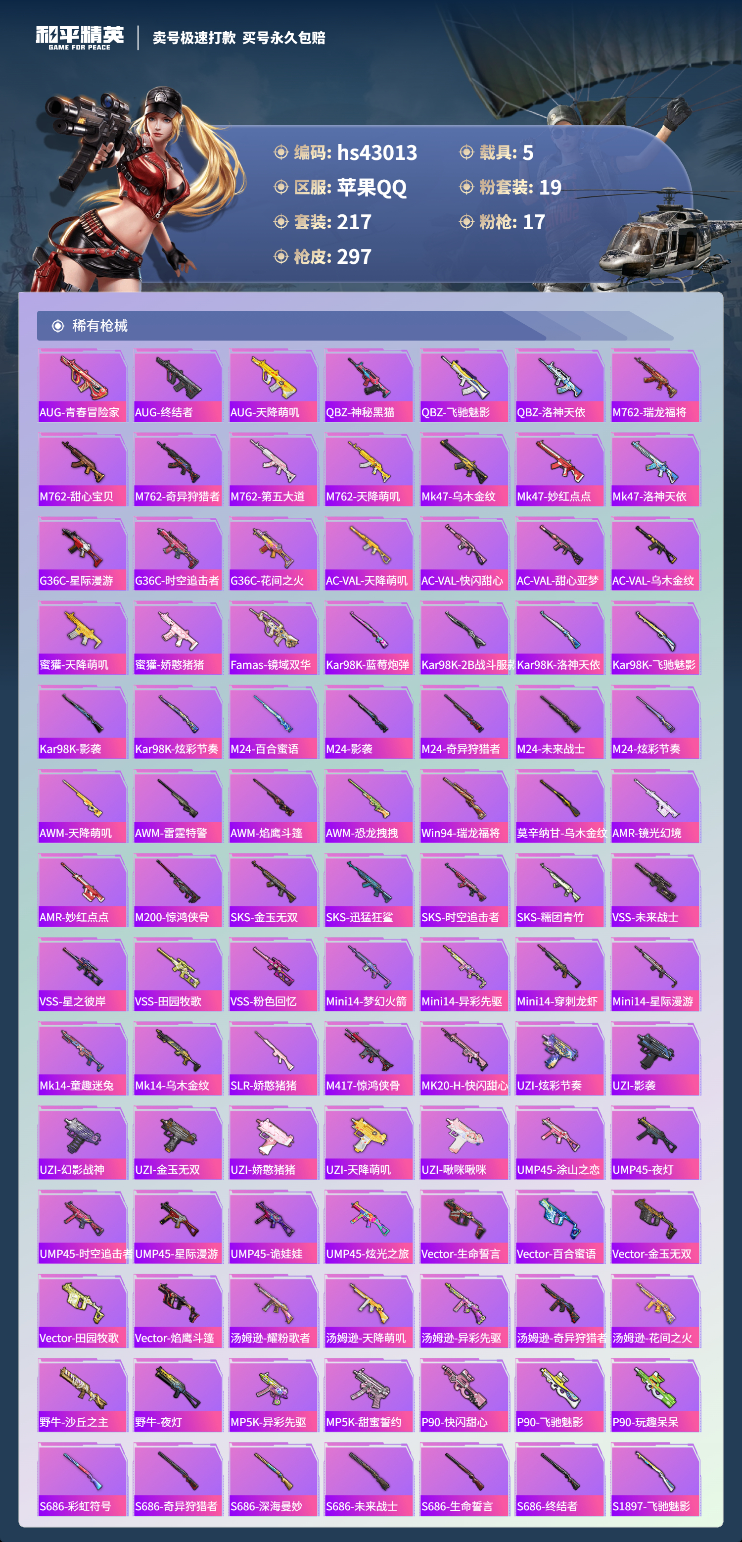 【10852499】【不可二次】【苹果QQ】合金龙骨蓝色 M762-甜蜜誓约 龟仙人 水银刺客 漫步者 M416-星际漫游 花间之火 都市猎人 豚鼠丹丹 忍者信条 M762-奇异狩猎者 沙丘之主-图卡盟 UMP45-量子极限 M416-心之恋语 缤纷油彩 深海小丑鱼 碧影闪光 SCAR-童趣迷兔 智能音符 Kar98K-伏魔团 AKM-甜心宝贝 纯白誓言 AKM-奇异狩猎者 怪诞乔克 迅捷狂鲨
