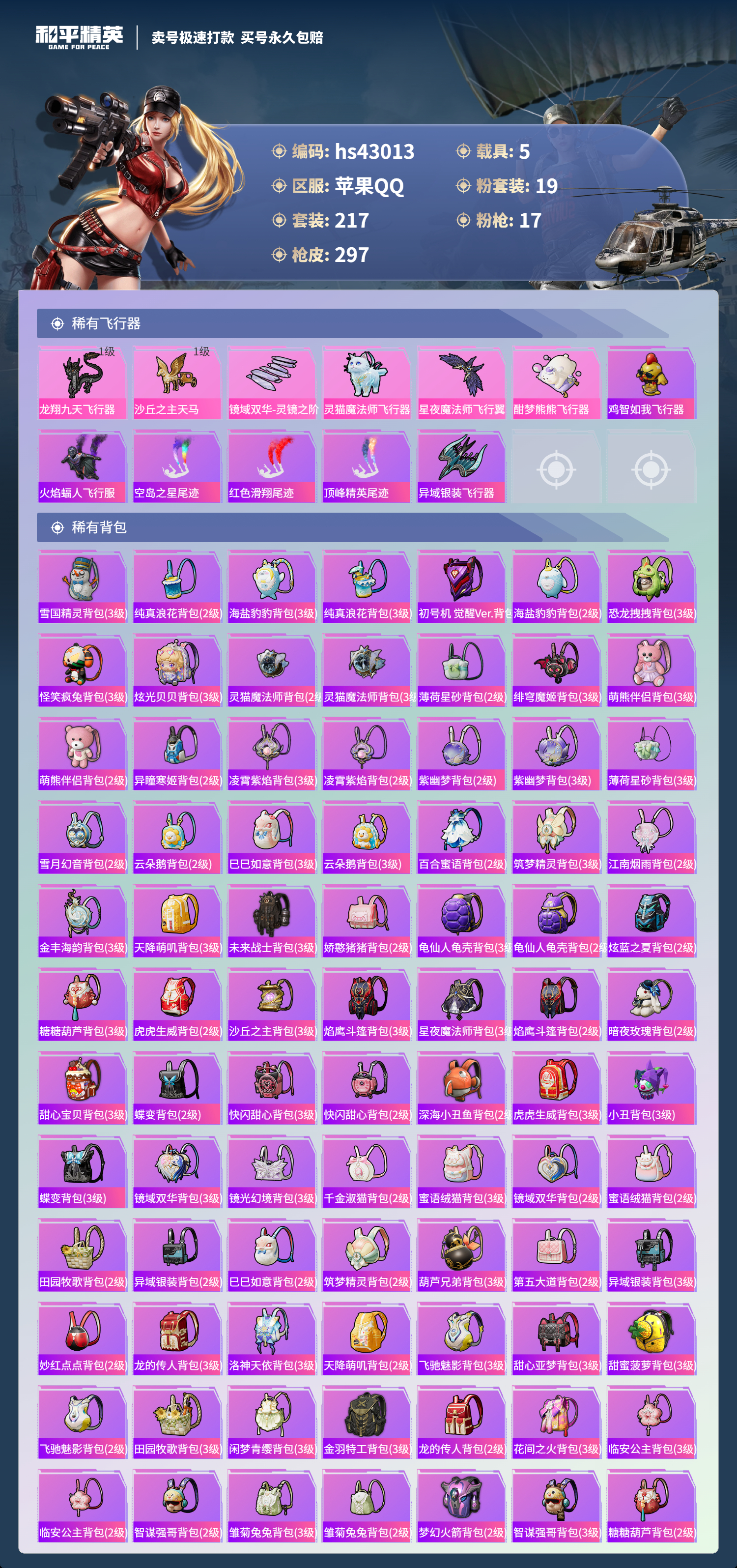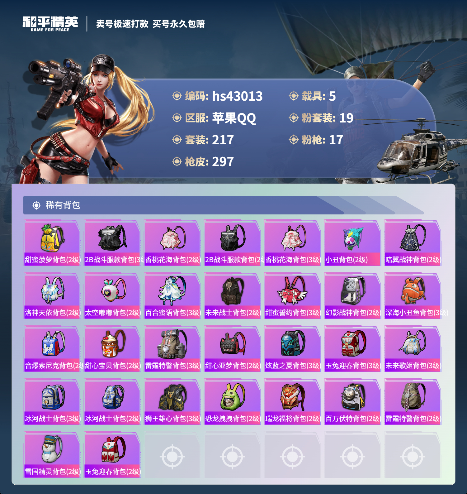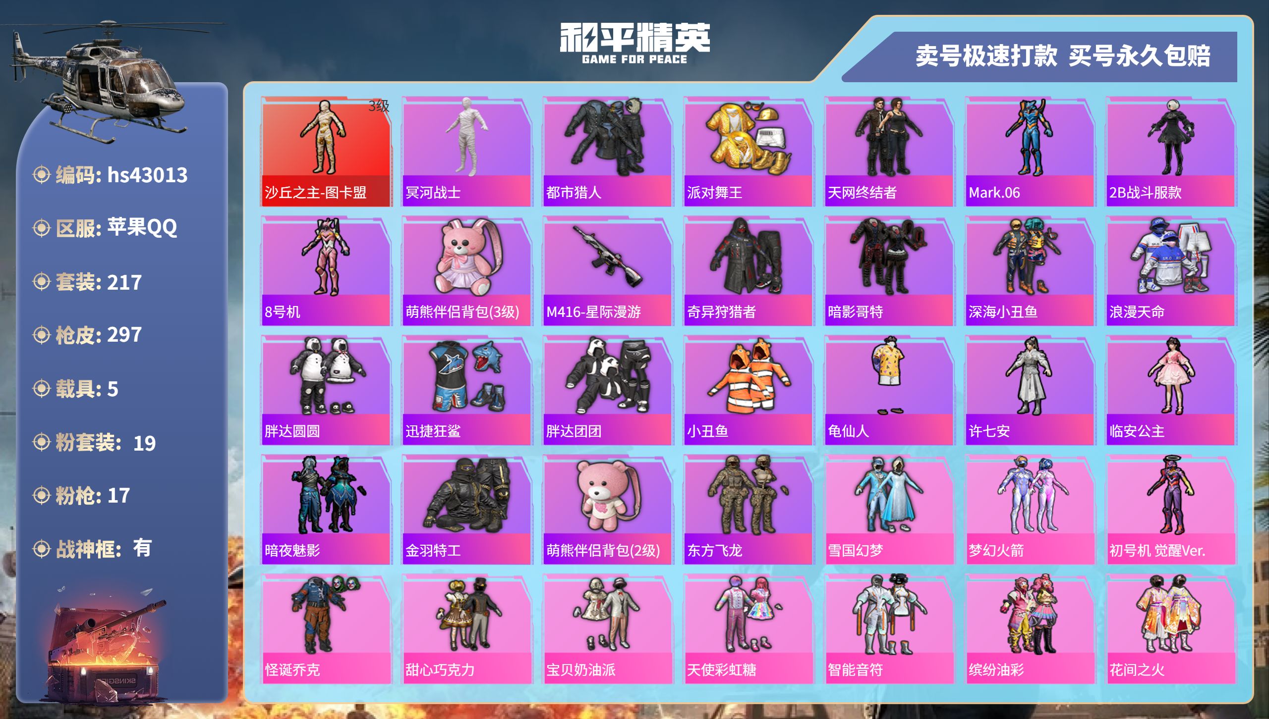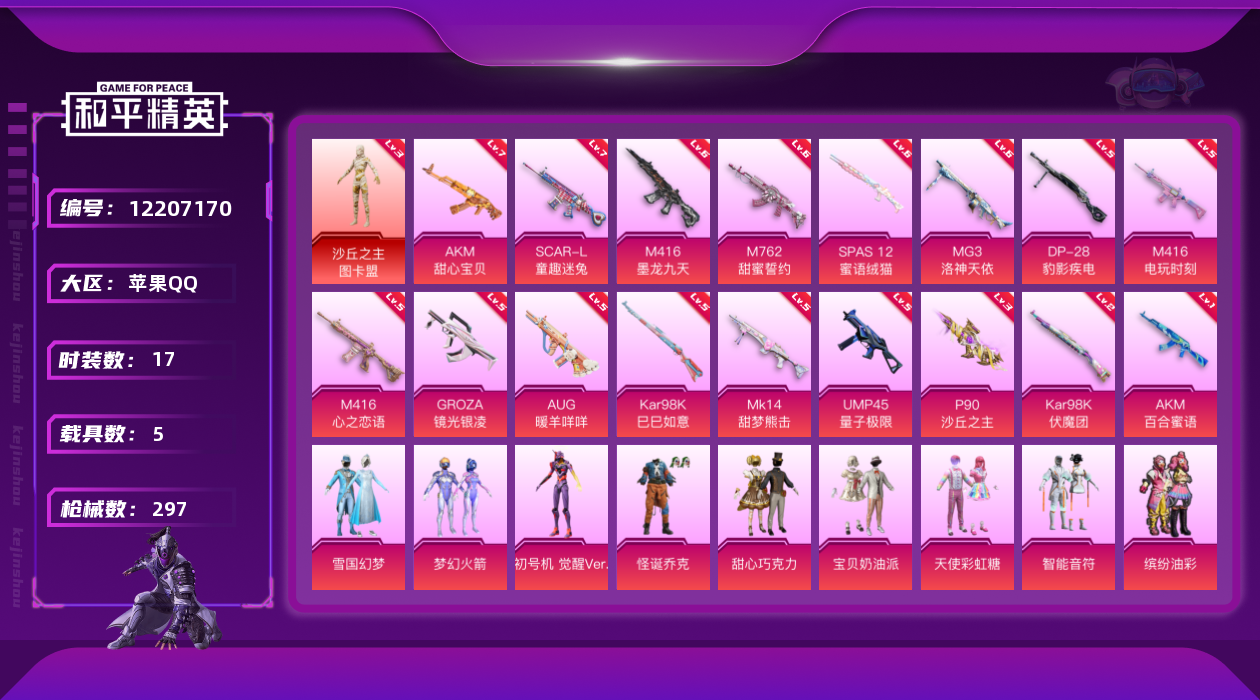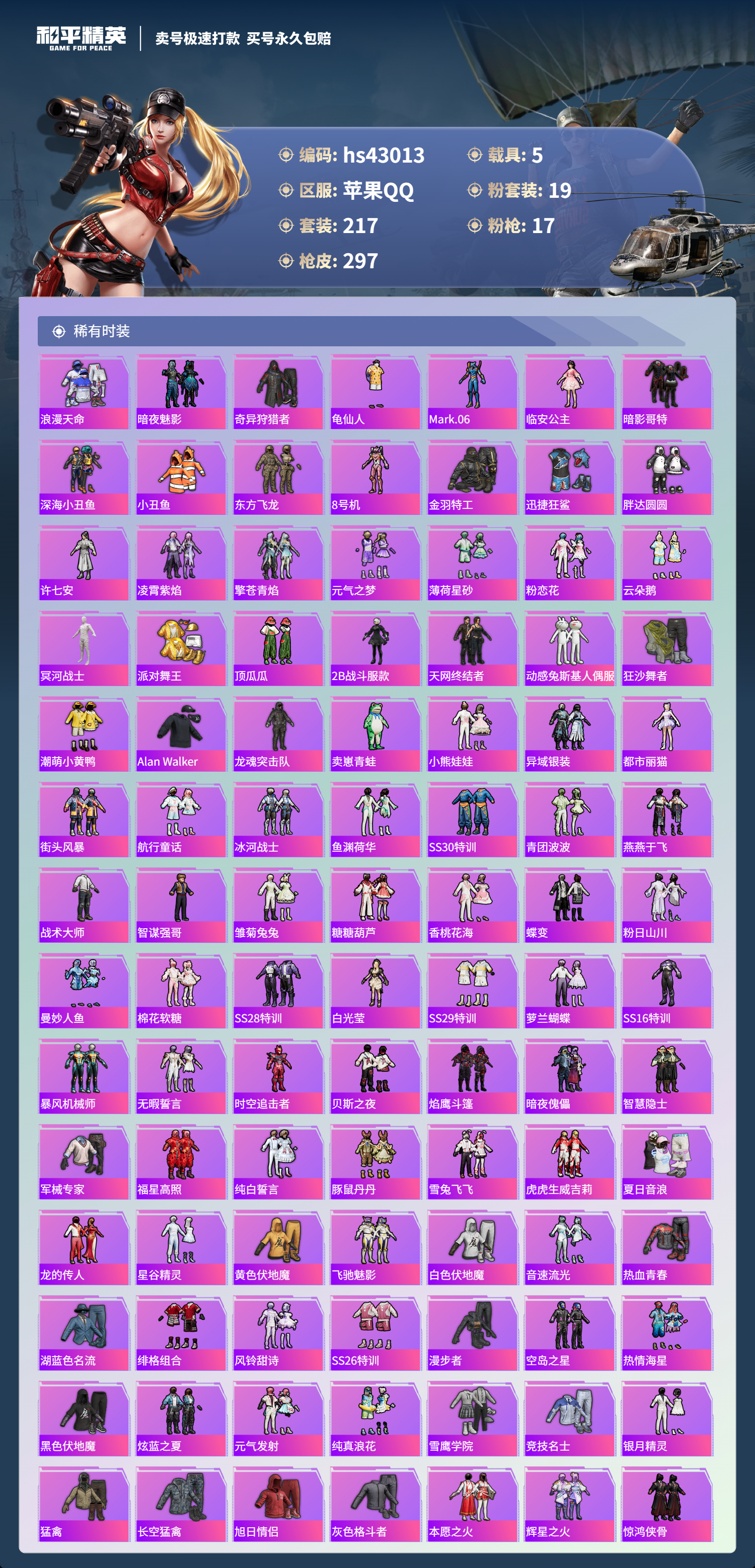 【10852499】【不可二次】【苹果QQ】合金龙骨蓝色 M762-甜蜜誓约 龟仙人 水银刺客 漫步者 M416-星际漫游 花间之火 都市猎人 豚鼠丹丹 忍者信条 M762-奇异狩猎者 沙丘之主-图卡盟 UMP45-量子极限 M416-心之恋语 缤纷油彩 深海小丑鱼 碧影闪光 SCAR-童趣迷兔 智能音符 Kar98K-伏魔团 AKM-甜心宝贝 纯白誓言 AKM-奇异狩猎者 怪诞乔克 迅捷狂鲨